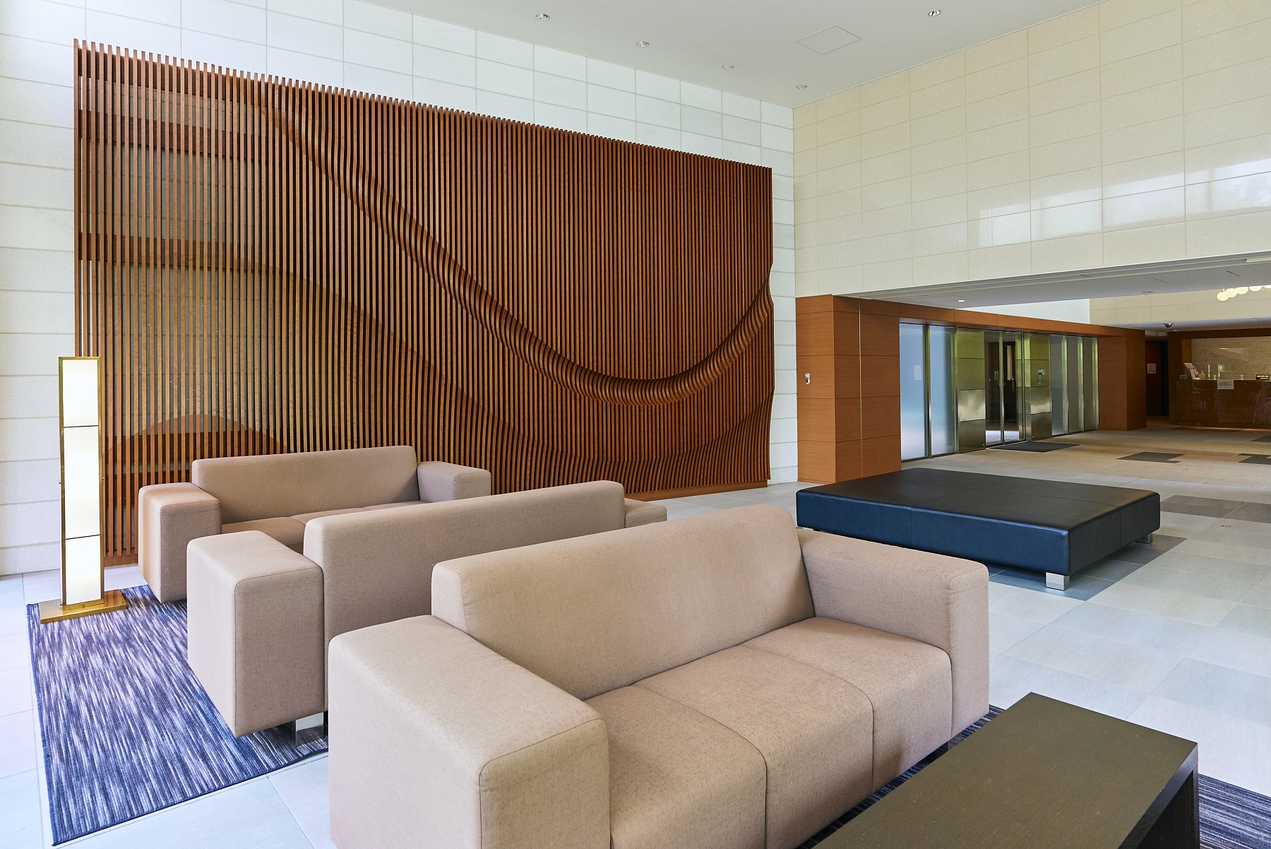 壁にあしらった木のルーバーは、桜並木のイメージからチェリーの色合いに。さらにルーバーの合間に見える壁面素材の石の輝きは川面の煌めきを表現。波打つデザインは目黒川の流れをモチーフに描いています。