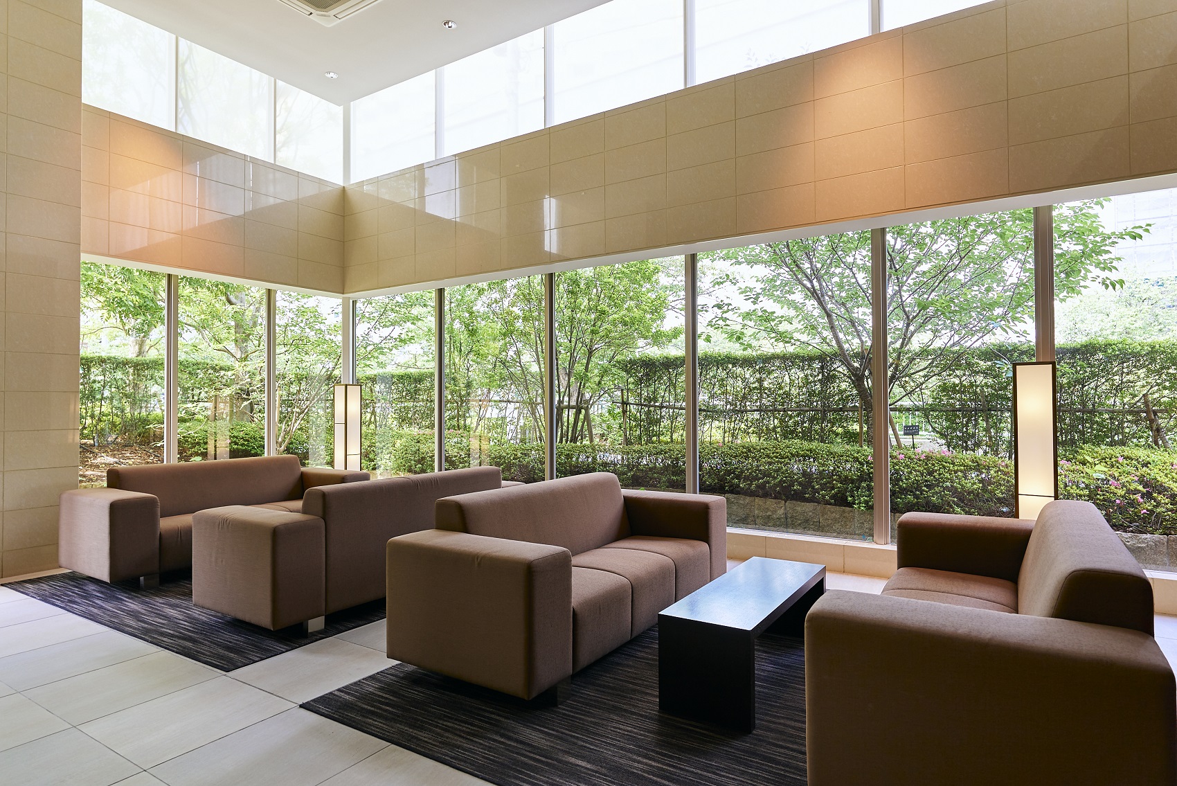 ガラスを張り巡らせた2層吹き抜けの空間。窓に映るのは、色鮮やかな桜並木。落ち着きを深めるカーペットを敷き、ゆっくりとくつろげるようソファが設けられています。