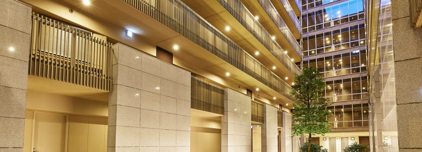 都心の喧噪から徐々に離れ、目黒川沿いに連なる桜並木の木漏れ日の中をゆっくりと歩く帰り道。その心地よい余韻は、建物の内部まで続く——。共用空間には、周辺の自然から導かれた美意識が宿っています。