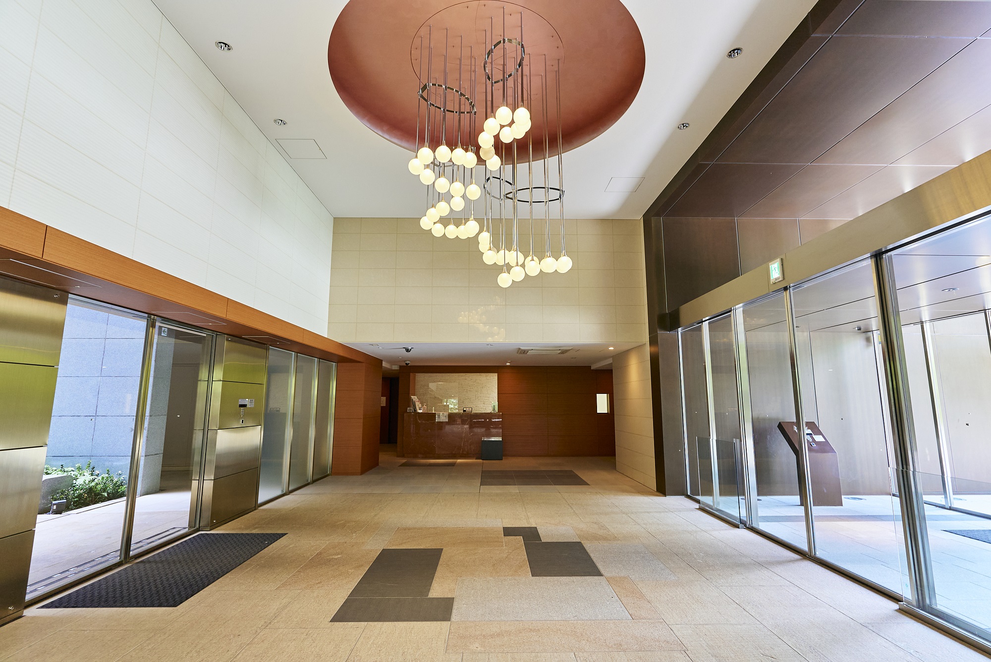 エントランスホールも2 層吹抜けの空間。天井にはシャンデリアが輝きます。コンシェルジュデスクが設置されており、大理石でしつらえたカウンターや華やかさを備えた石貼りの壁も空間美を高めています。