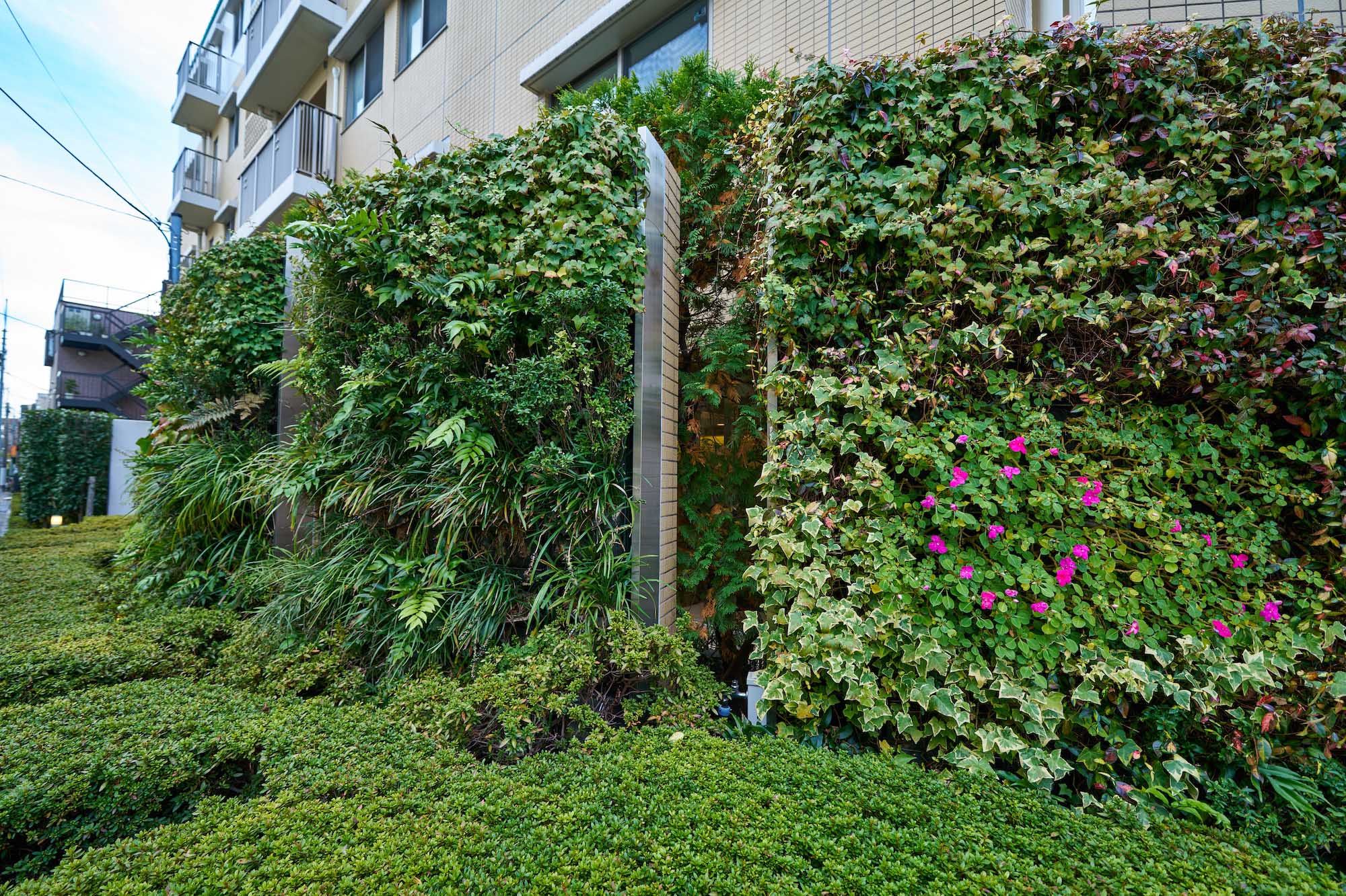お客様を迎え入れるようなコの字型のフォルムが特徴的な外観。柔らかさや優しさを感じさせる暖色系のタイルを中心としたファサードには、潤い豊かな植栽が調和。ここに住まうことが誇らしくなるような、洗練された外観デザインです。エントランス回りには、季節に応じたマンションの顔を演出するネイチャーウォール(壁面緑化)を設置。住まいに心地よい癒しを醸成し、彩りのある都市型マンションがデザインされています。