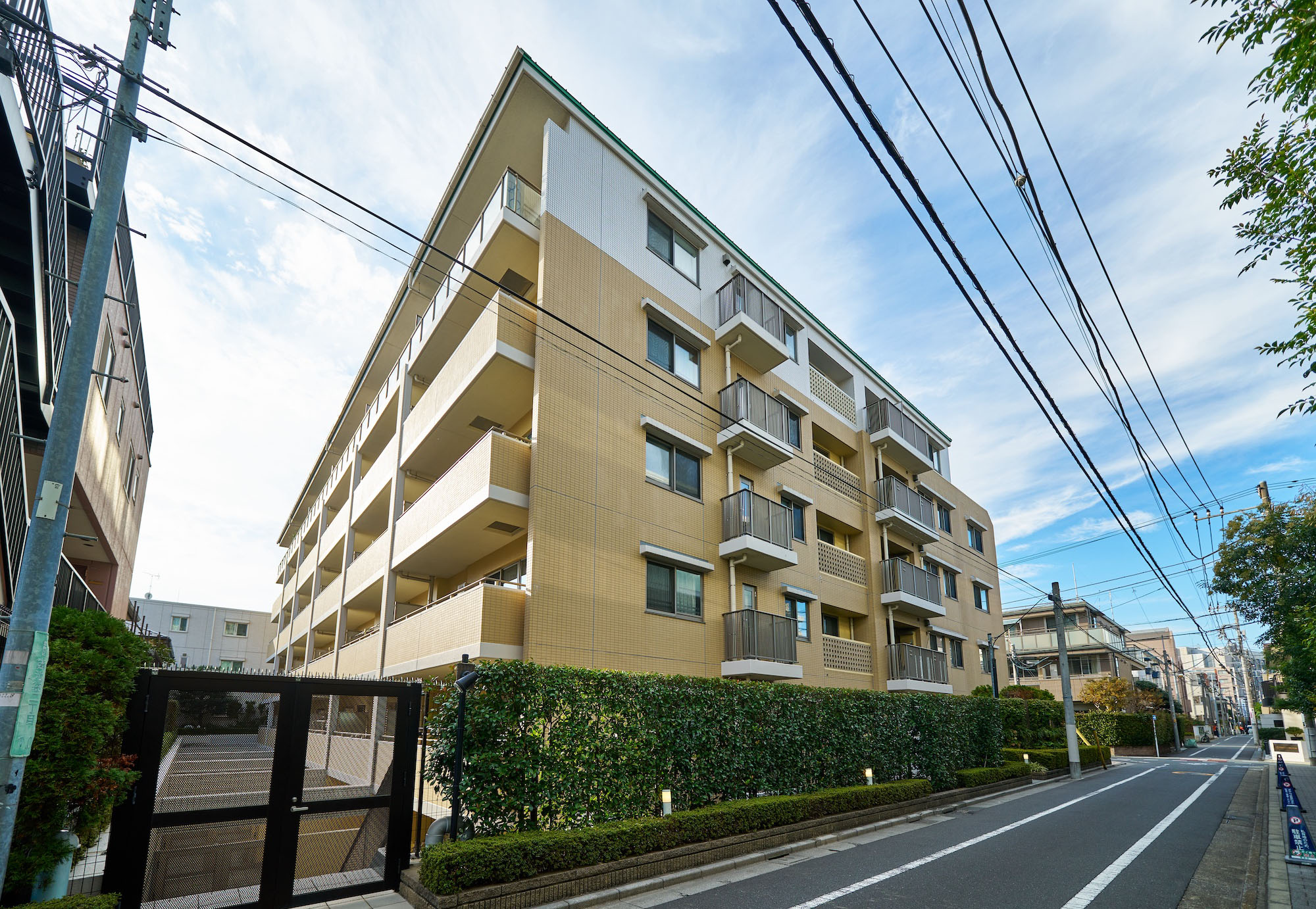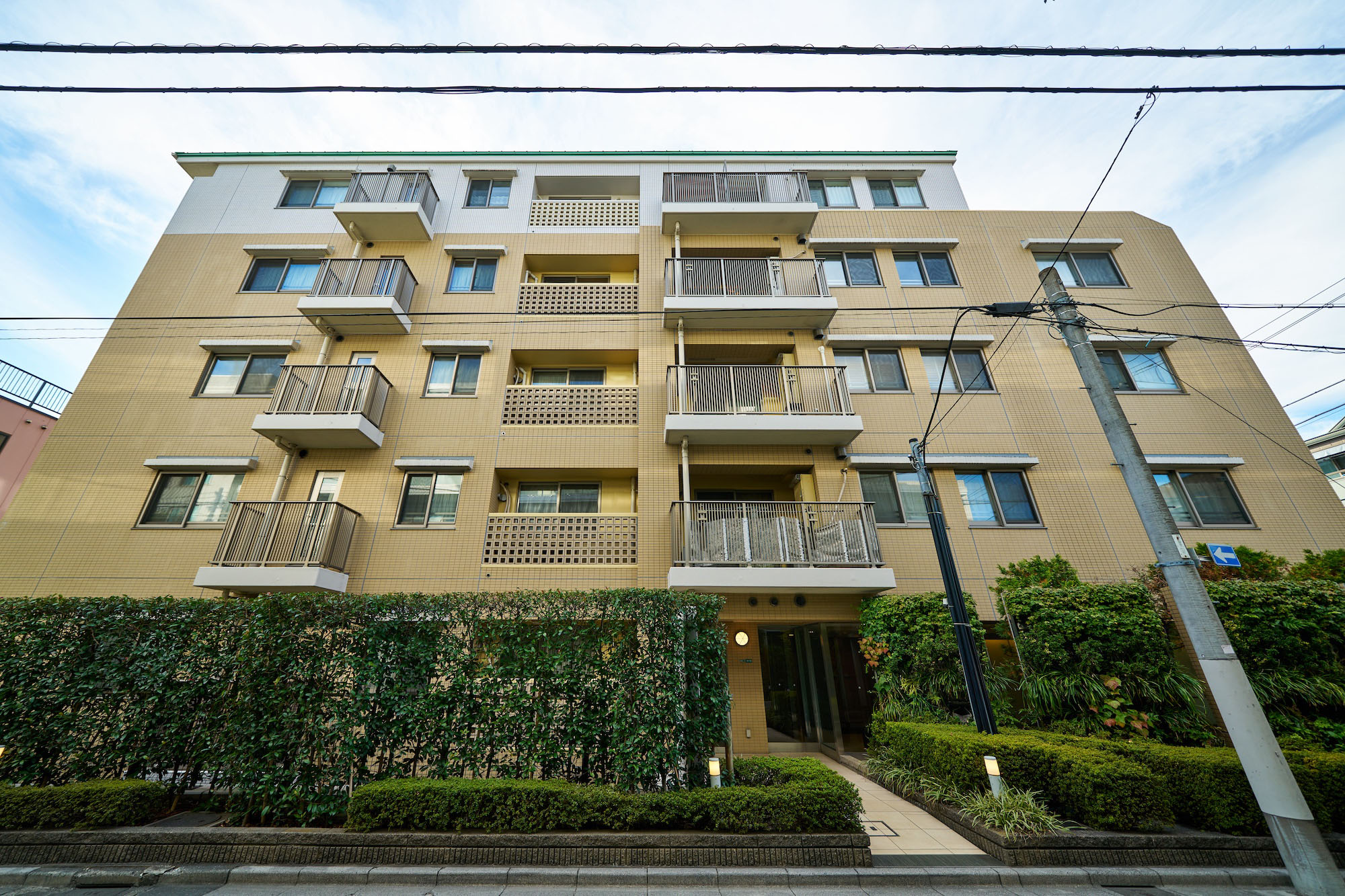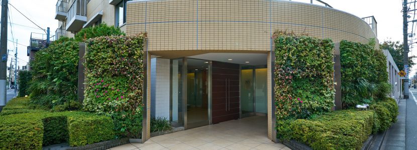 お客様を迎え入れるようなコの字型のフォルムが特徴的な外観。柔らかさや優しさを感じさせる暖色系のタイルを中心としたファサードには、潤い豊かな植栽が調和。ここに住まうことが誇らしくなるような、洗練された外観デザインです。エントランス回りには、季節に応じたマンションの顔を演出するネイチャーウォール(壁面緑化)を設置。住まいに心地よい癒しを醸成し、彩りのある都市型マンションがデザインされています。