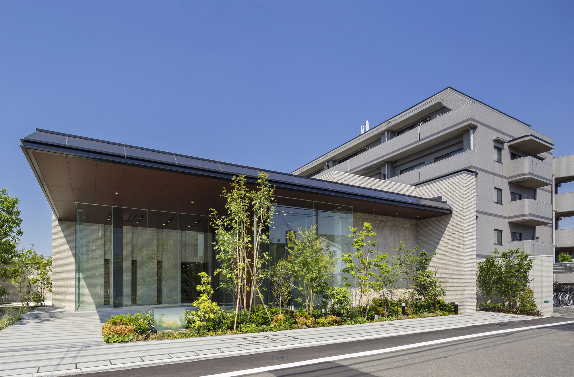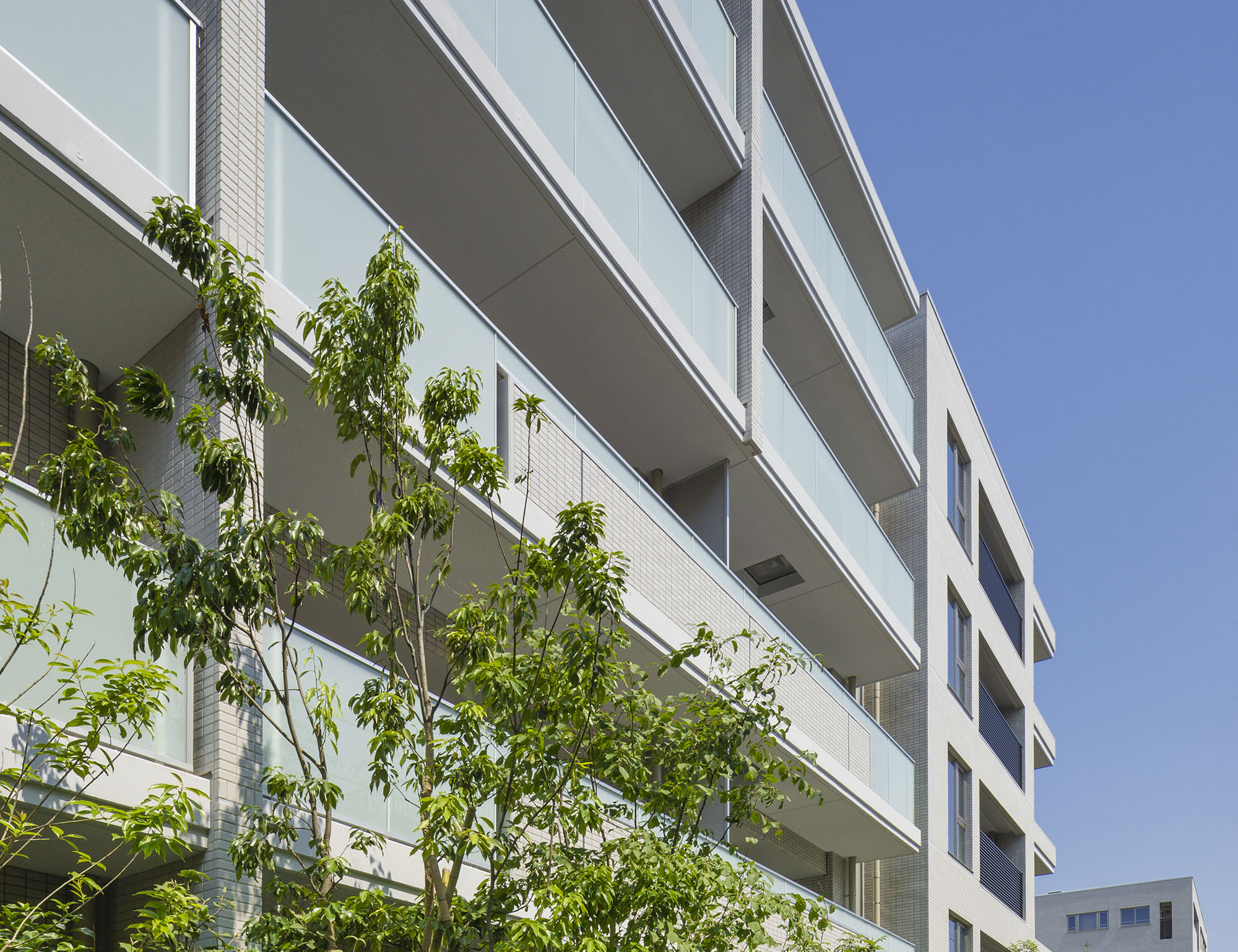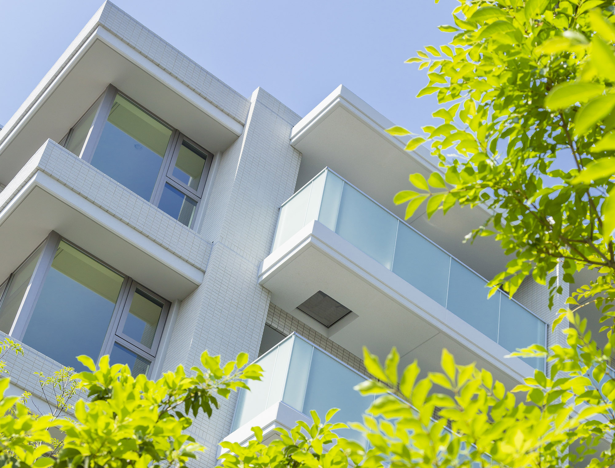 周囲の閑静な街並みに調和する、低層5階建レジデンス「パークホームズ目白ザ テラス」。緑に映える白を基調としたタイルやガラス手摺バルコニーが創り出す、スタイリッシュでモダンな外観デザインが特長です。バルコニー側は2種類のタイルを使い、妻側の壁には砂目地のタイルを採用するなど、テクスチャーを変えることで、同じ白系でも豊かな表情を創り出しています。また、エントランスには、趣のあるボーダータイルを使用し、隣接地に建つ「パークホームズ目白ザ フォレスト」と建物のデザインを続一することで、この街の一角に美しく優雅な街並みを創造。緑量豊かな「上り屋敷公園」から続く風景は、住まう方々のみならず、周囲の方々にも心地よく感じる景観となっています。