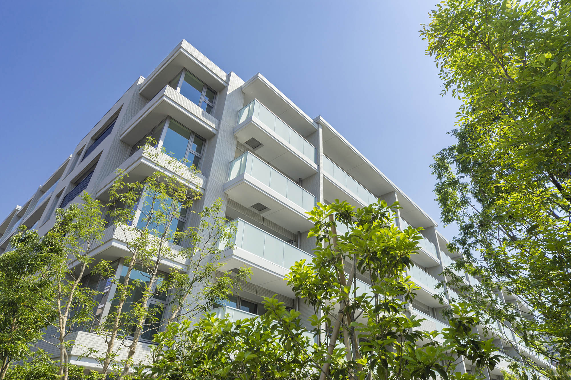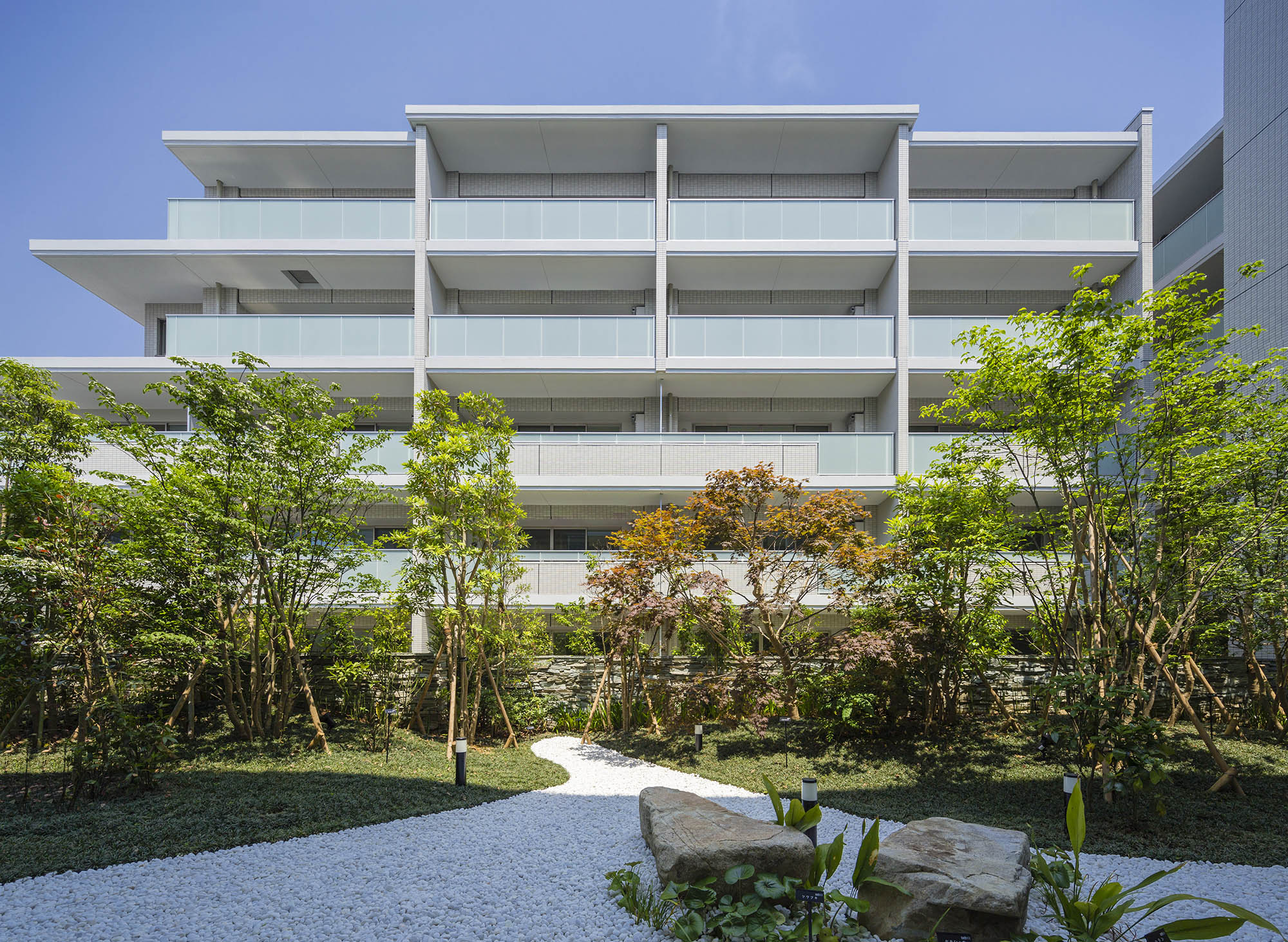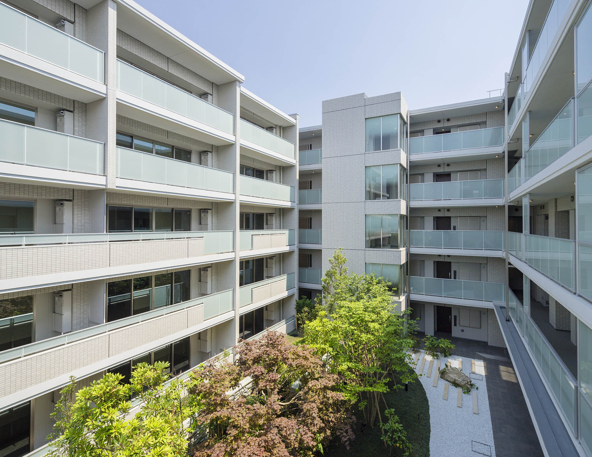 周囲の閑静な街並みに調和する、低層5階建レジデンス「パークホームズ目白ザ テラス」。緑に映える白を基調としたタイルやガラス手摺バルコニーが創り出す、スタイリッシュでモダンな外観デザインが特長です。バルコニー側は2種類のタイルを使い、妻側の壁には砂目地のタイルを採用するなど、テクスチャーを変えることで、同じ白系でも豊かな表情を創り出しています。また、エントランスには、趣のあるボーダータイルを使用し、隣接地に建つ「パークホームズ目白ザ フォレスト」と建物のデザインを続一することで、この街の一角に美しく優雅な街並みを創造。緑量豊かな「上り屋敷公園」から続く風景は、住まう方々のみならず、周囲の方々にも心地よく感じる景観となっています。