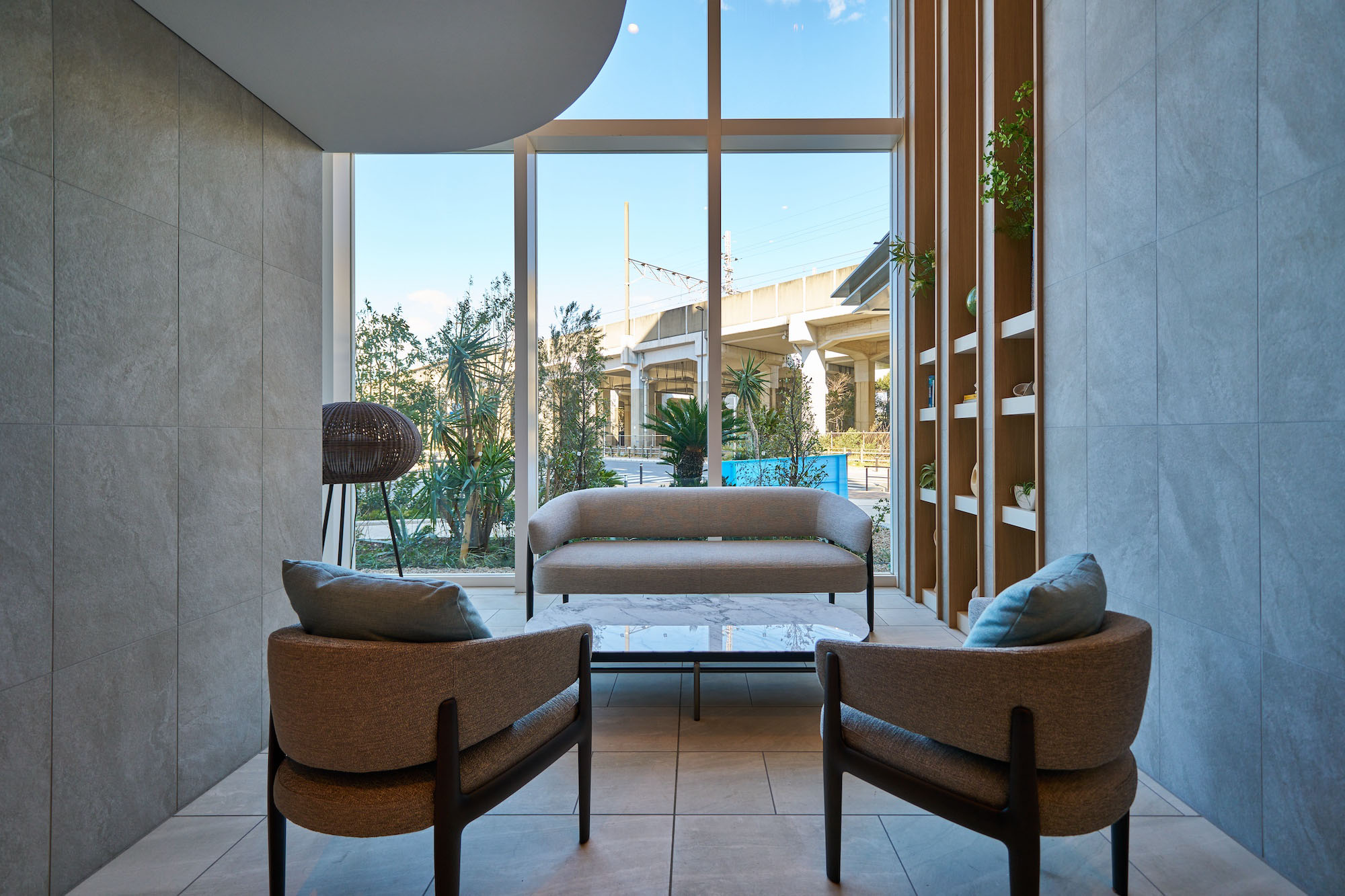 また、エントランスホールは約5mの2層吹き抜けで広く伸びやかな空間となっています。天井には曲線状のガラス繊維素材を配し、海風や波紋のイメージを表現。住まう方や来訪者をお招きする迎賓空間として、上質かつ重厚感あふれる佇まいです。