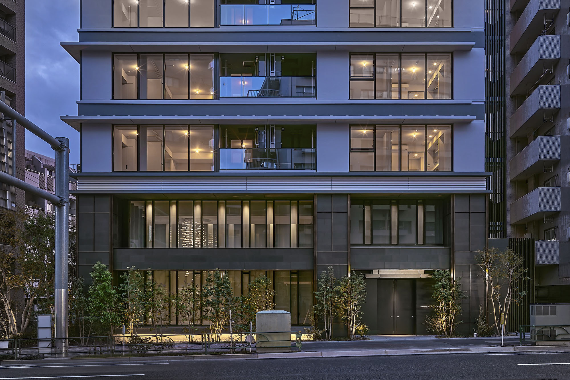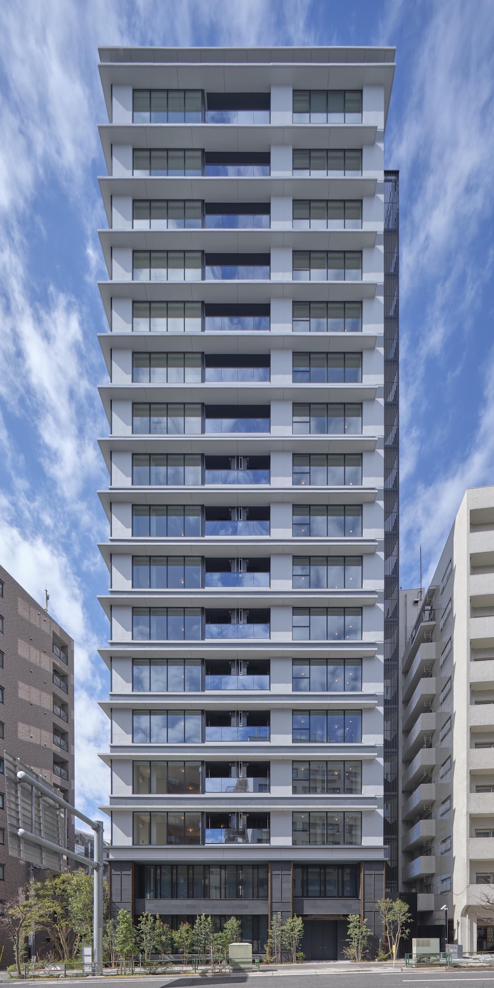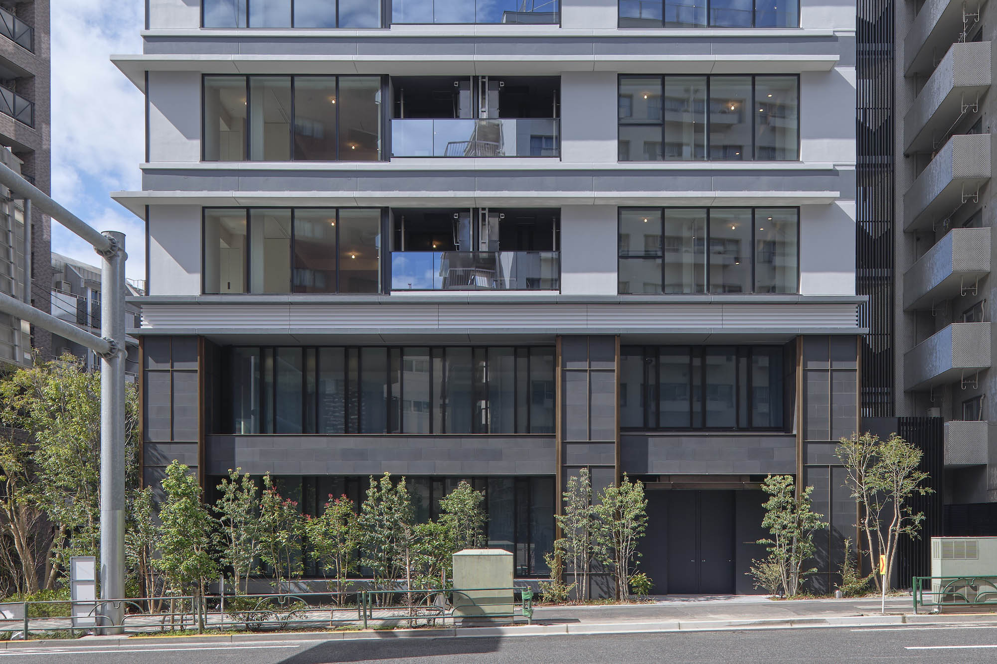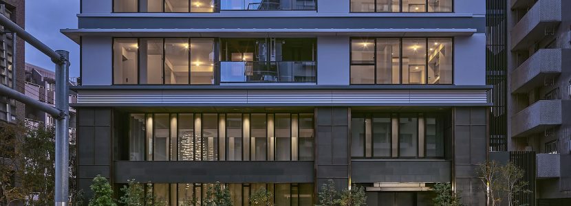 空に延びる中高層部は、連続するガラス面と重層する水平ラインが織り成す、シンプリシティを極めたデザイン構成。都市空間にシャープな存在感を刻みます。基壇部は、自然石貼りの重厚な列柱と梁、デザインガラスのワイドな開口面で構成。ミニマムな意匠を踏襲しながら、邸宅にふさわしい品格を創出しています。