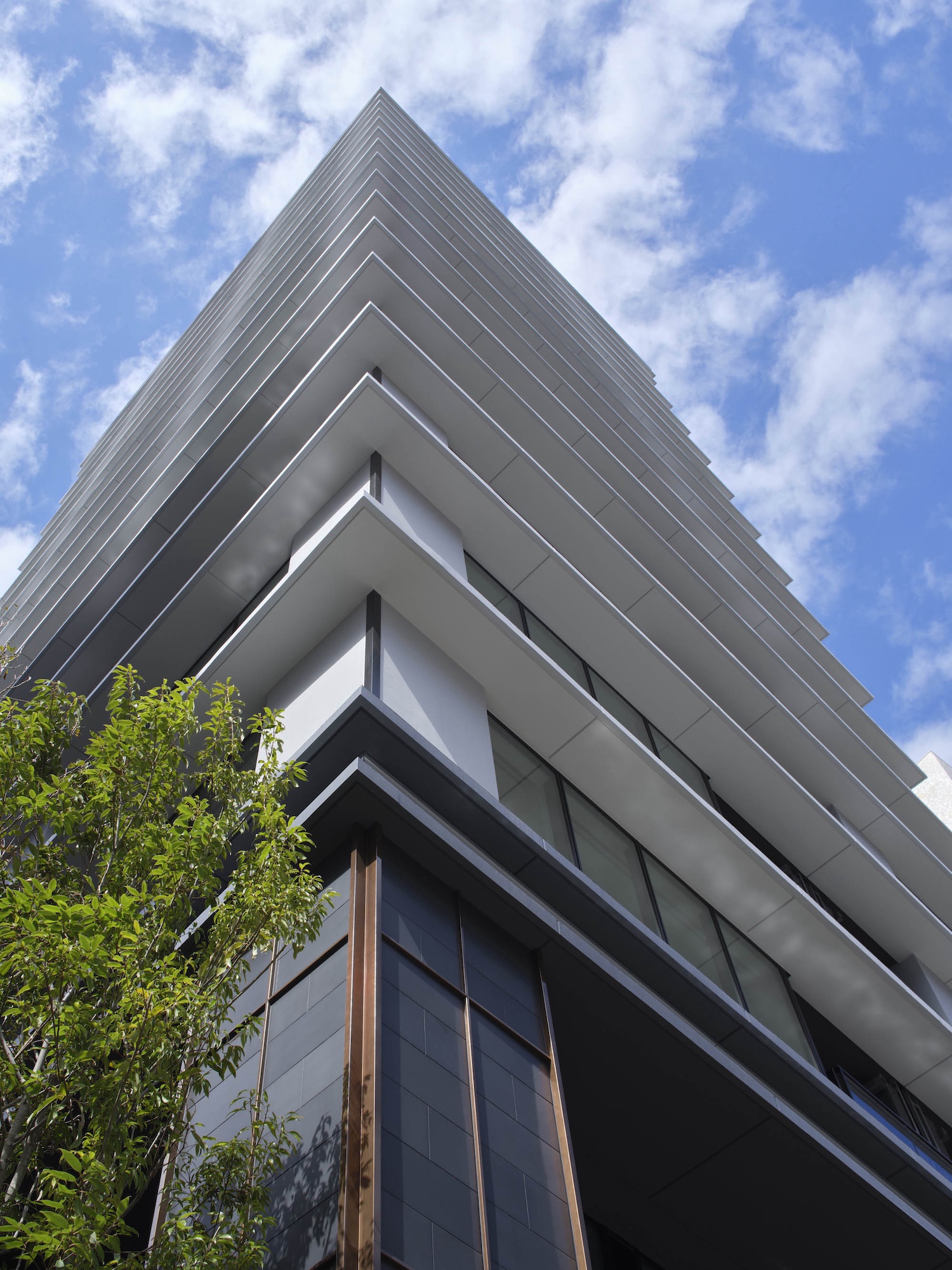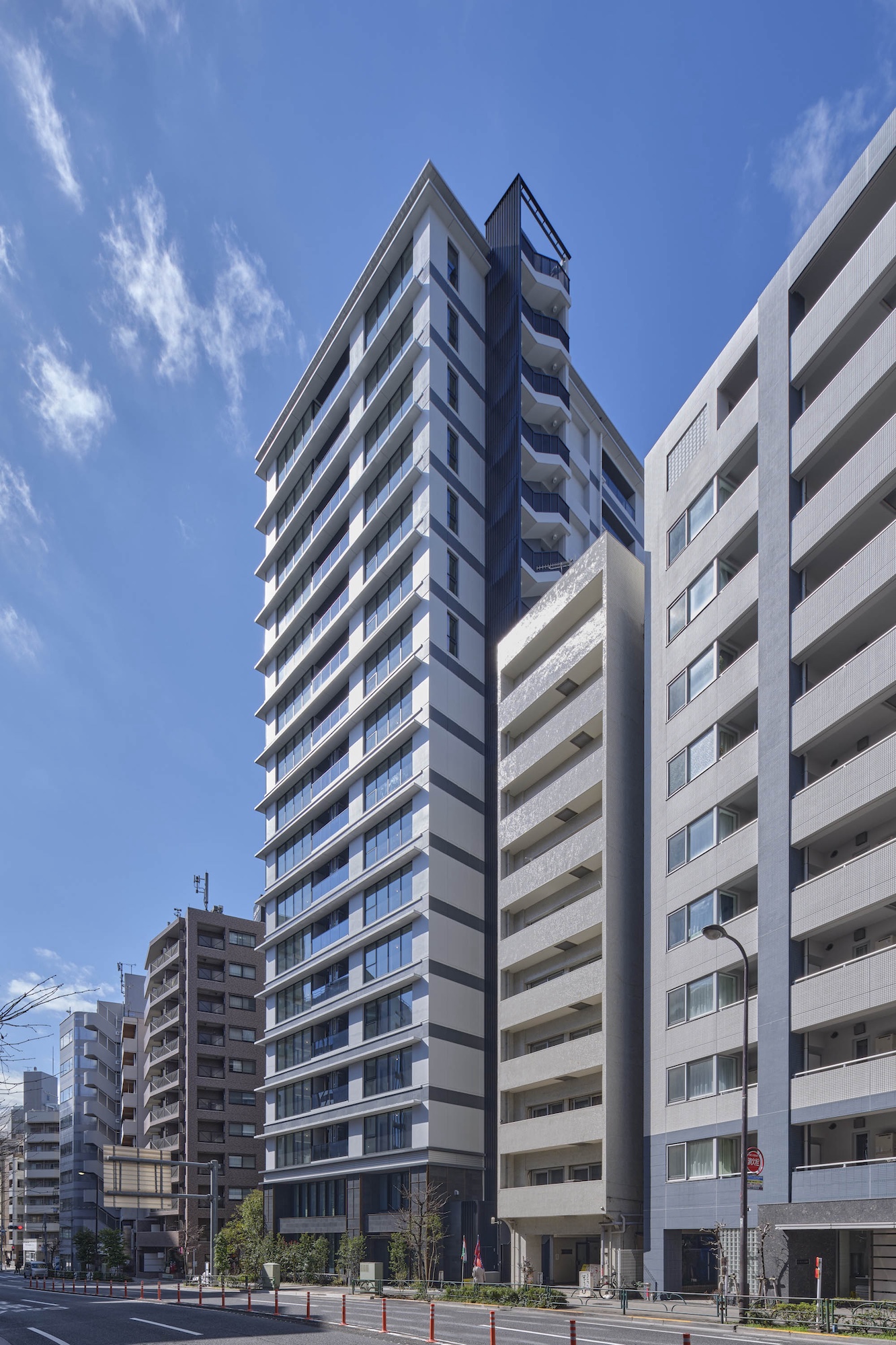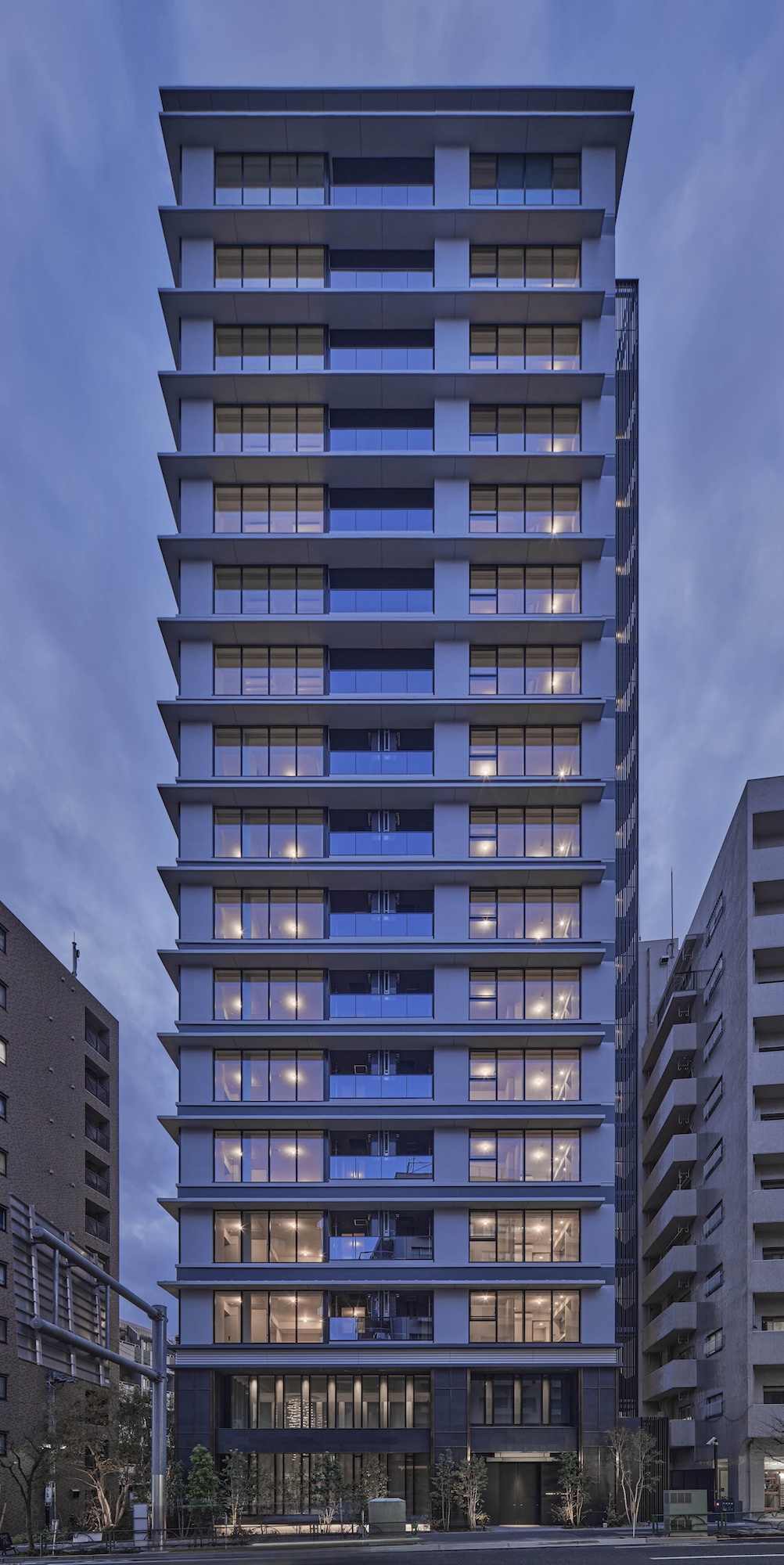 空に延びる中高層部は、連続するガラス面と重層する水平ラインが織り成す、シンプリシティを極めたデザイン構成。都市空間にシャープな存在感を刻みます。基壇部は、自然石貼りの重厚な列柱と梁、デザインガラスのワイドな開口面で構成。ミニマムな意匠を踏襲しながら、邸宅にふさわしい品格を創出しています。