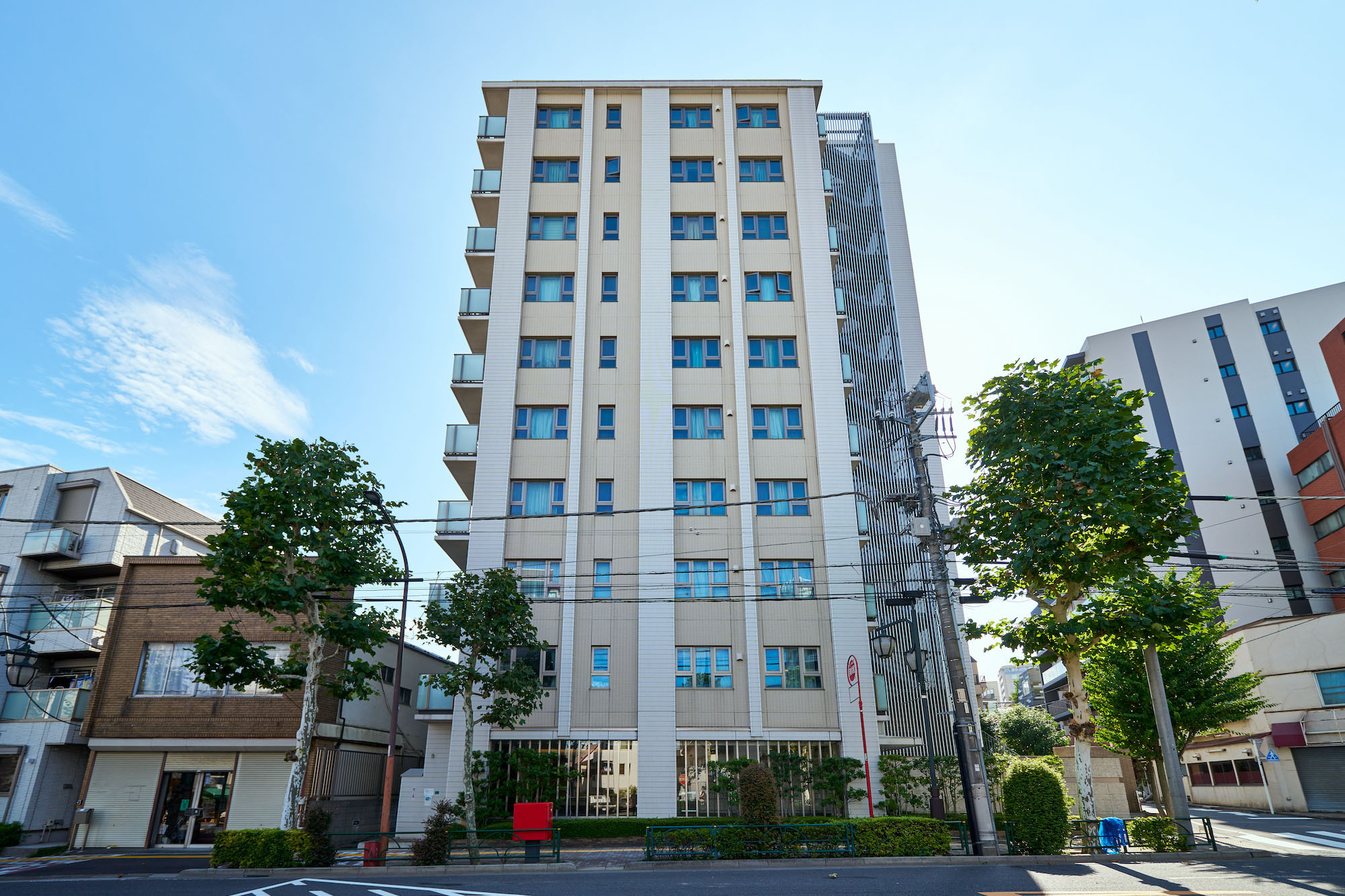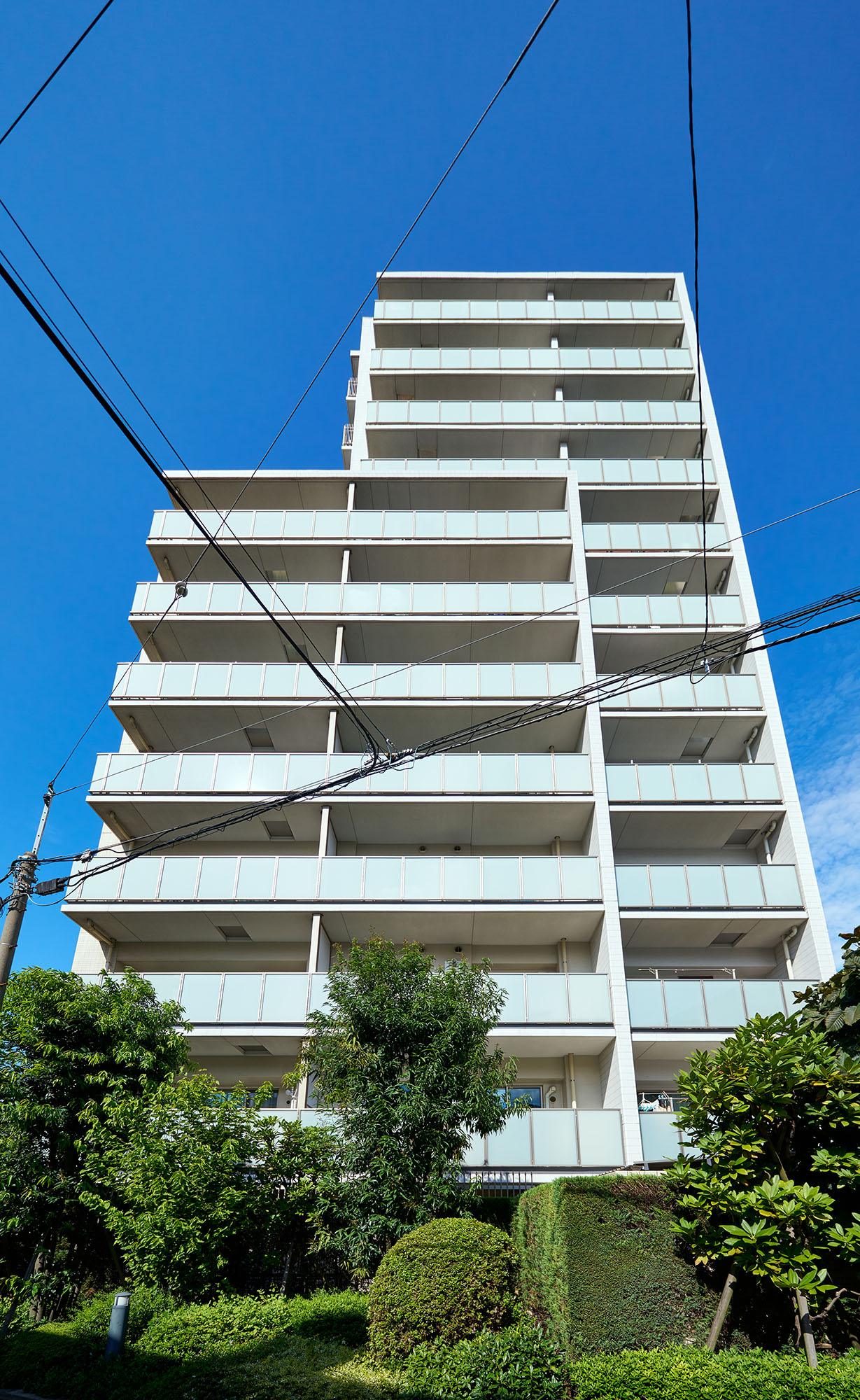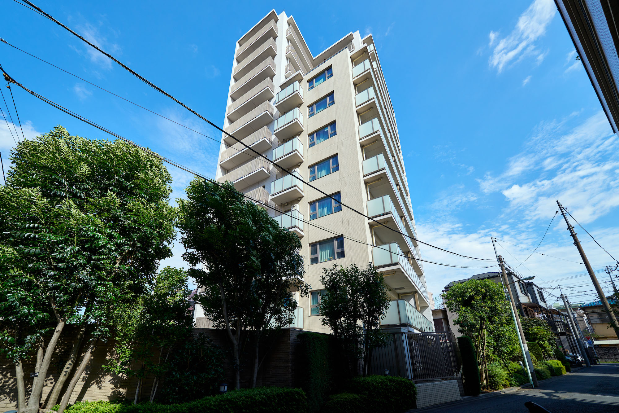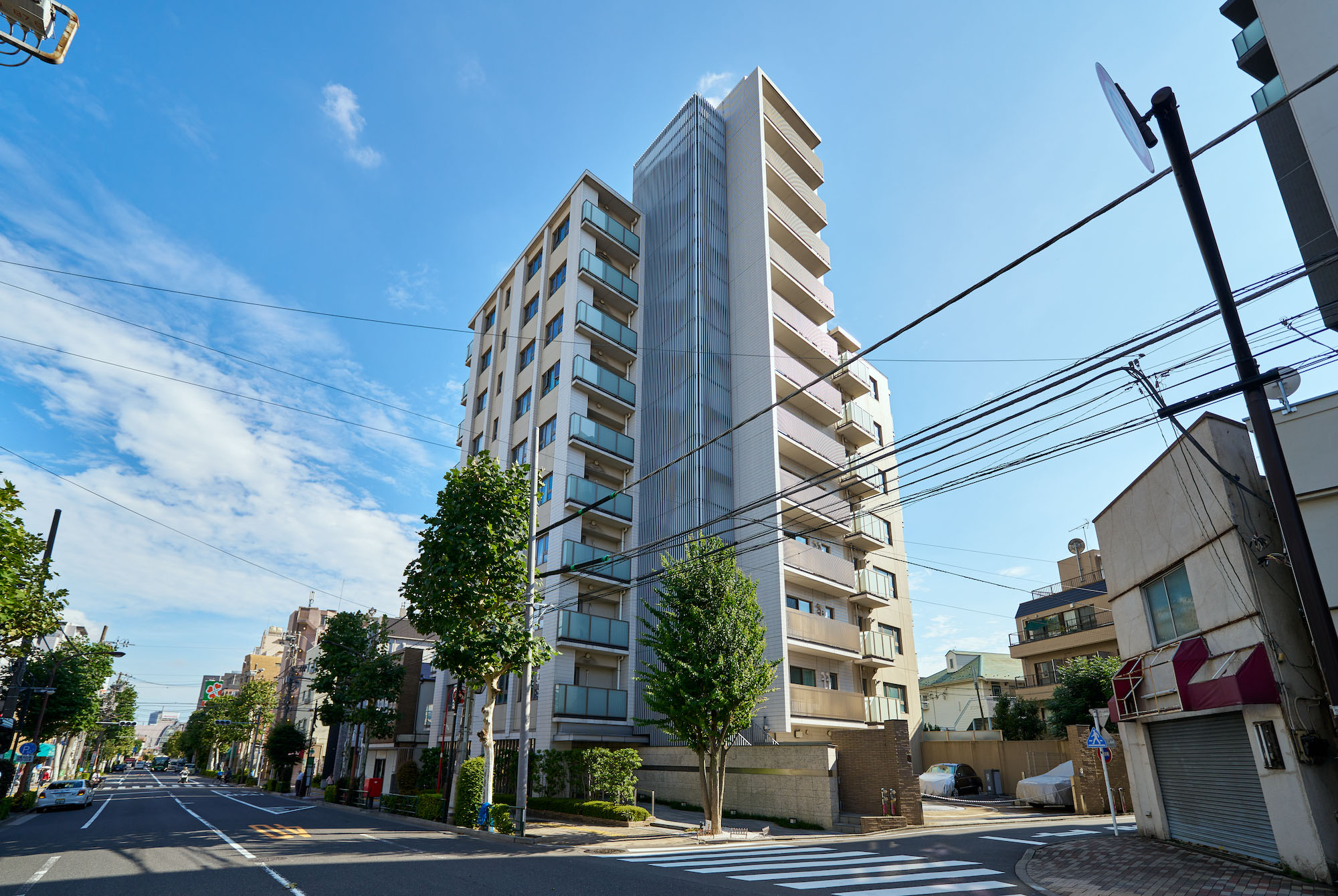 「パークホームズ南大塚」が目指したのは、街並みや自然と共に永い歳月を生き続けていける邸宅の姿。落ち着いた風景をたたえる南大塚二丁目の地にふさわしい、存在感のある建築美を追求しました。外観デザインは、プラタナスの木立をモチーフとして垂直ラインを強調。透明感や軽快さを際立たせるためにガラスを多用し、縦貼りのハーフボーダータイルで外壁に繊細な表情を演出。ホワイト&ベージュに彩られた12層のフォルムに、つらなる並木の緑とのびやかに広がる青空が映し出されます。