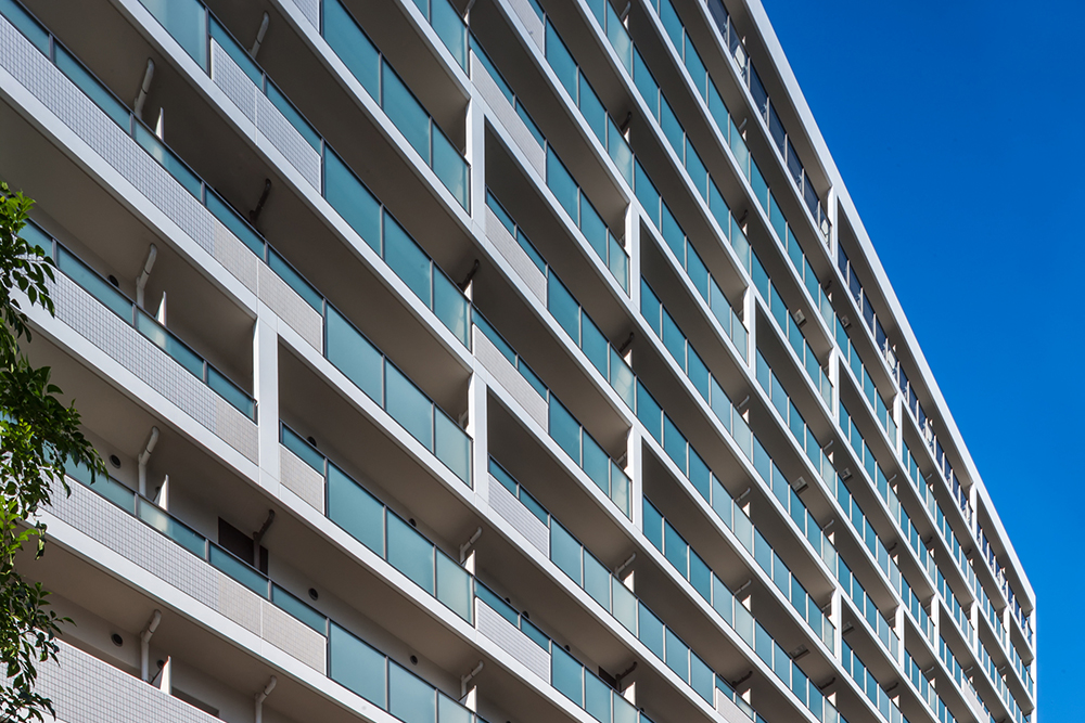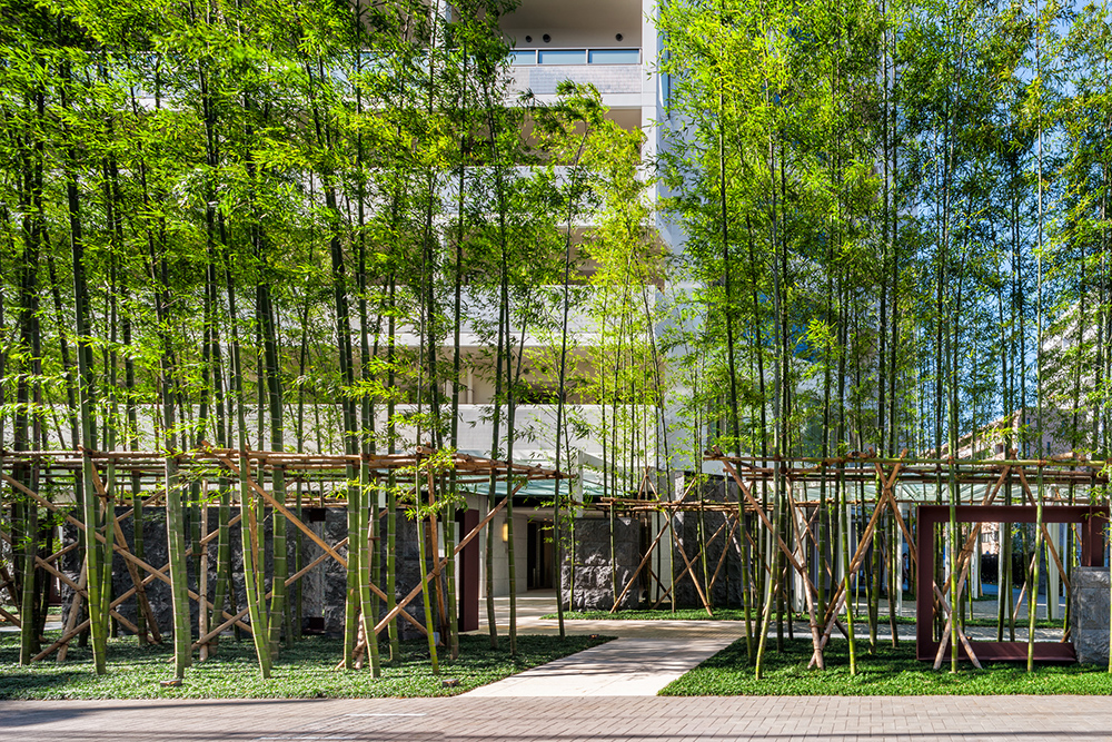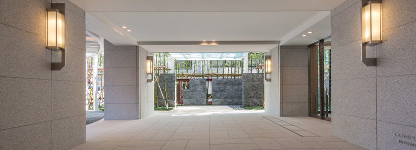 周囲の環境の歴史を受け継いだ植栽がぐるりと建物を取り囲み、季節とともに移ろう景色が、一年を通して様々に心を楽しませてくれます。そして、竹の屋敷林の奥にひときわ存在感をはなつ、白を基調とした端正なフォルムの邸宅。このスケール感にやわらかな印象を与えるために、外観には織り物のようなデザインが施されています。何種類もの素材が「たて糸」と「よこ糸」となって和のモダンテイストを作り出し、色と素材の組み合わせが端正で美しい表情を与えています。