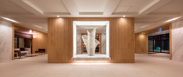 共用空間コンセプトは「迎賓」。和モダンの世界がマンションの個性を表現している。マスターラウンジには、前衛的な生け花を思わせるアートが圧倒的な存在感を見せ、お客様を迎え入れる。