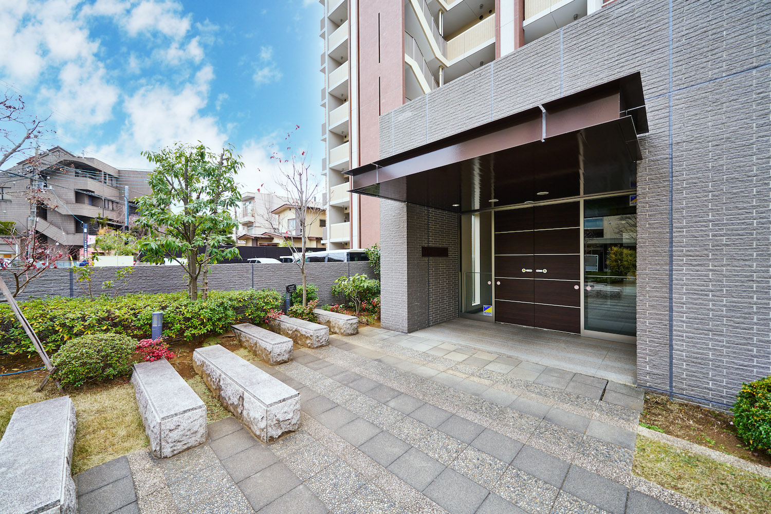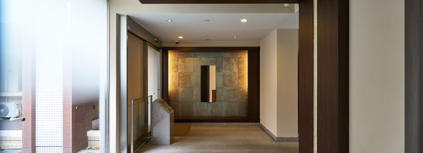 緩やかなアプローチに沿ってしつらえた趣ある石壁、ボーダー状の床石、小道にせり出すように配置された置き石。さまざまな石の隙間を縫うようににじみだす緑。石材と植栽の自然が共演するアプローチ空間が、住まう方々をやすらぎで包むとともに、道ゆく人々にも潤いを感じさせる風景を創り上げています。別棟エントランスは、インテリアのアクセントとなるL字パネルや、やわらかな間接照明によって優雅な印象を演出。エントランスホールに足を踏み入れると、正面壁には「浦和弁天公園」の桜をモチーフとしたオブジェがしつらえられており、いつまでも咲き続ける美しい日々への想いが込められています。