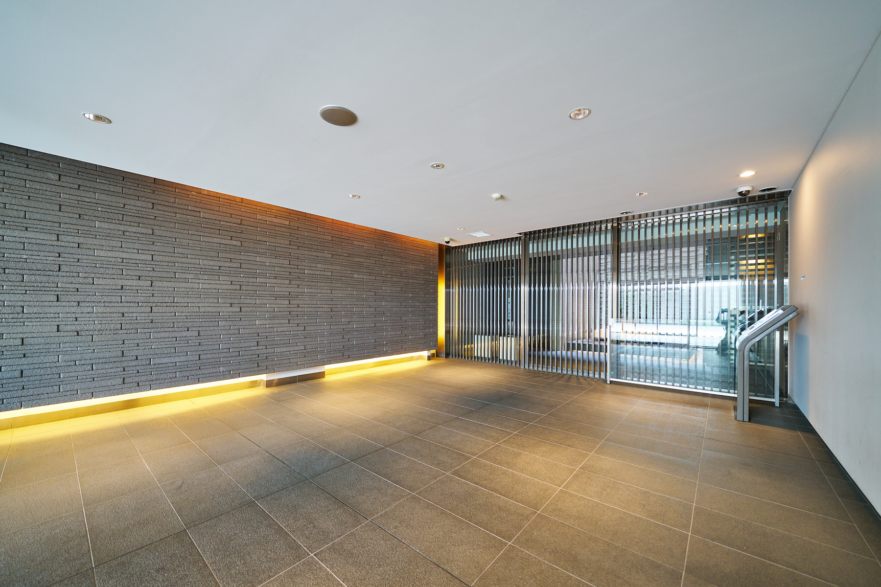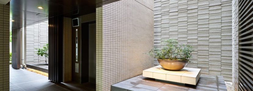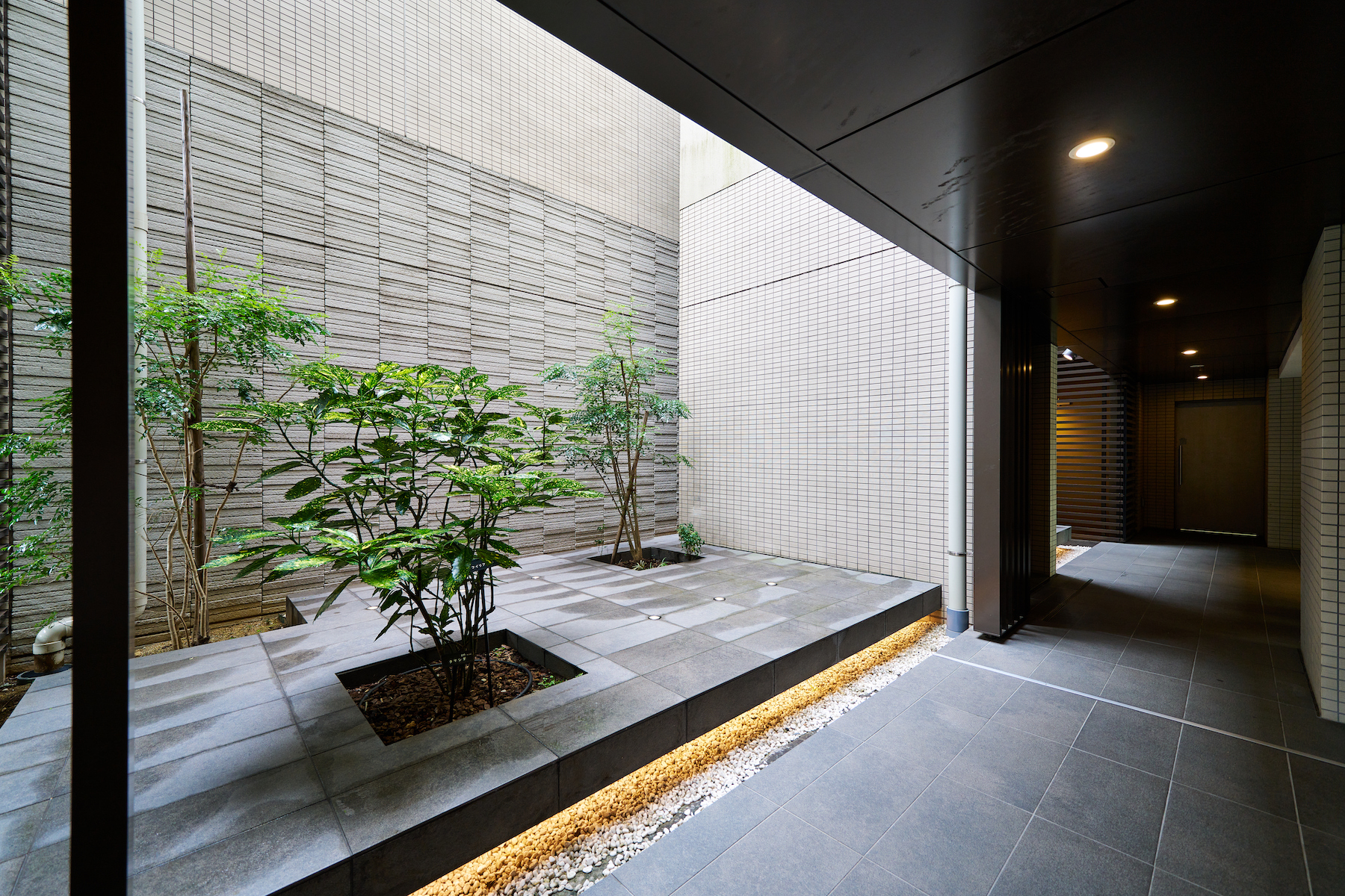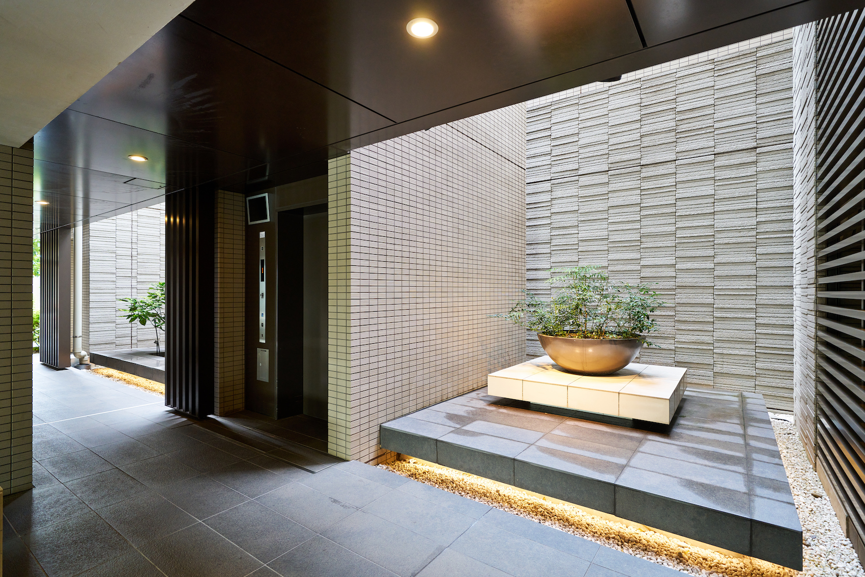 鮮やかな緑を携え、住まう人と訪れる人を温かく出迎える間口の広いエントランス。細いボーダータイルの壁と、館銘を施してくり抜かれたホワイトの壁が、建物の顔としてのこだわりを感じさせます。風除室からエントランスホールまでは同じボーダータイルの壁が続いており、連続性を持たせることで奥行きのある空間を形成。間接照明が温かな雰囲気を演出しています。その先にはエレベーターとともに緑の潤いを感じられる坪庭を配置。屋内にあって、緑の潤いを感じられる凛とした空間となっています。