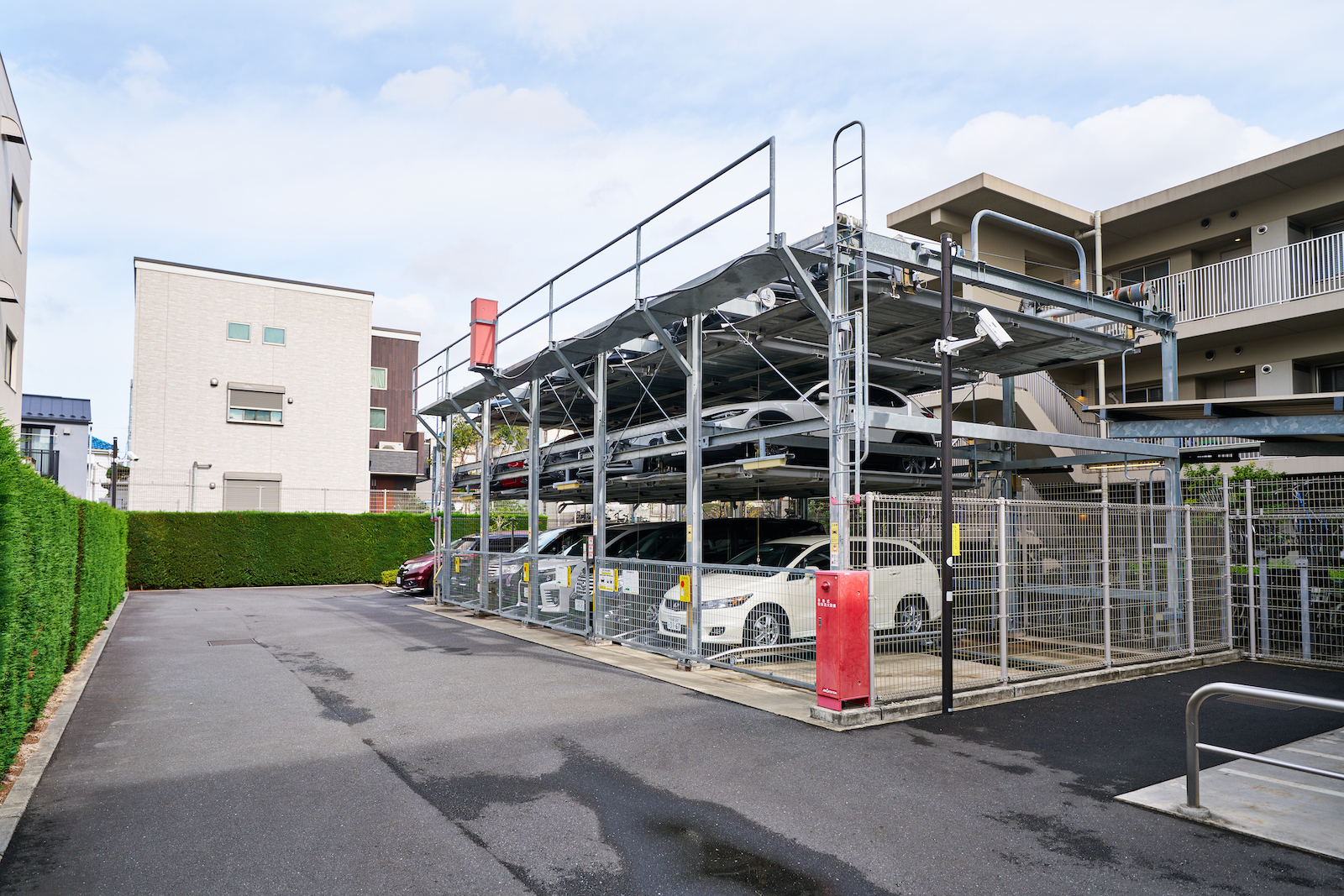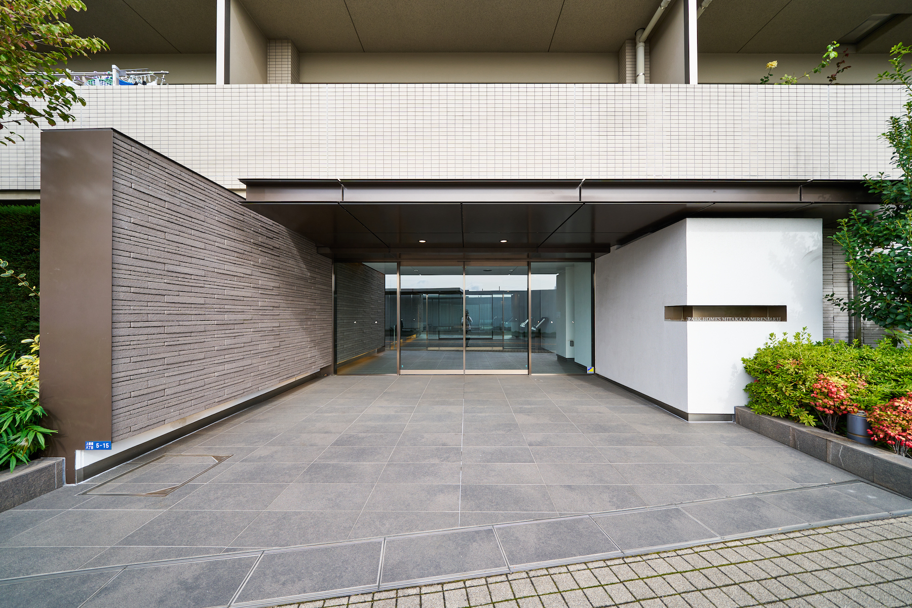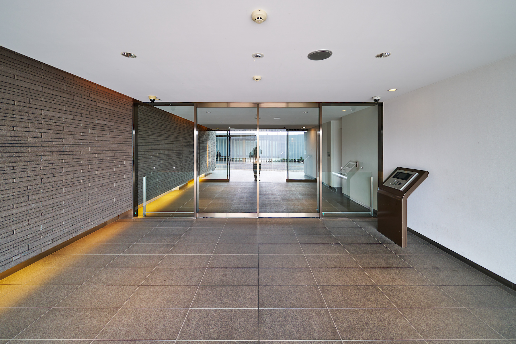 鮮やかな緑を携え、住まう人と訪れる人を温かく出迎える間口の広いエントランス。細いボーダータイルの壁と、館銘を施してくり抜かれたホワイトの壁が、建物の顔としてのこだわりを感じさせます。風除室からエントランスホールまでは同じボーダータイルの壁が続いており、連続性を持たせることで奥行きのある空間を形成。間接照明が温かな雰囲気を演出しています。その先にはエレベーターとともに緑の潤いを感じられる坪庭を配置。屋内にあって、緑の潤いを感じられる凛とした空間となっています。