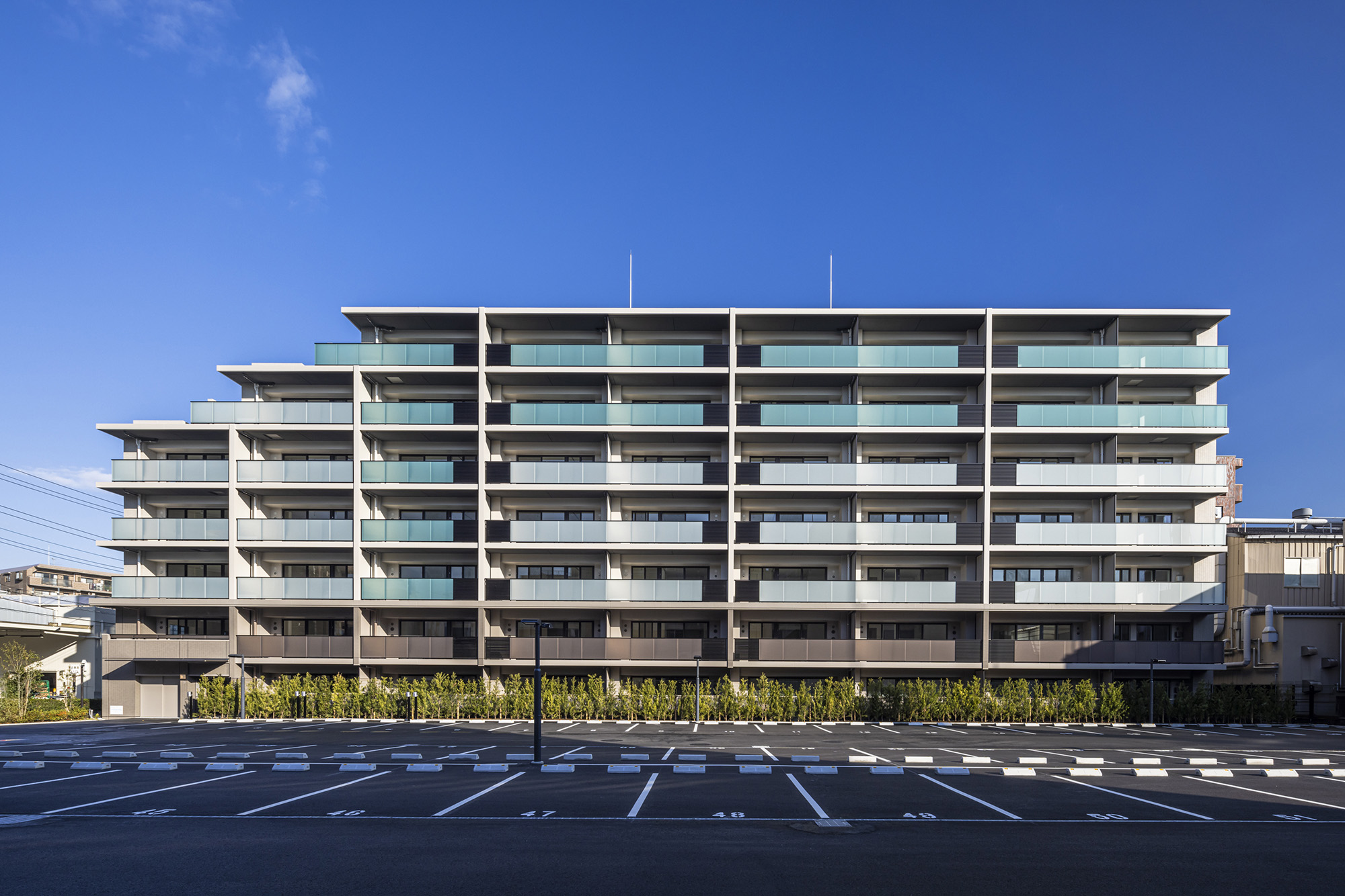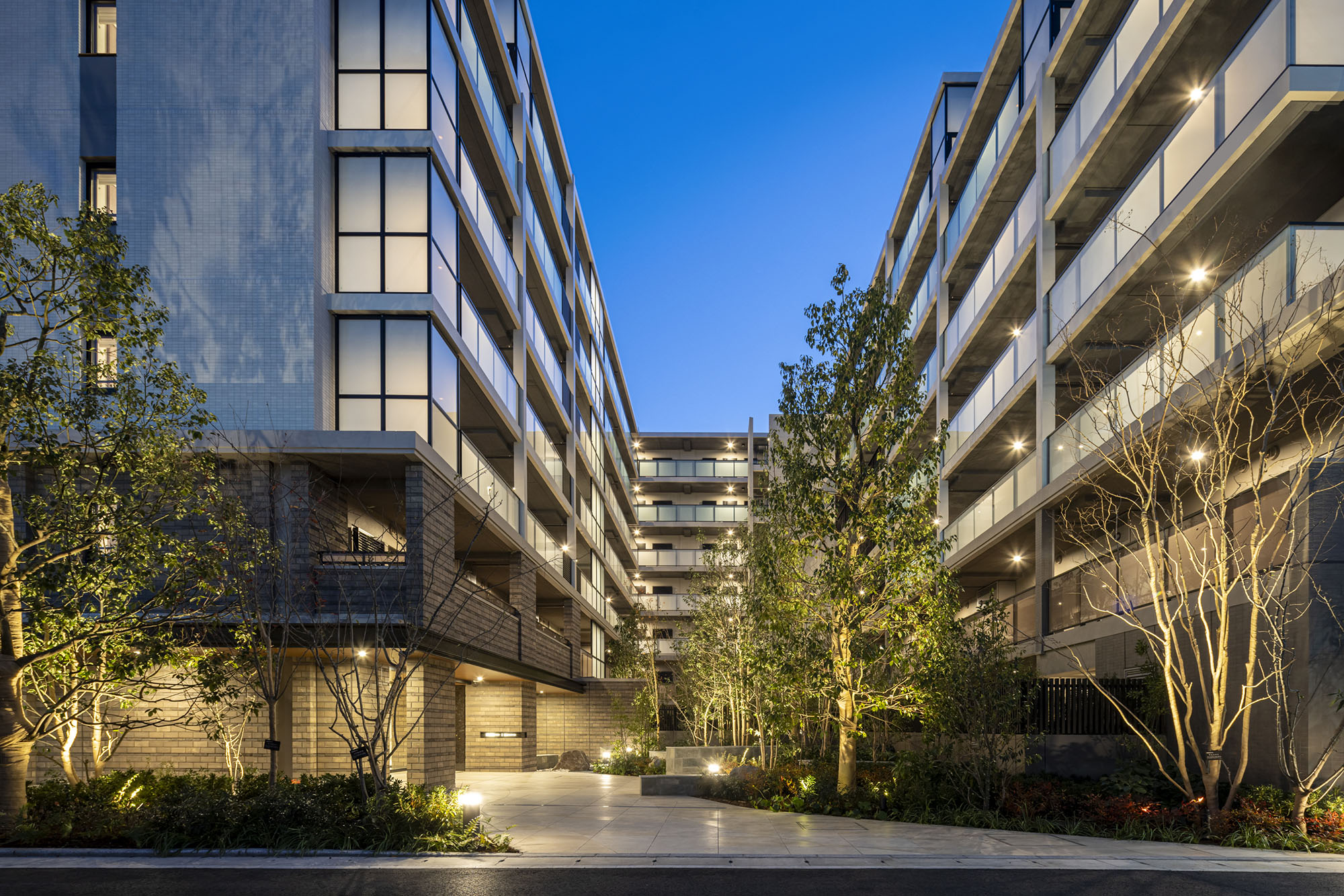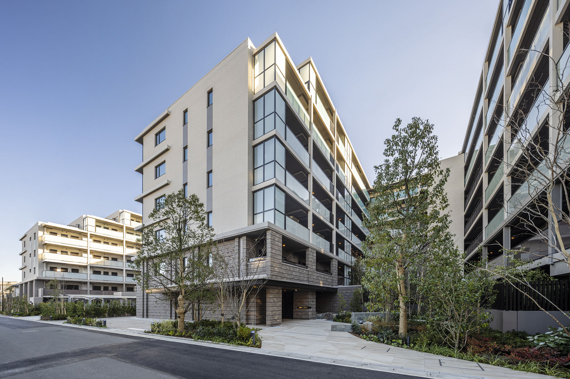 デザインテーマは「Softy×Edgy」。溝の口で愛され続けるレジデンスを目指し、地域に由来する水辺や自然をイメージさせる「Softy」、外観では縦のマリオンや横ラインを強調した「Edgy」をキーワードに、モダンなデザインが取り入れられています。空地率約54%を確保した敷地には豊富な植栽を配し、川の流れをイメージしたアプローチには四季の移ろいを感じられる様々な樹木を選定。縦の装飾デザインマリオンのほか、コーナー部分のガラス手摺を天井まであげたデザインや、水平ラインを強調する装飾(コーニス)をサイドにまわしてなど、基壇部の落ち着いた素材感など、細部の意匠やマテリアルにもこだわり、街にふさわしい景観が描かれています。