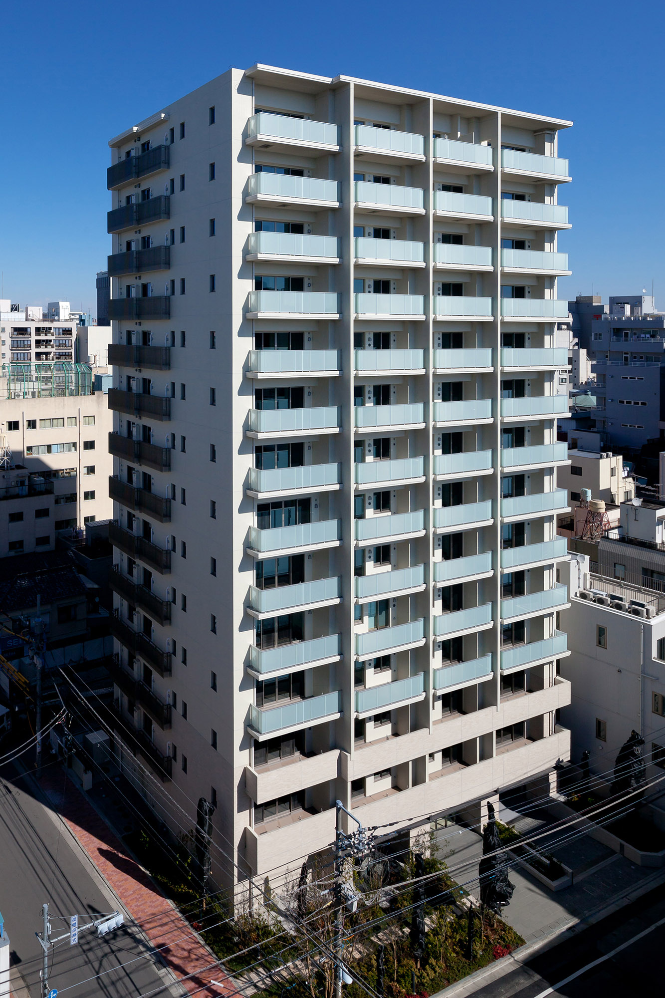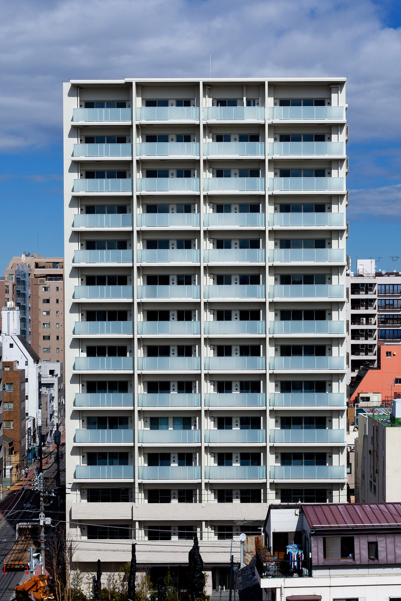 古くから伝わる街並みの中にあって、さりげなく明るさと開放感を主張する。「パークホームズ元浅草」が目指したのは、レジデンスとしての格調がうかがえるシャープな建築デザイン。水平ラインを強調する透明感のあるガラスバルコニー、垂直ラインを強調する大空へ向かってのびるマリオン、陽光を優しく受け止めるホワイト&ベージュ基調の外壁タイル、建物にリズミカルな変化を与える妻側のスリット窓——。フォルムを構成する一つひとつの要素を絶妙に組み合わせることで、彫の深い端整な表情を創りだしています。