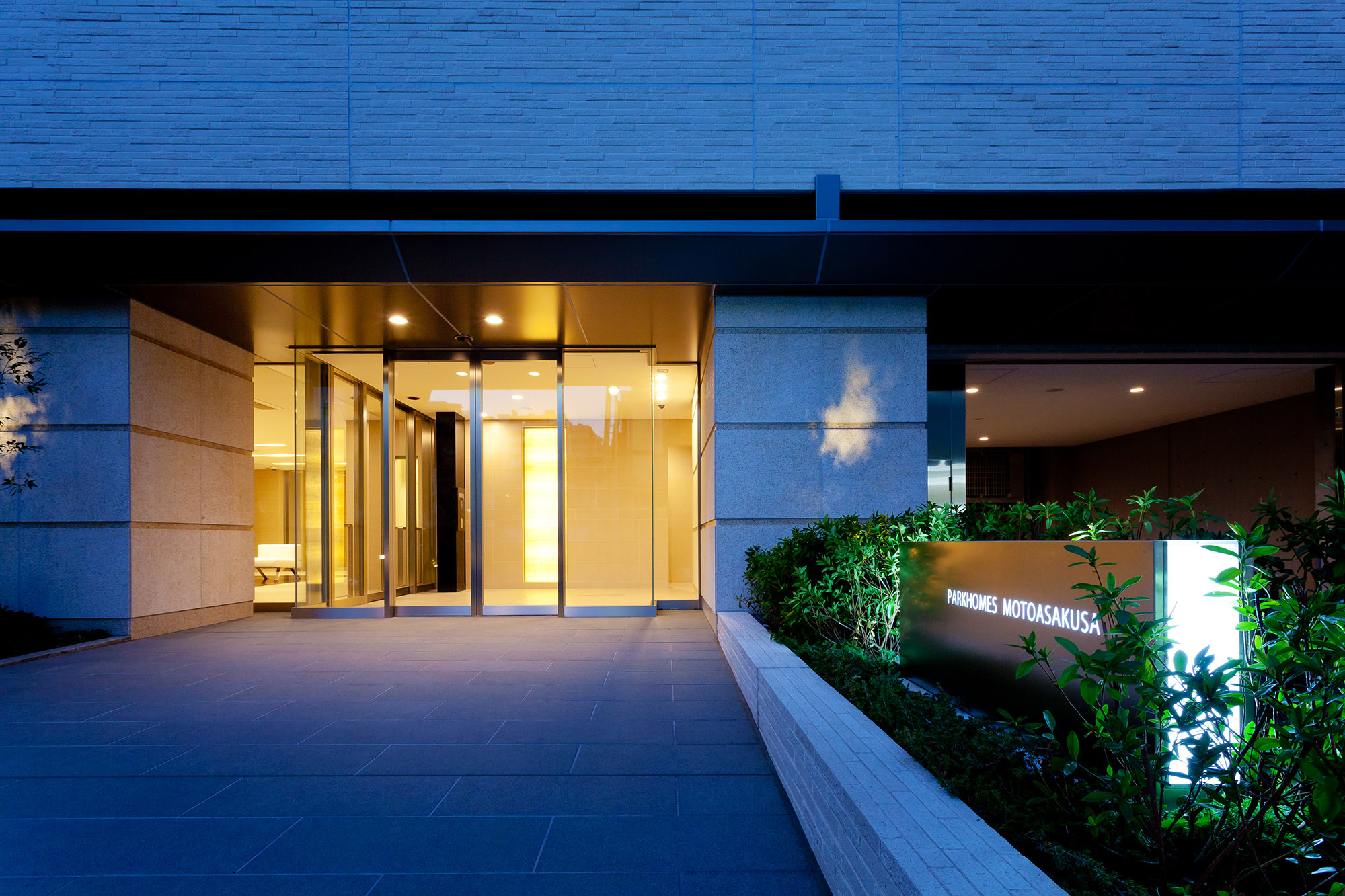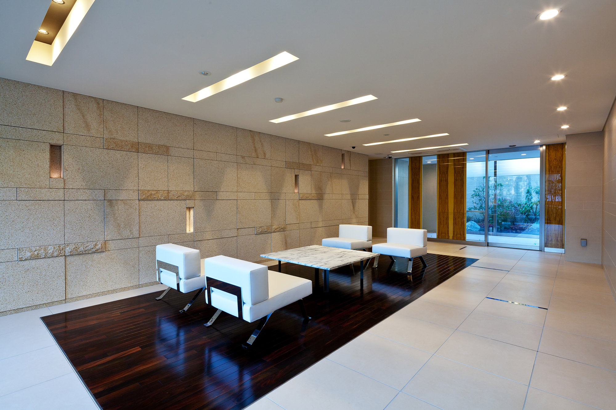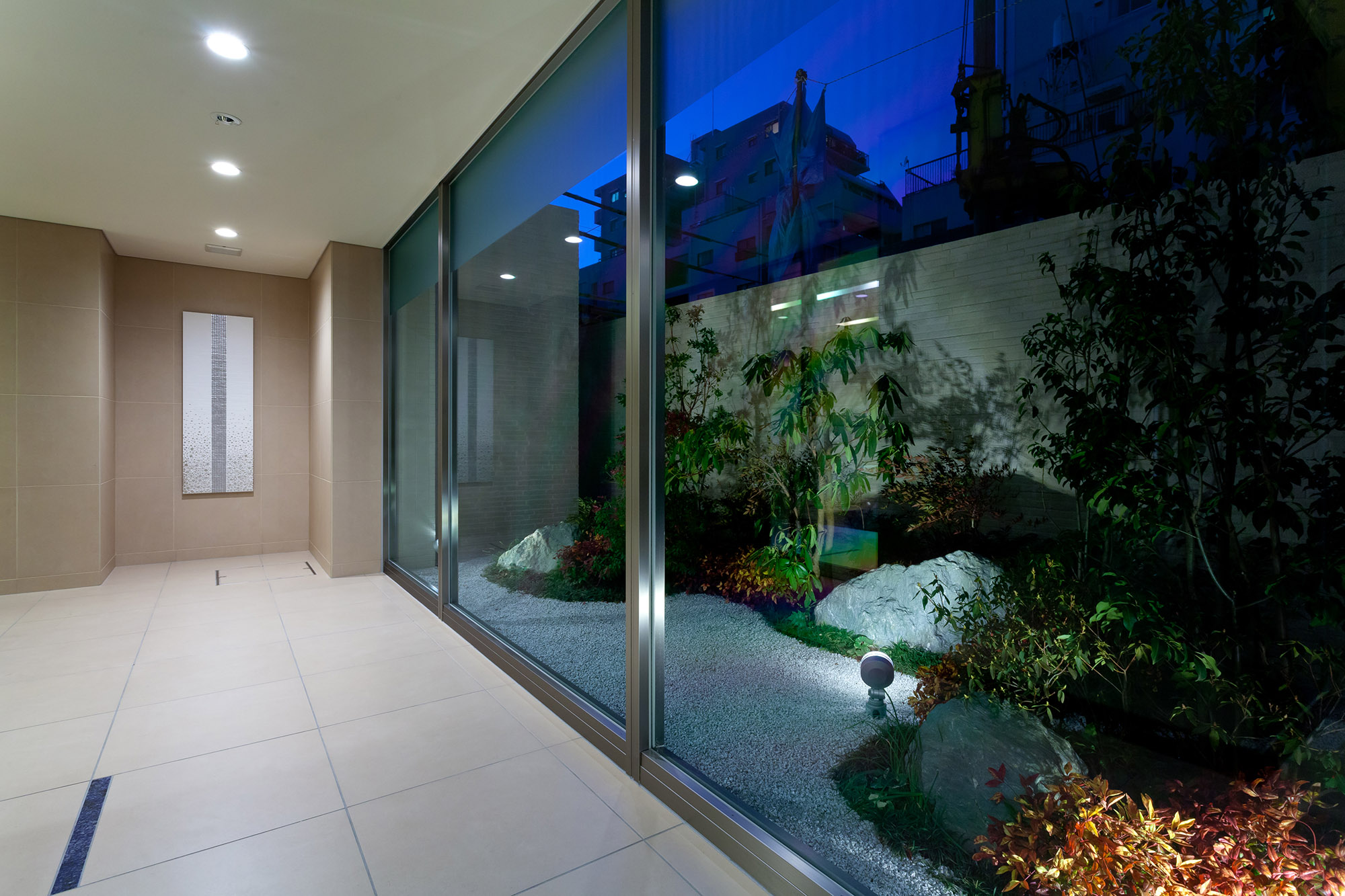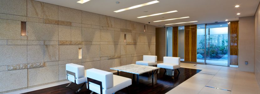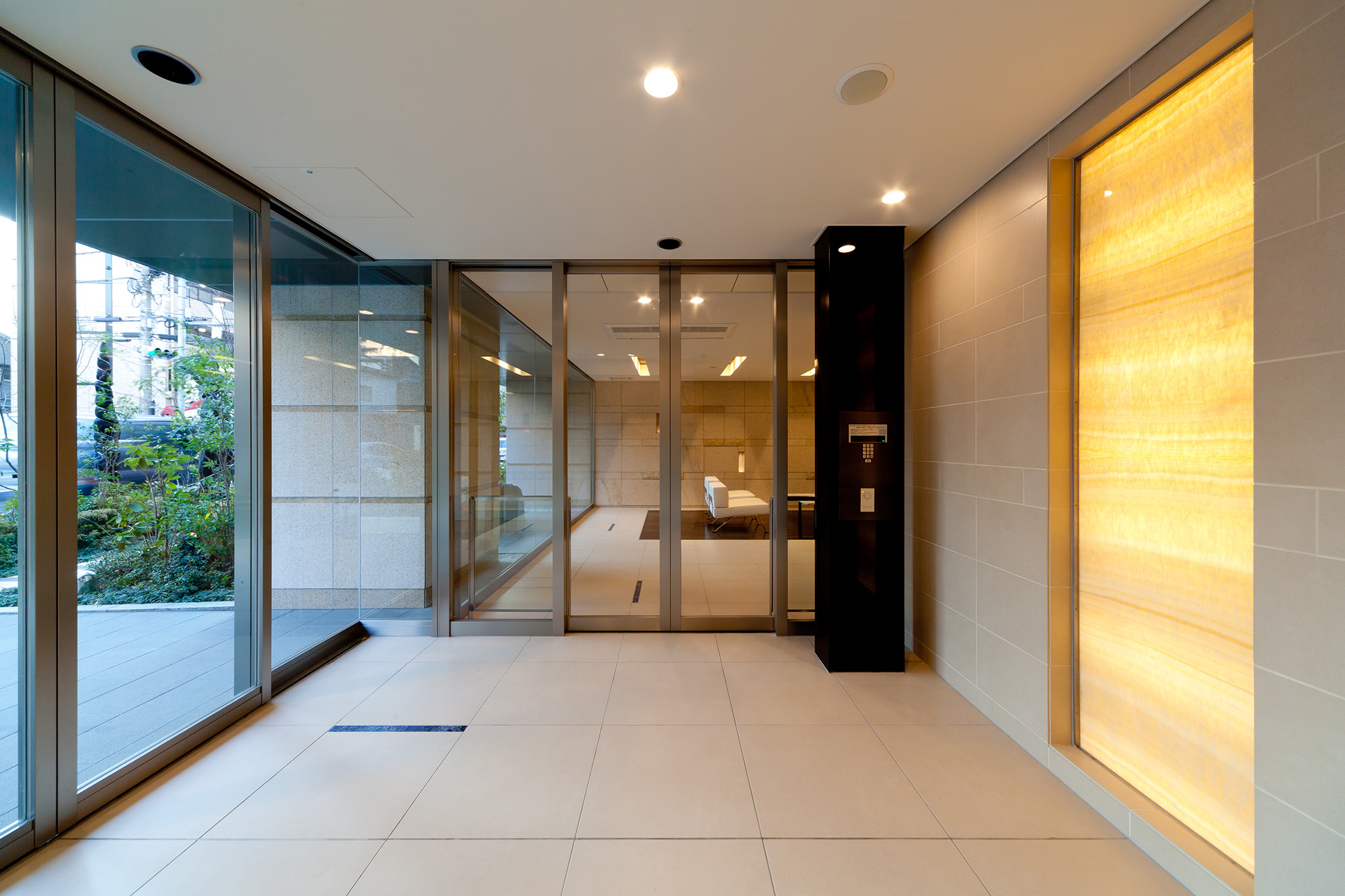堂々と訪れた人を招き入れる、奥行き約6mのエントランスアプローチ。静けさをたたえる御影石のアプローチは車路の入口まで敷きつめ、ゆとりある広がりを描き、幅約18mにおよぶキャノピーは、空間ののびやかさを感じさせます。風除室で迎えてくれるのはオニキスの石を透かした光壁。照明で美しく浮かびあがるアーティスティックな様子を創りだしています。エントランスホールに広がるのは、照明を埋め込んだ南安サビ石仕上げのデザインウォール。フロアの一角にしつらえた紫檀フローリングやライン状に折り上げた天井、さらには大きなウィンドウに映り込む緑や岩石のオブジェが印象的です。エレベーターホールへの扉には、ガラスにオリーブカスティーリョを嵌め込んだデザインガラスを採用。そのガラス越しに中庭や箔のアートを垣間見ることができます。