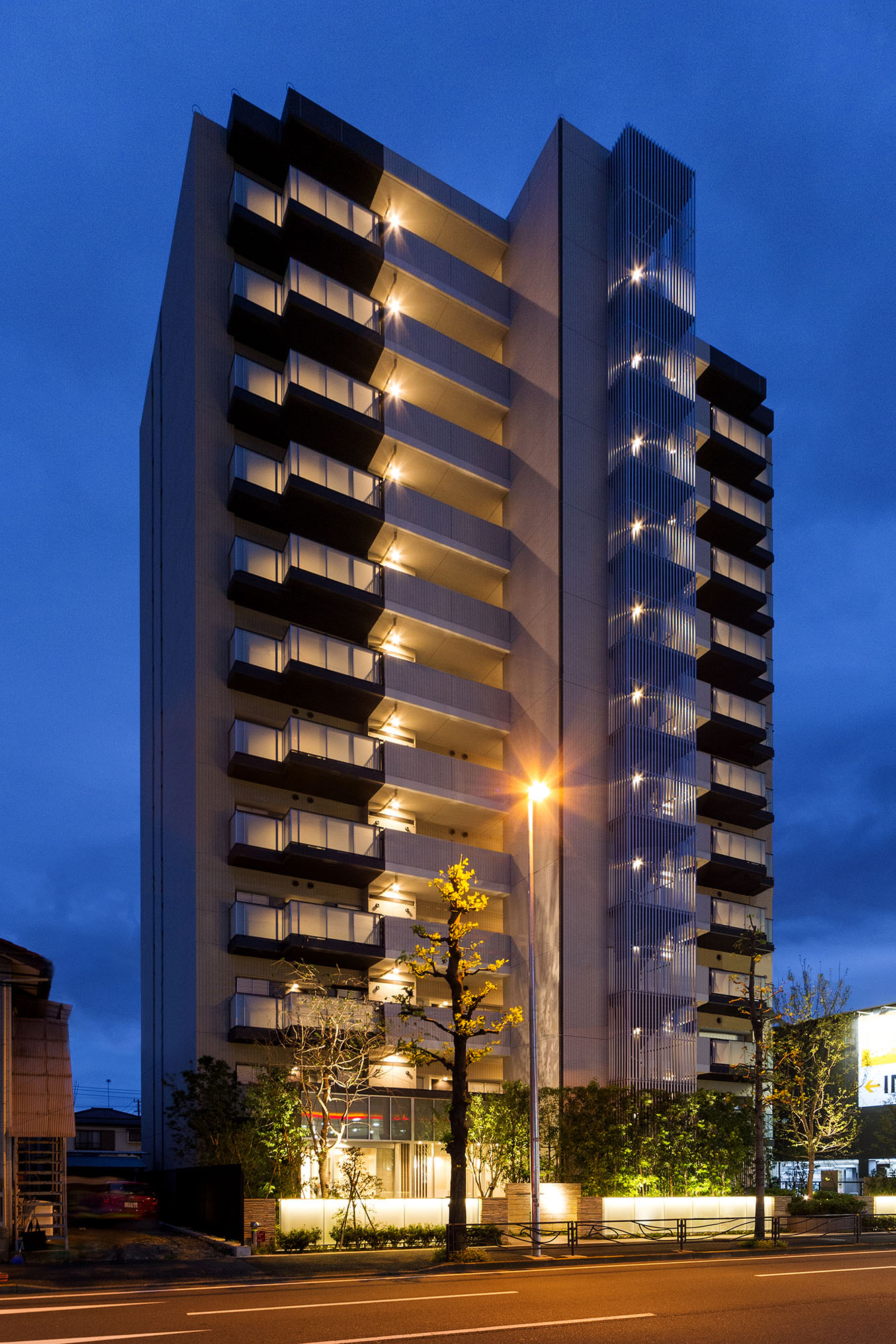 「元住吉」駅周辺のにぎわいが伝わるエントランスサイド。穏かな住宅街の空気が流れ、眺望が広がるバルコニーサイド。この二つの魅力を調和させ、この地に相応しい洗練されたデザインを実現しています。伸びやかに空へと伸びる縦ラインが開放感のあるデザインを主張。色調は落ち着いたベージュを基調色に、モダンなブラックをアクセントとしています。建物の足元では、ゲートウォールや高木を下から照らすアッパーライトなどが優しく灯る光をデザイン。建物外観の縦ラインに沿って、外部階段のブラケット照明、住戸前や共用廊下のダウンライトが灯り、我が家の温もりを感じる柔らかな光は、住まいを美しく演出しています。