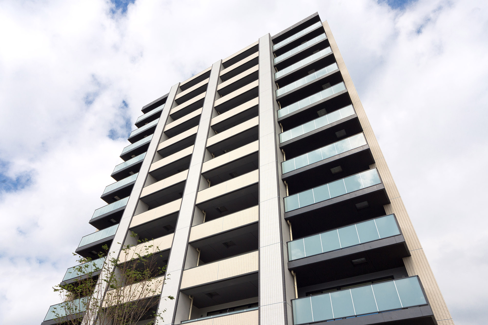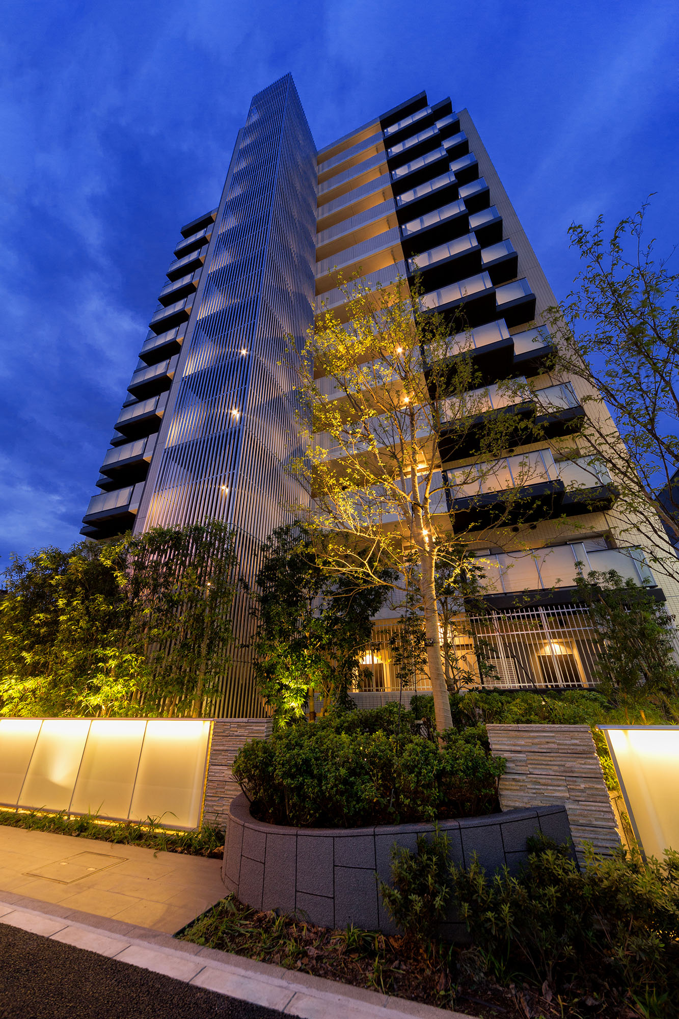 「元住吉」駅周辺のにぎわいが伝わるエントランスサイド。穏かな住宅街の空気が流れ、眺望が広がるバルコニーサイド。この二つの魅力を調和させ、この地に相応しい洗練されたデザインを実現しています。伸びやかに空へと伸びる縦ラインが開放感のあるデザインを主張。色調は落ち着いたベージュを基調色に、モダンなブラックをアクセントとしています。建物の足元では、ゲートウォールや高木を下から照らすアッパーライトなどが優しく灯る光をデザイン。建物外観の縦ラインに沿って、外部階段のブラケット照明、住戸前や共用廊下のダウンライトが灯り、我が家の温もりを感じる柔らかな光は、住まいを美しく演出しています。