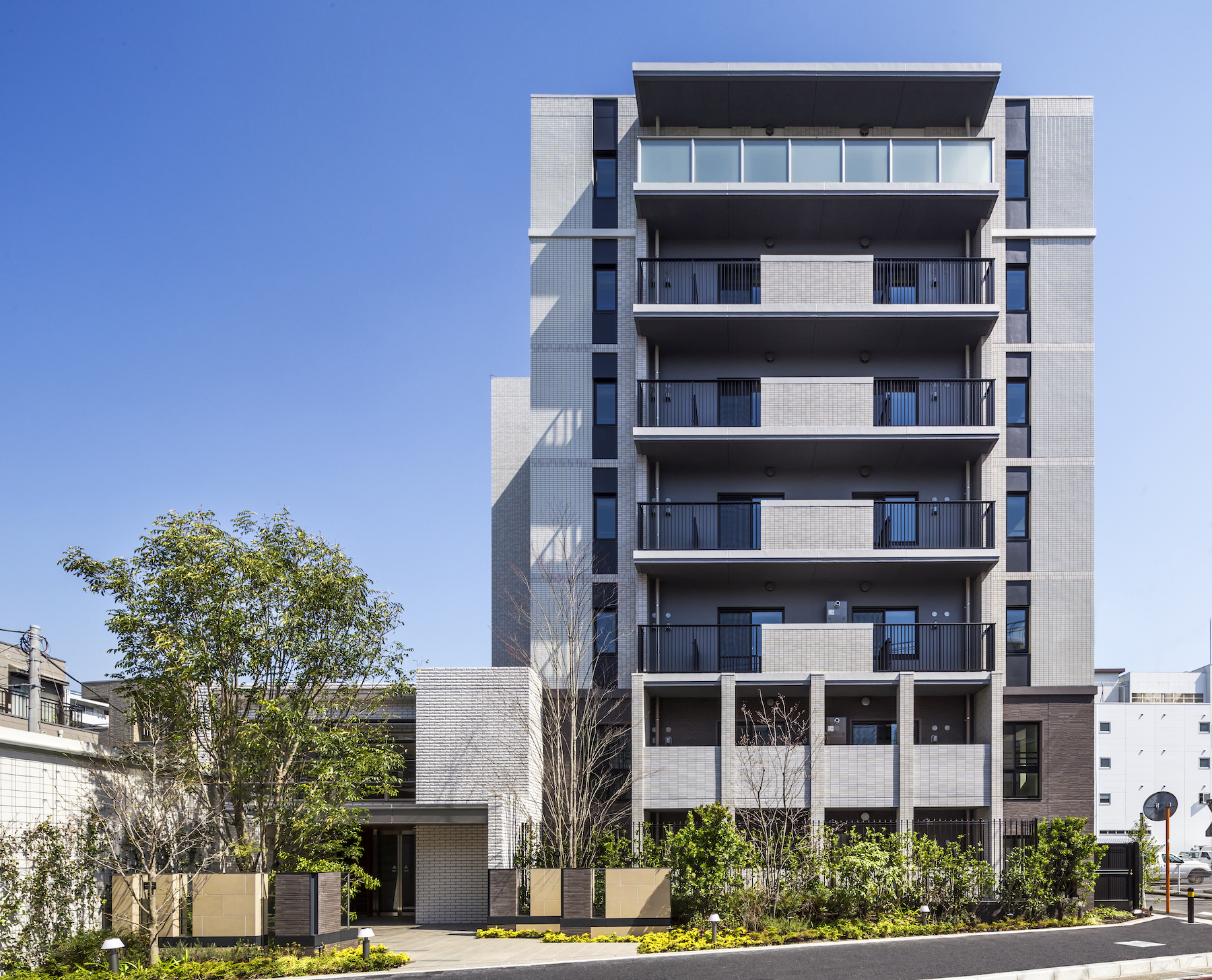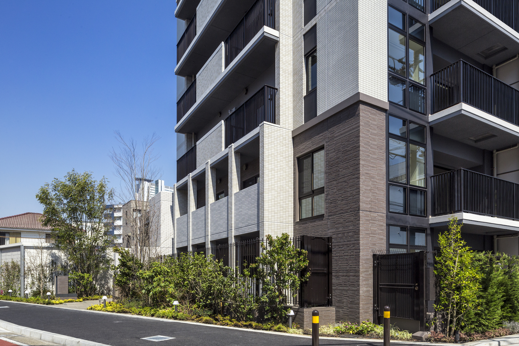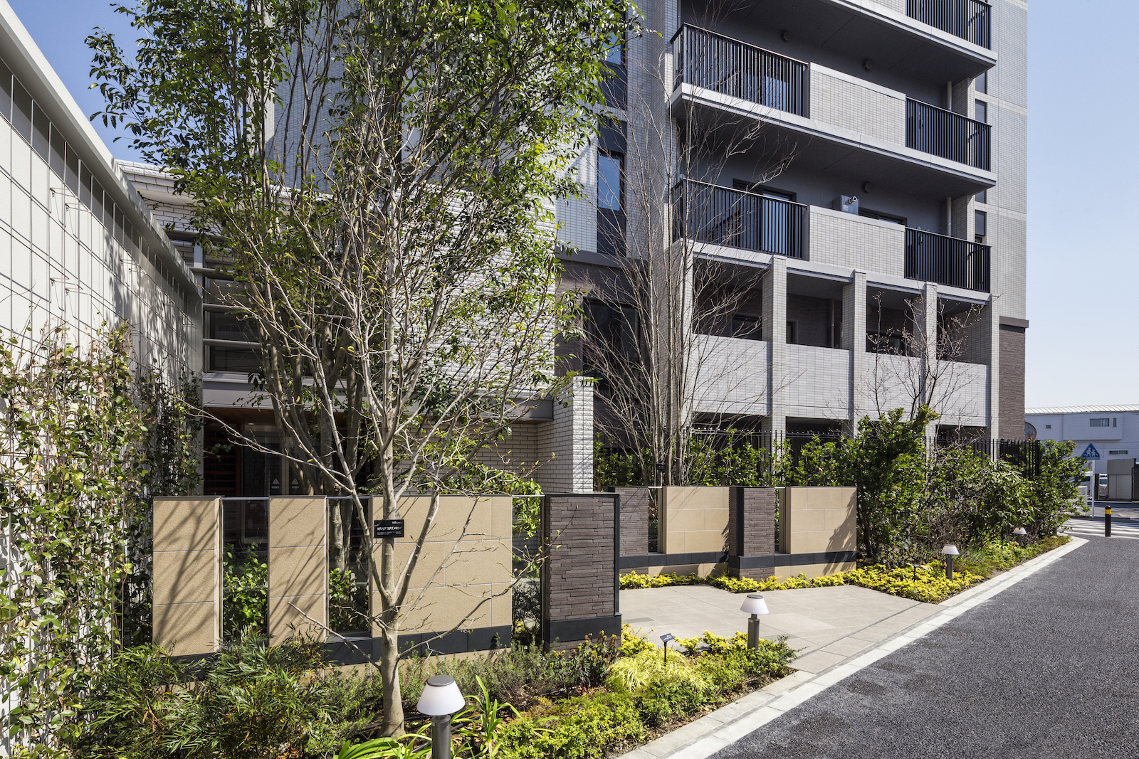 「パークホームズ元住吉テラス」は、2方向が道路に面した南西角地に位置し、全戸南向きの配棟計画。パッシブデザインによって風の通り道を作り、心地良い通風を実現しています。外観は淡いグレーを基調としながら、バルコニーの手摺りや上裏など部分的に濃いグレーを取り入れて全体を引き締めたスタイリッシュなデザインです。エントランス周りは植栽が溢れ、温かみのあるマテリアルの塀が緩やかな境界を形成。邸宅としての趣を演出し、自然豊かな環境と調和する落ち着いた佇まいです。