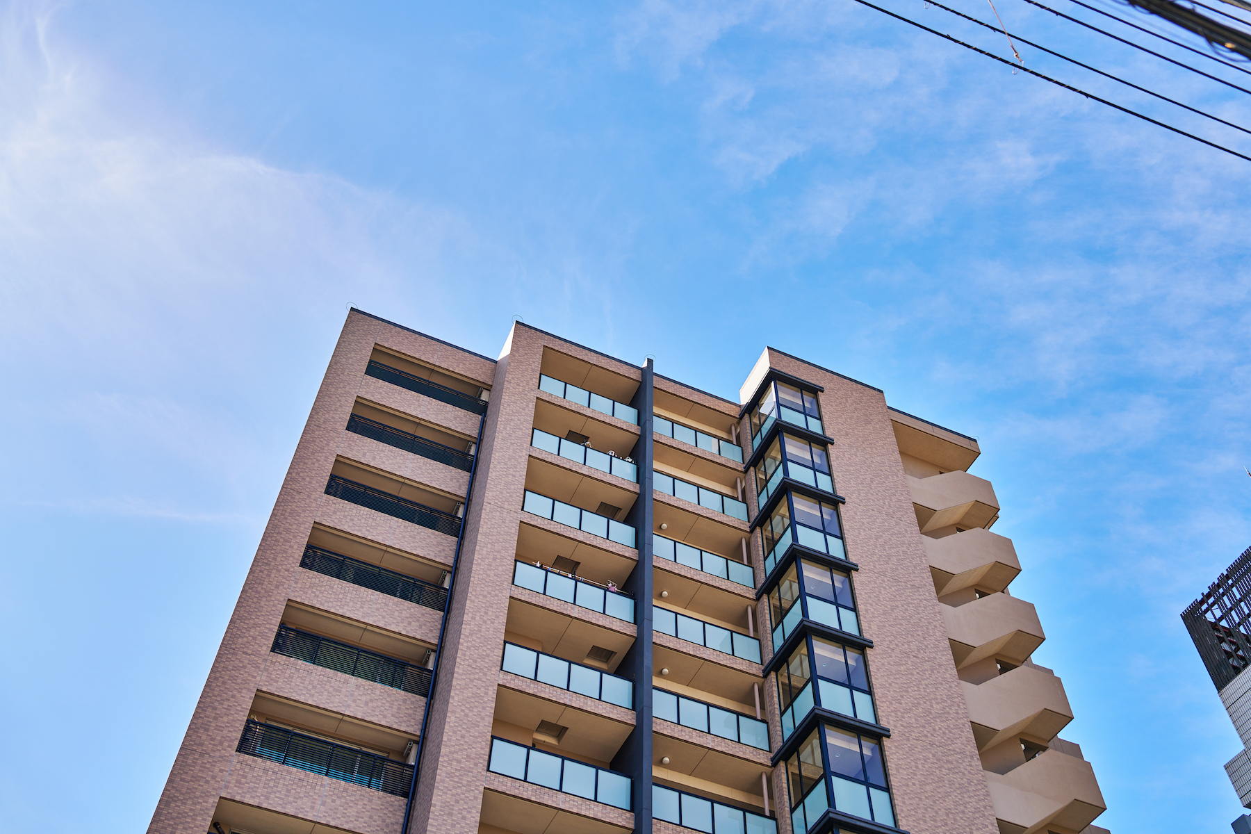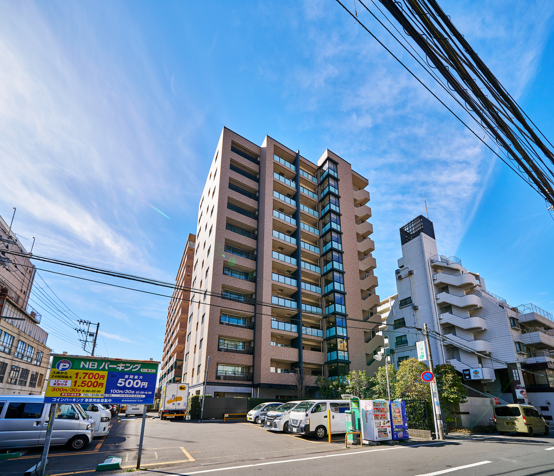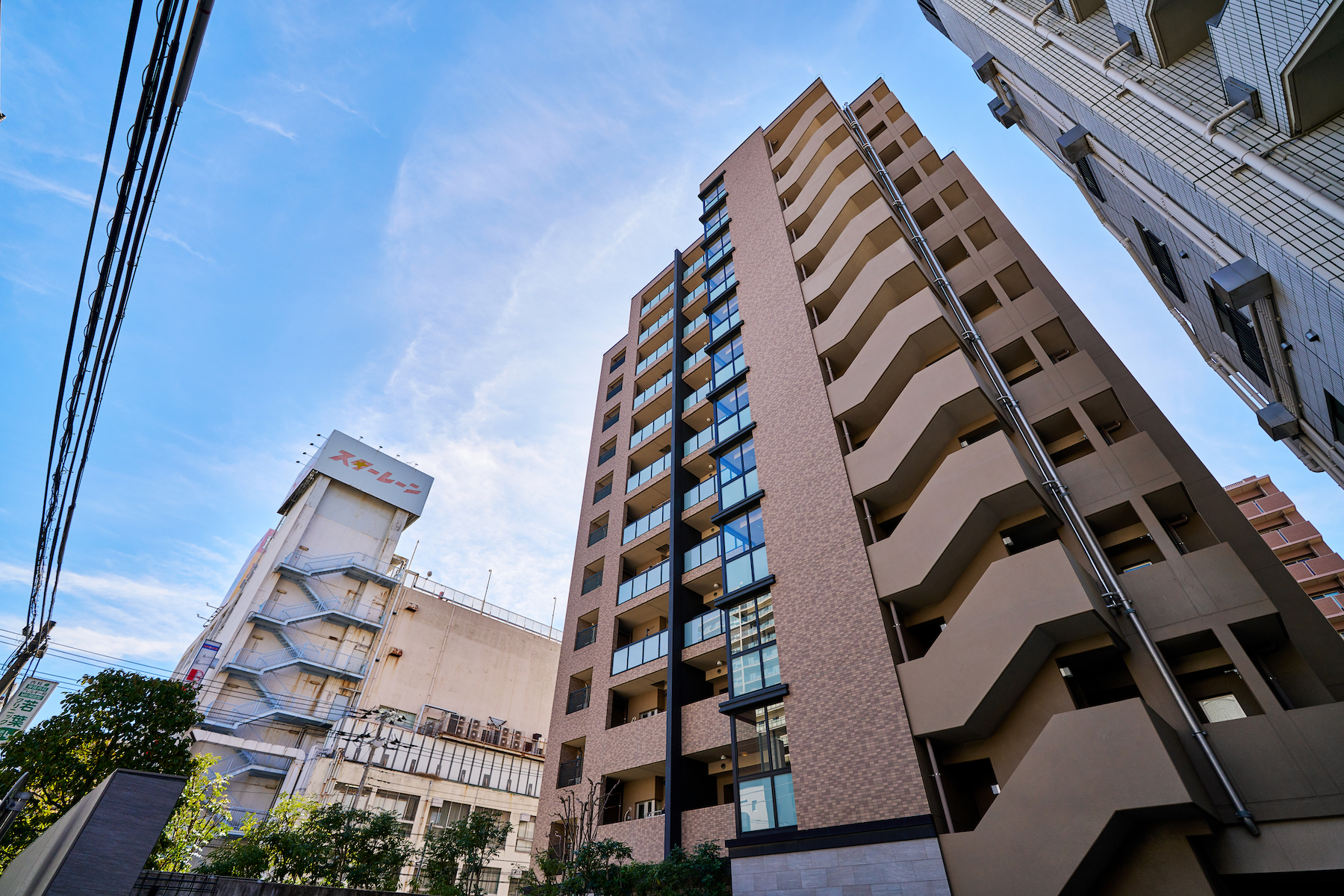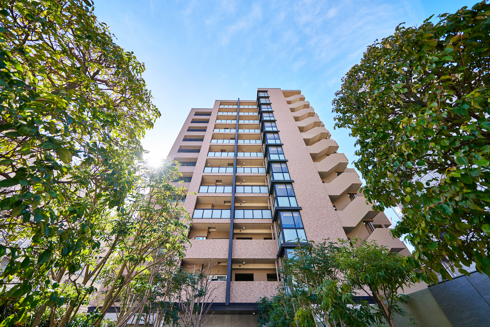 真っすぐに優美なフォルムを描く、伸びやかな壁面。アースカラーを基調とした外観のアクセントに、一筋の光が流れるようなきらめくガラスをエレベーターホール部に採用。時間とともに表情を変え、洗練された空気を醸し出しています。街の中心にあって、確かな存在感を主張するファサードデザインです。