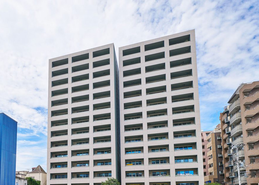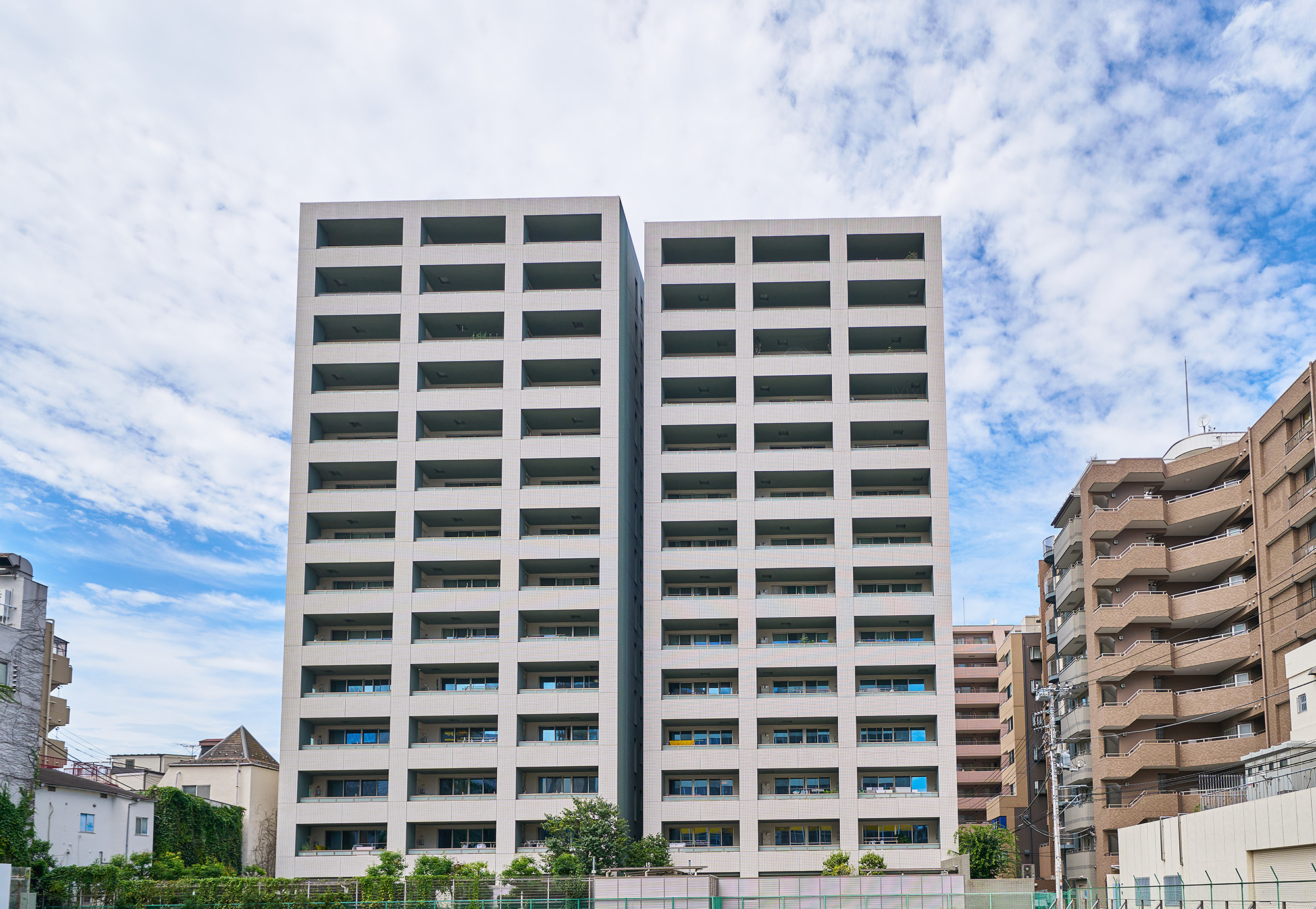 足もとの緑、空の蒼という有機的な色彩と共演する白を基調とした、ナチュラルな外観デザイン。さらに光を導く開放的なガラス手摺や緑のアクセントタイルなどを取り入れ、表情の変化を演出。全住戸を南向きにレイアウトされた2つの建物は、洗練された都市生活者の感性に呼応する住まいとして、そして、アクティブな毎日のくつろぎを深めるレジデンスとして、シンプルで美しい存在感を創出しています。
