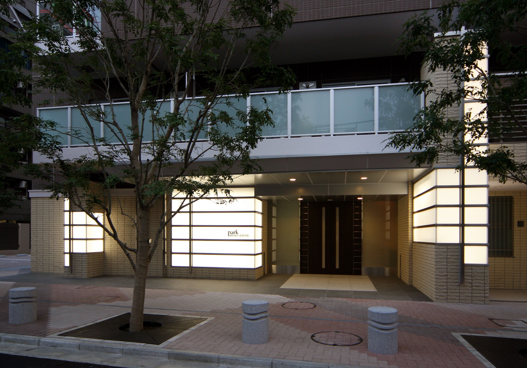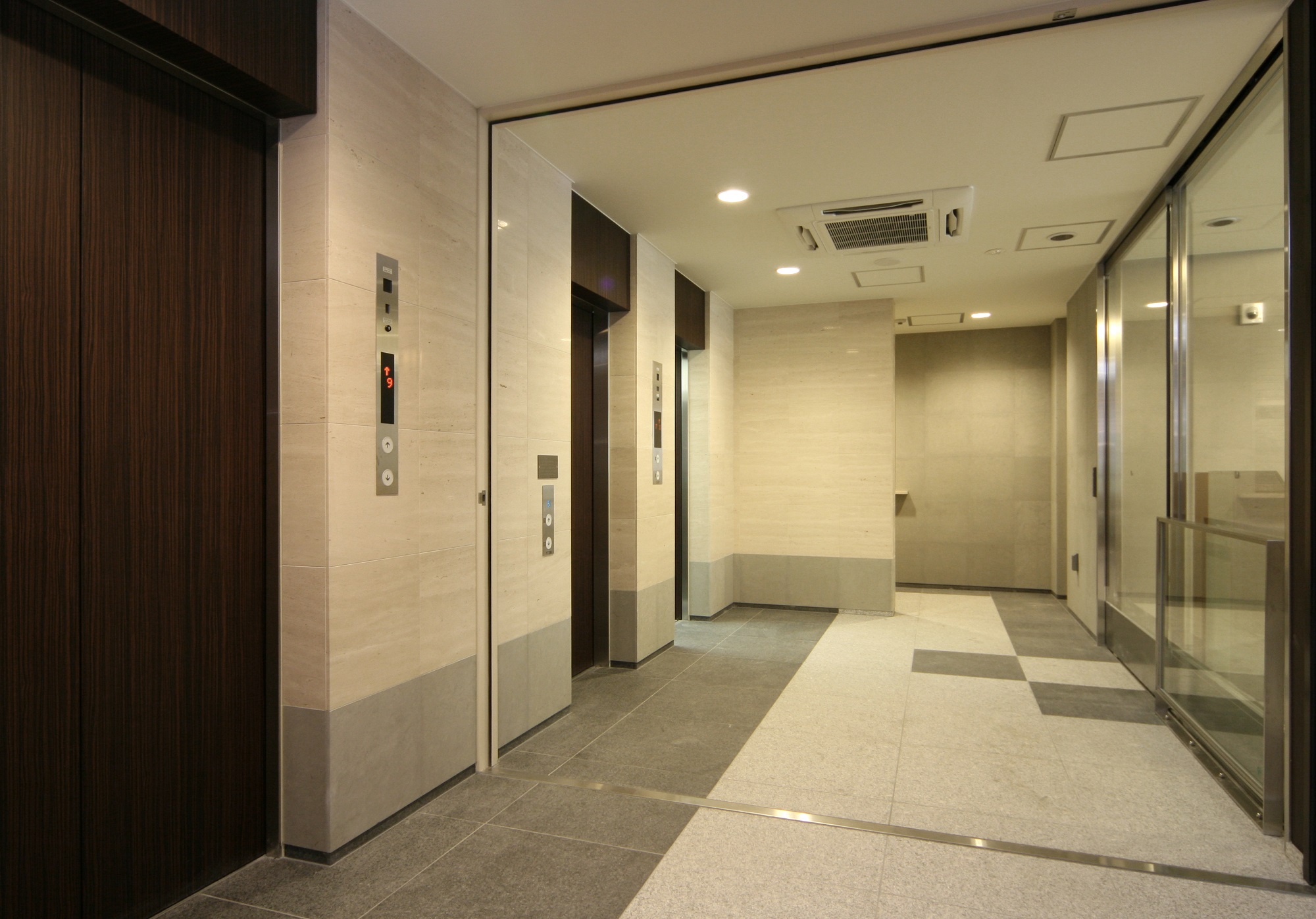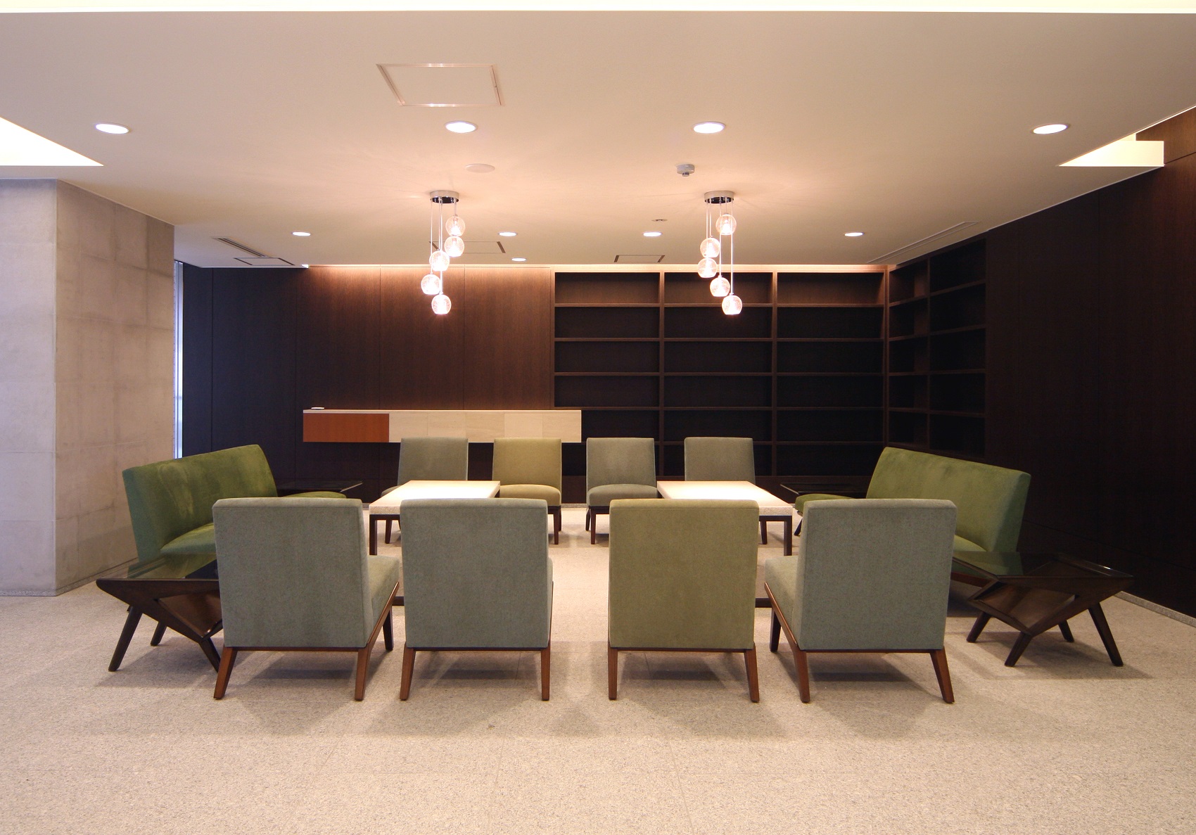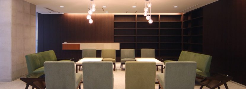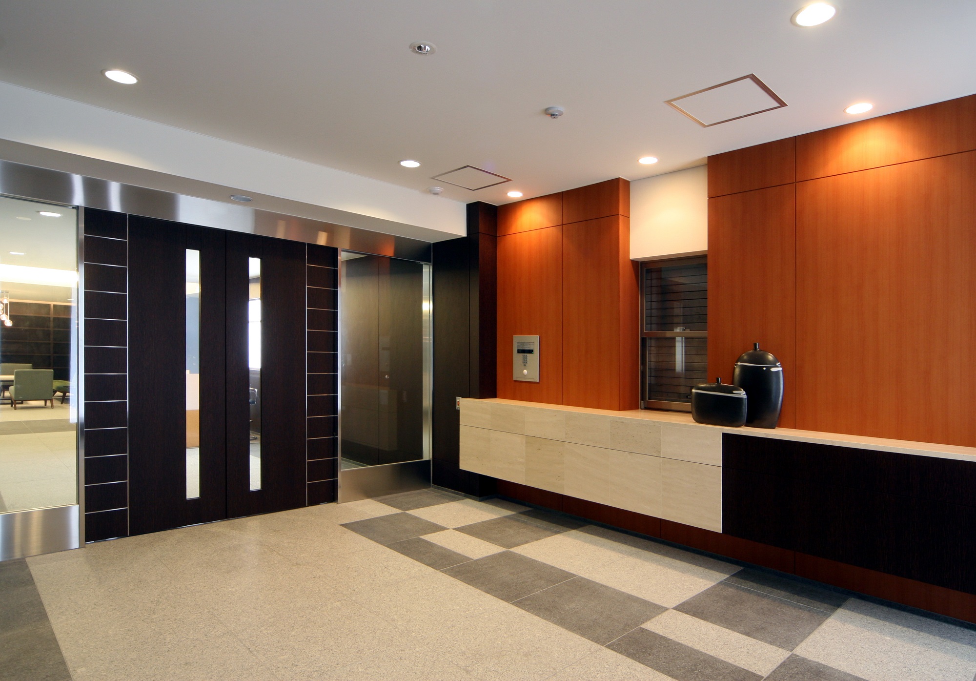 照明が組み込まれたガラスとメタルがシンボリックな表情をつくるエントランス。その先には、2種類の石で床を貼り分けて動線を暗示するアプローチと、サンクンガーデンに面してゆったりと広がるエントランスロビーが続いています。この一連の空間には、木調ベースの落ち着きの中にメタルやガラス、ライムストーンなどの硬質な素材感によるアクセントをプラス。中2階にしつらえたライブラリーコーナーとあいまって、重厚感とコンテンポラリーな雰囲気が絶妙な、大人の休息のための空間をつくりだしています。