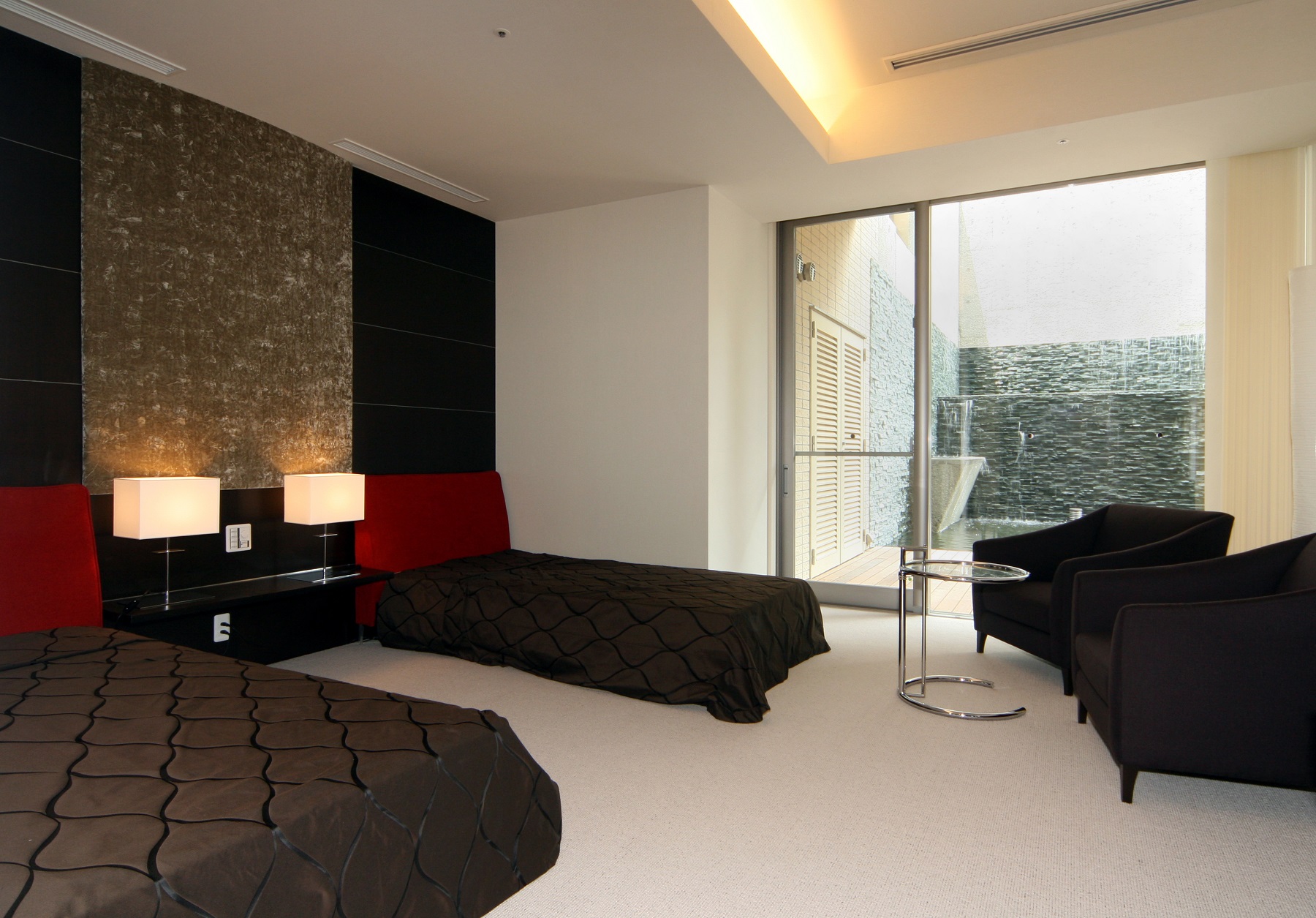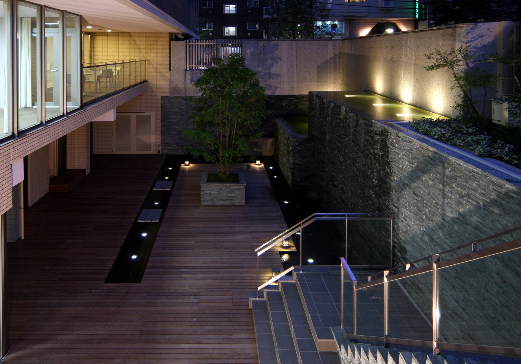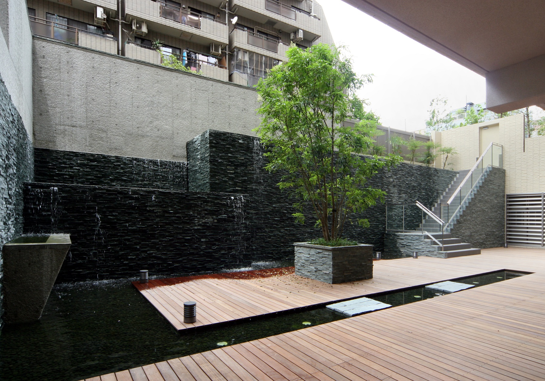 「サンクンガーデン」は、木端積みの石壁の表面を流れ落ちる滝と、デッキと同一面に設計された水盤が、目と耳と心をやさしく癒してくれる空間です。サンクンガーデンに面した地下一階には、「洋」と「和」の2つのゲストルームが設けられ、親族や友人など大切なお客様も、癒しの水景でおもてなしすることができます。
