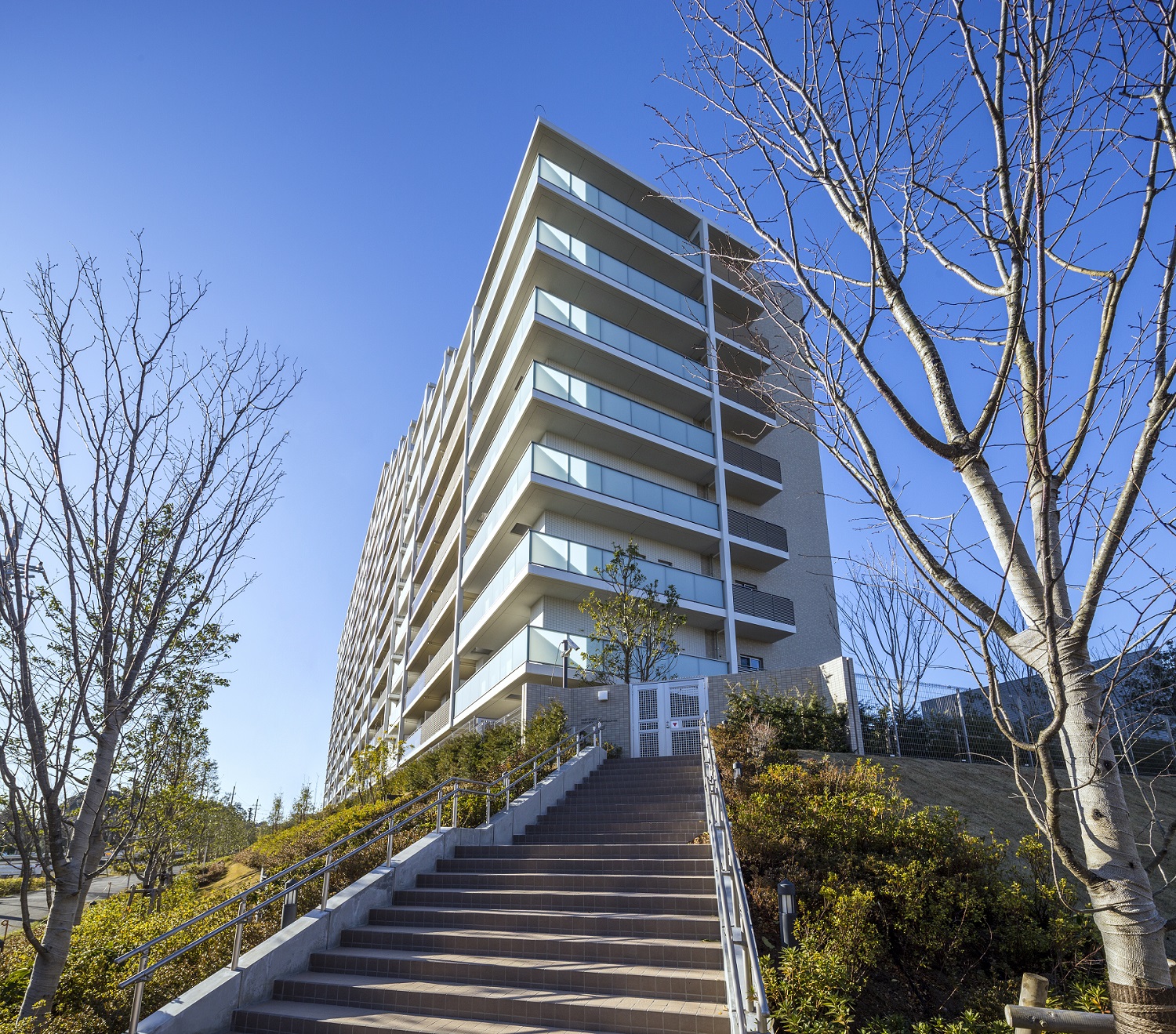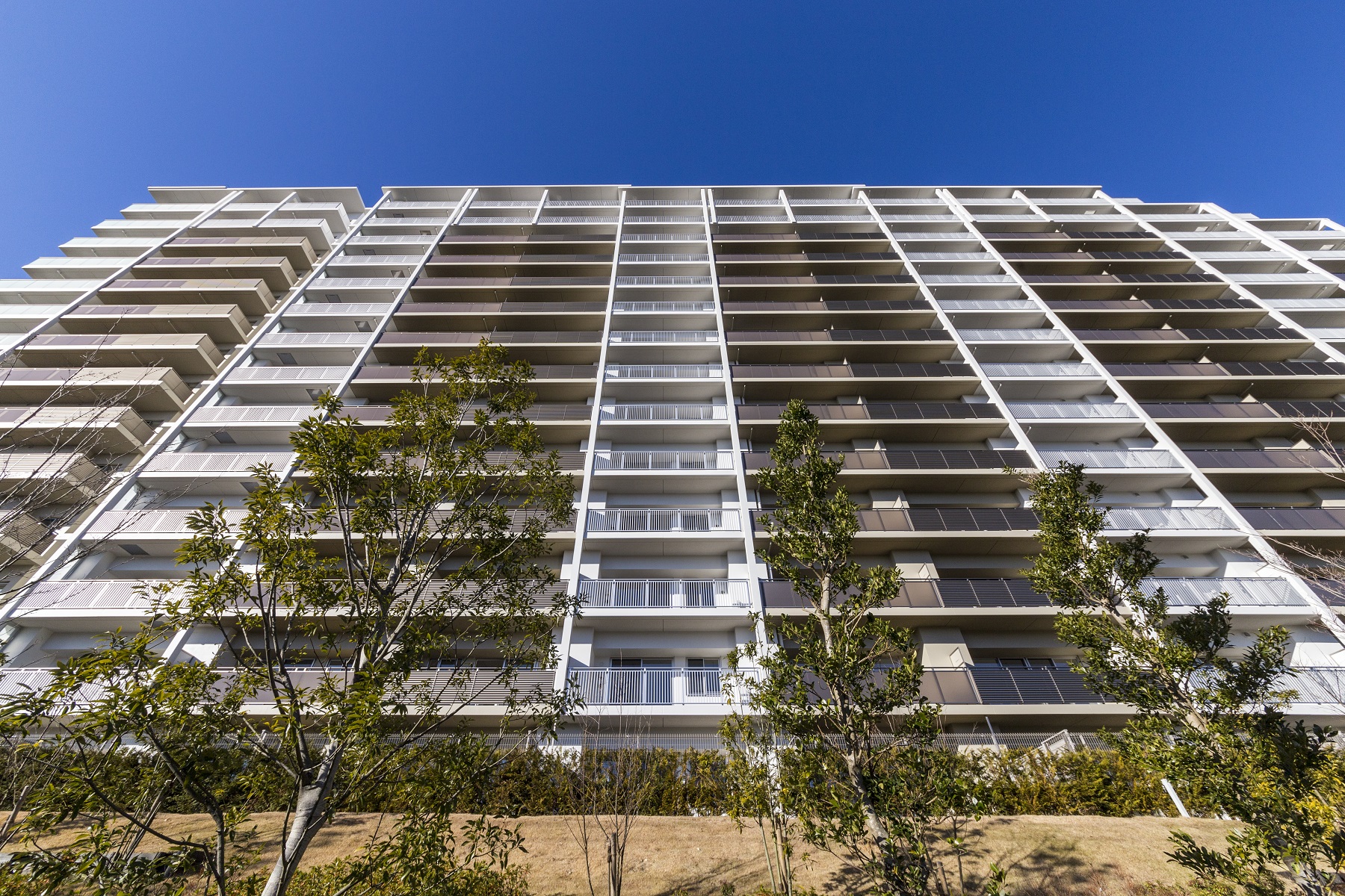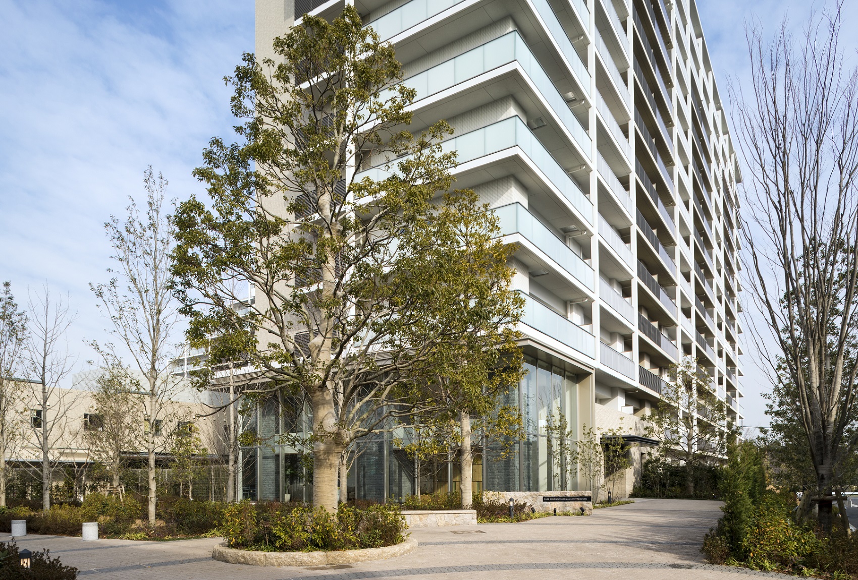 周囲に圧迫感を与えないよう、複数のマリオンを流れるようにリズミカルに配置。建物全体を流麗な印象にし、街並みとの融和を図るとともに、多彩な表情が描かれています。外壁は、ホワイトを基調にアースカラーのベージュのタイルを採用し、周辺の緑と呼応させています。共用部にも風合いのある石を採用するなど、高級感はもちろん、質感のある素材を選定。さり気なくも美しさを感じる、洗練されたデザインです。