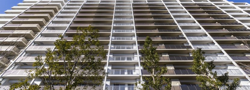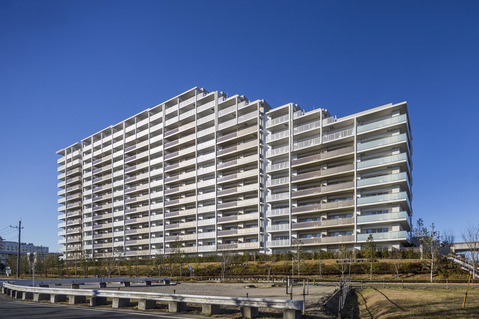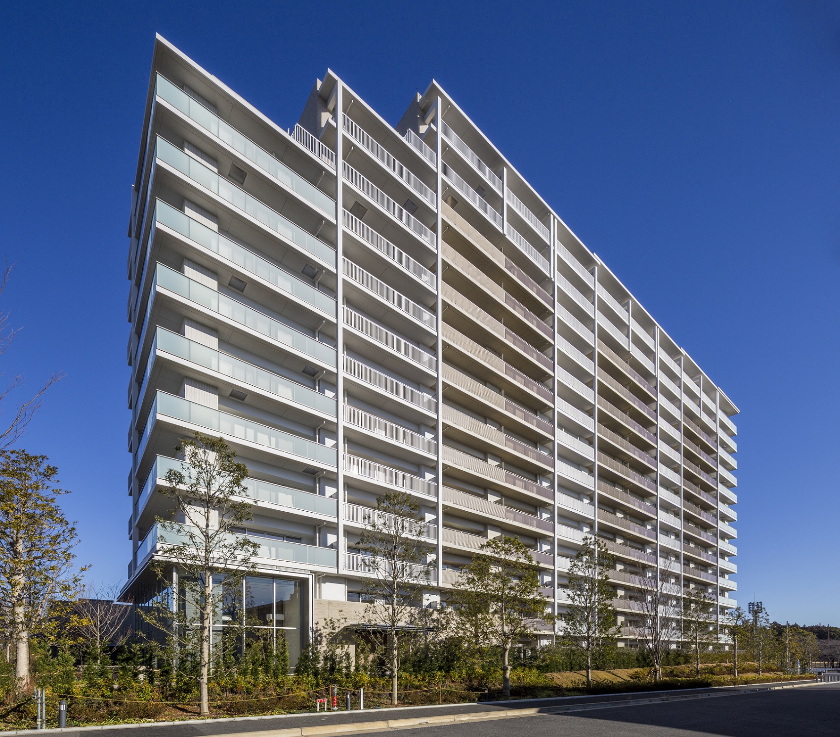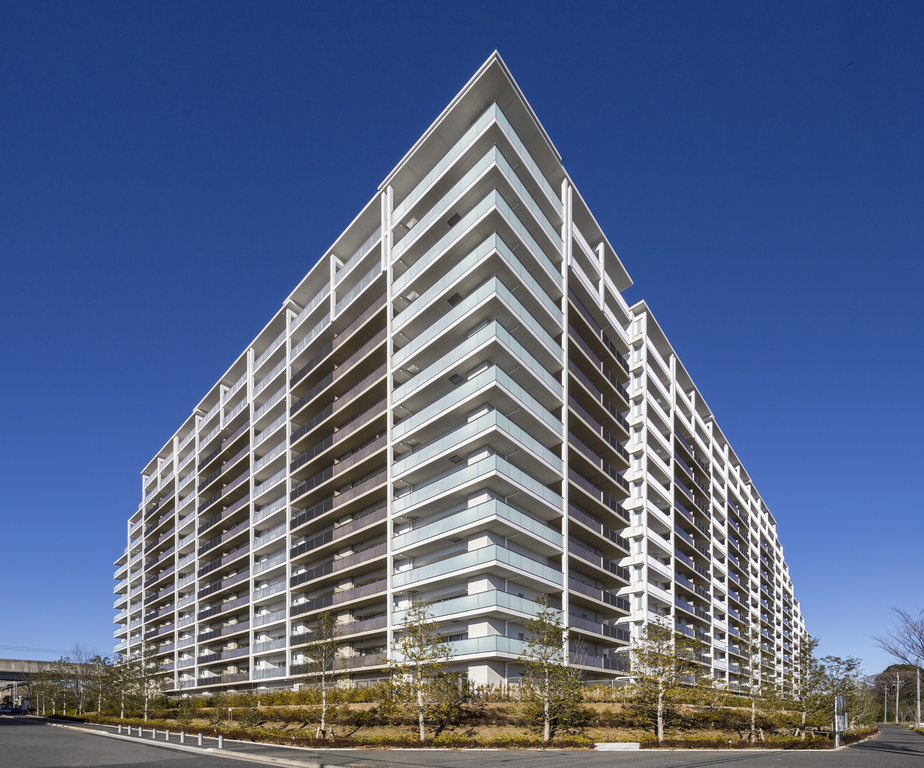 周囲に圧迫感を与えないよう、複数のマリオンを流れるようにリズミカルに配置。建物全体を流麗な印象にし、街並みとの融和を図るとともに、多彩な表情が描かれています。外壁は、ホワイトを基調にアースカラーのベージュのタイルを採用し、周辺の緑と呼応させています。共用部にも風合いのある石を採用するなど、高級感はもちろん、質感のある素材を選定。さり気なくも美しさを感じる、洗練されたデザインです。