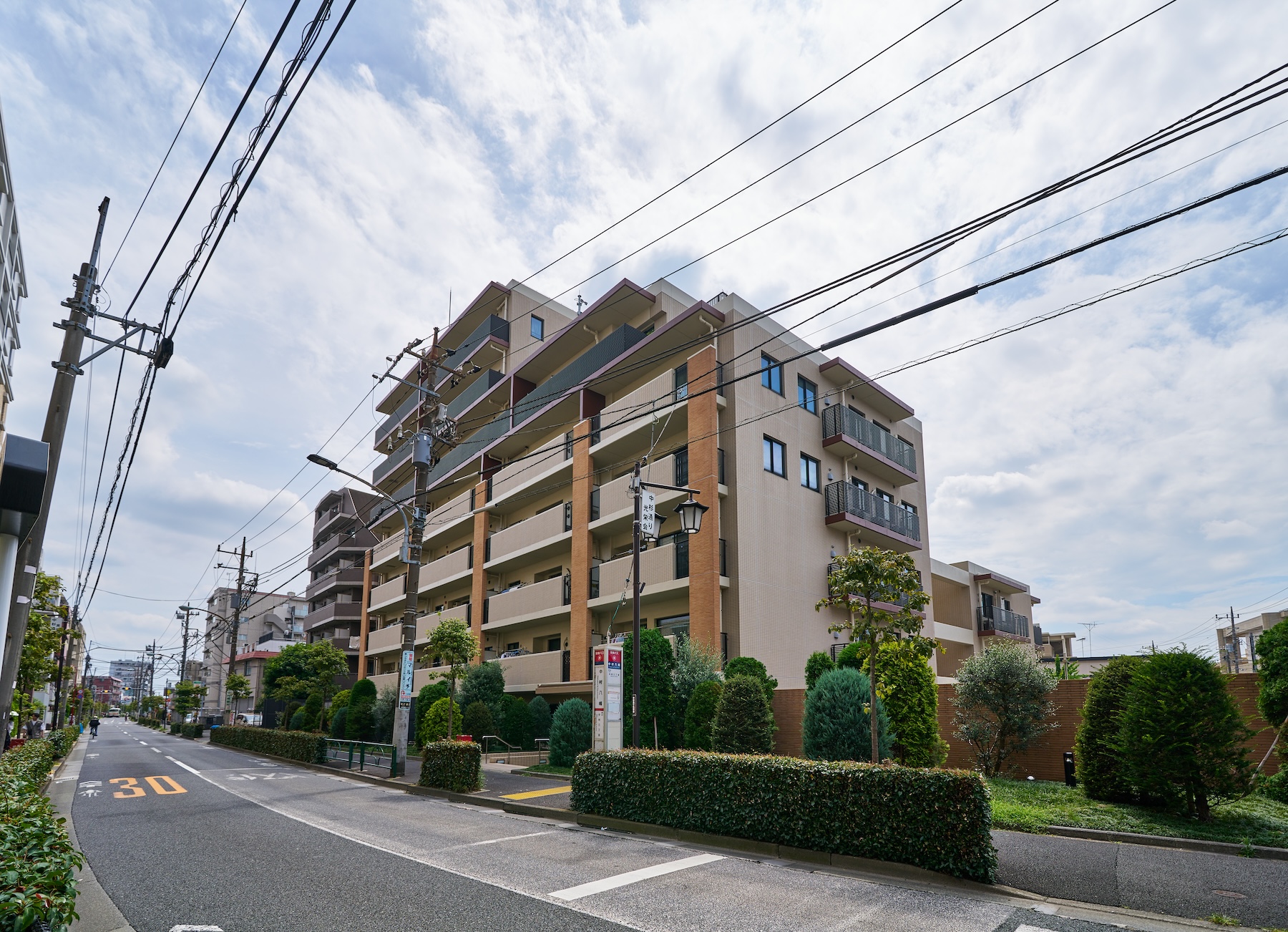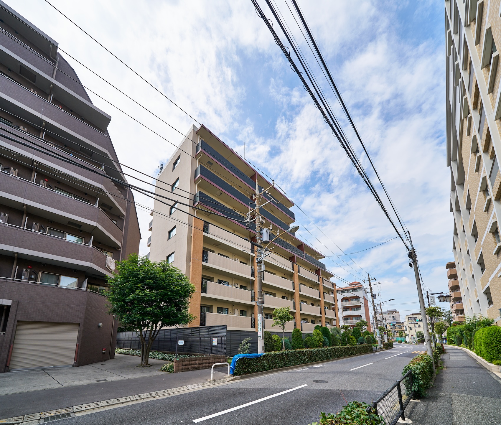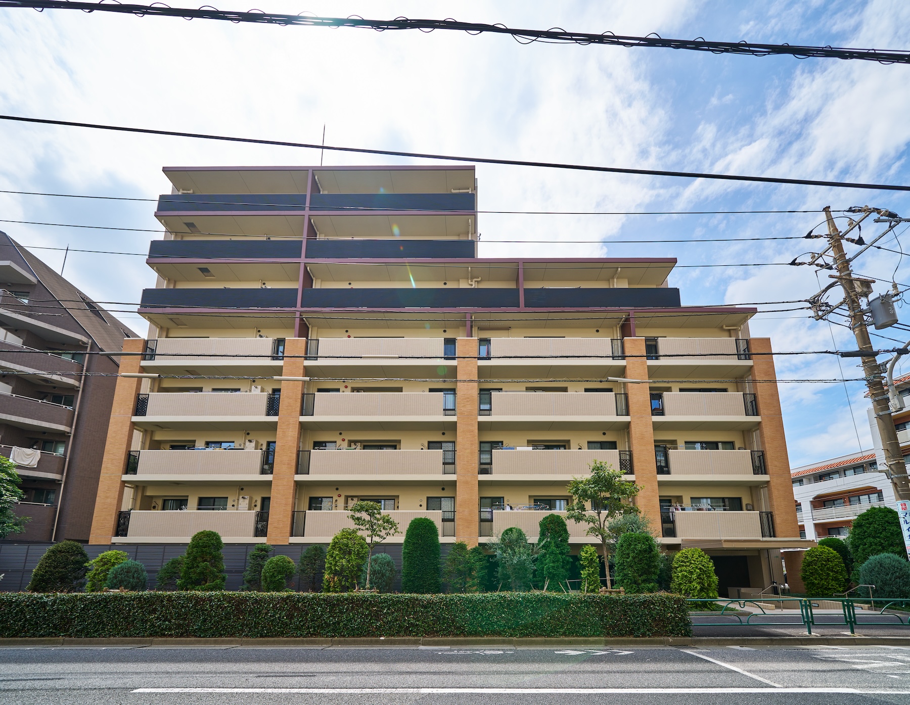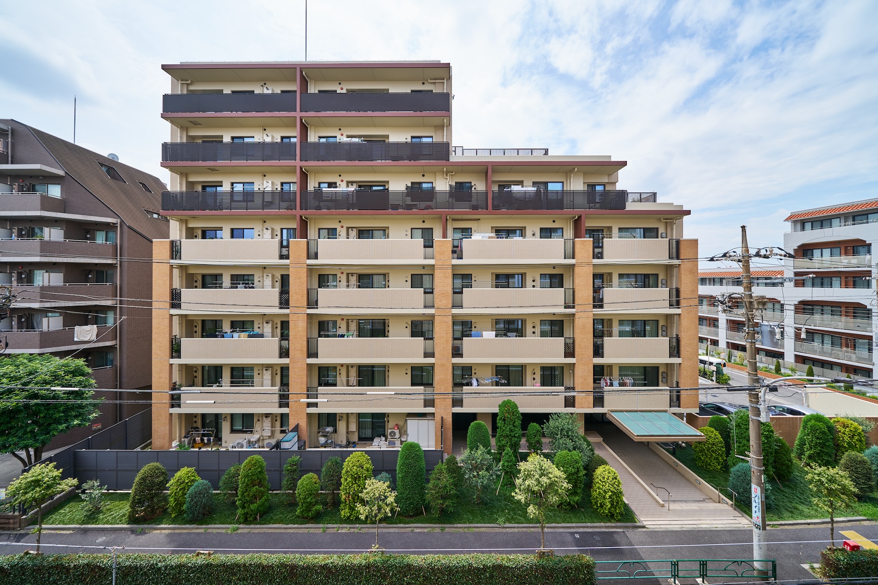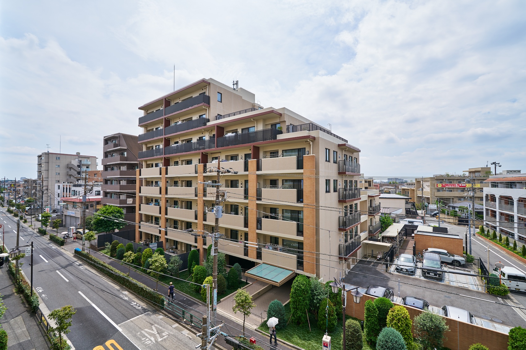 下層部には上質なブリックタイル、上層部にはインディアンレッドの吹付タイルを採用。周囲に埋没せず、それでいて主張しすぎない、環境と調和する洗練されたデザイン性を追求。堂々とした風格がありながら、風と光を優しく受け止めるような、優雅で穏やかなレジデンスが創り上げられています。