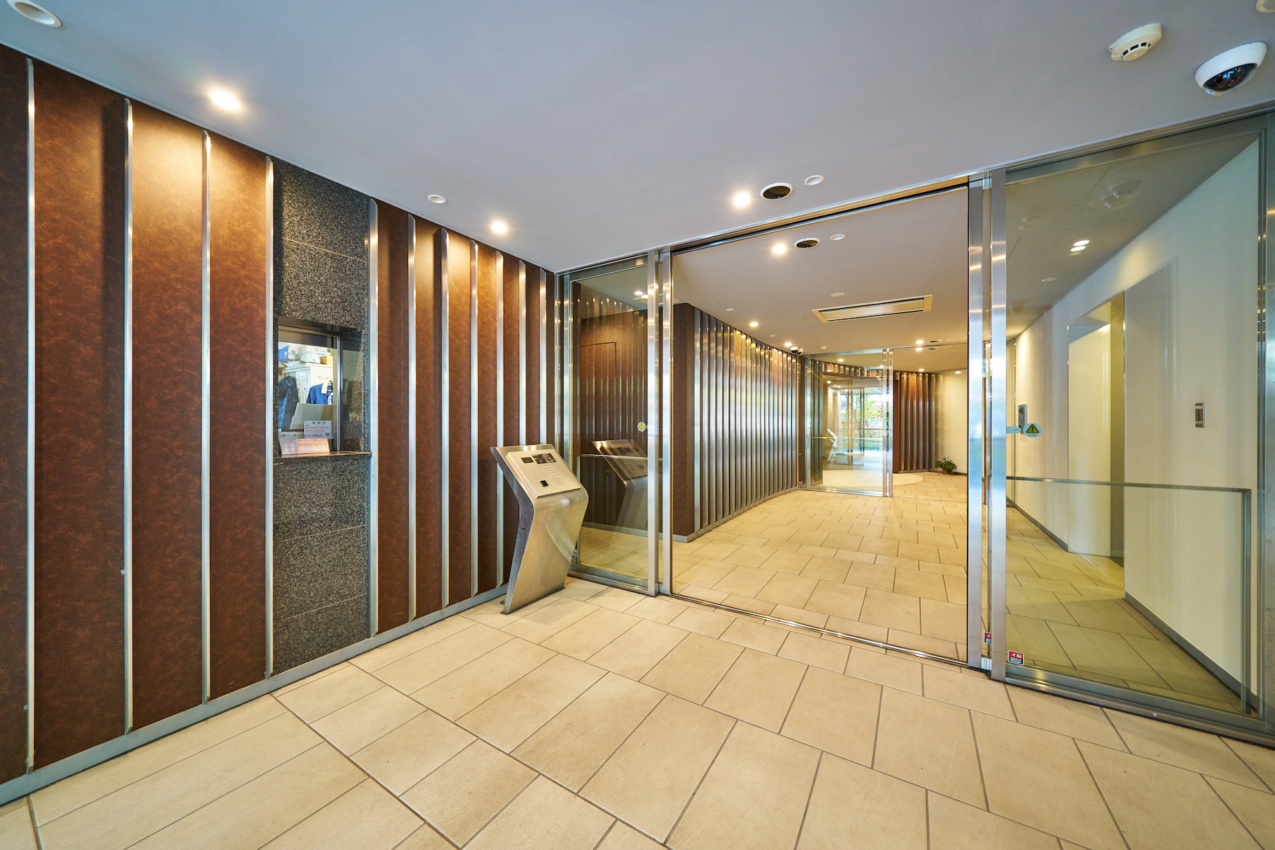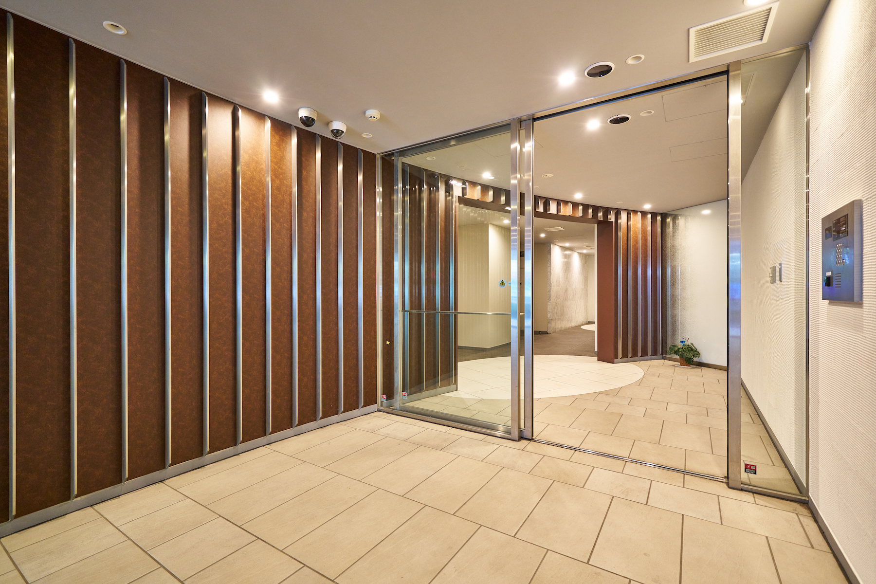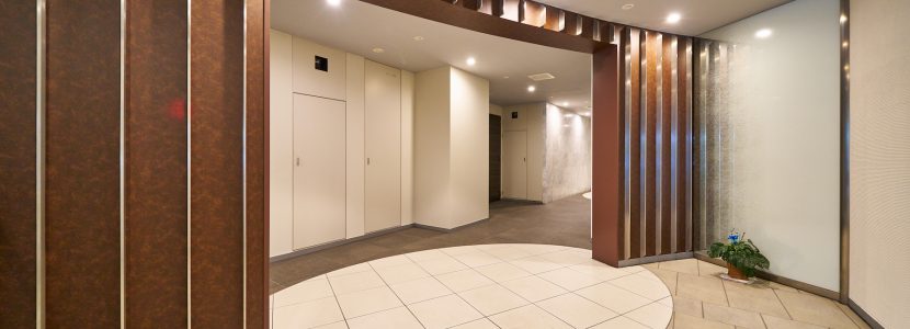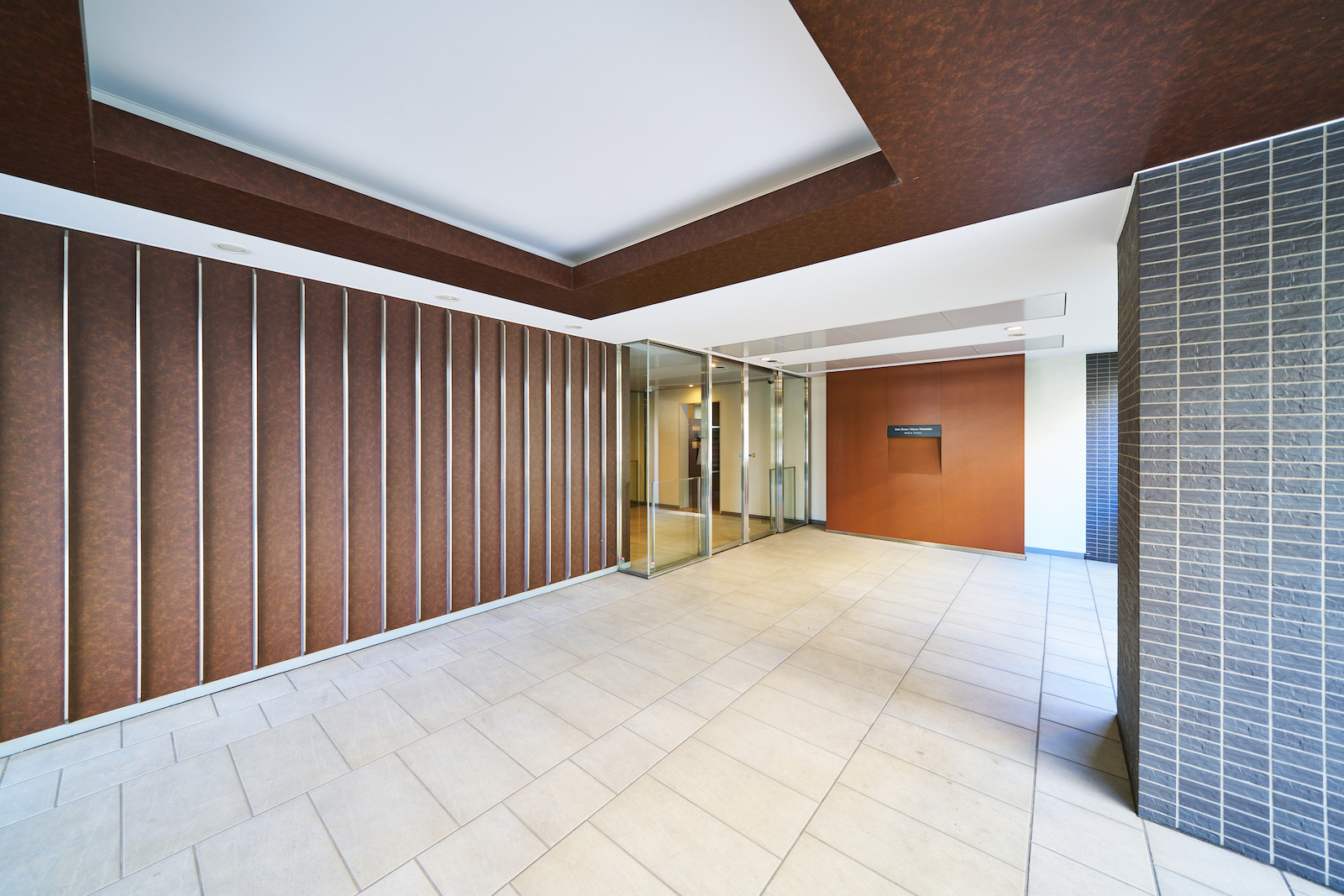 エントランスから住戸までのアプローチは、「我が家に帰ってきた」という安心感に包まれる優しい空間が形成されています。曲線を描くエントランスホールの壁面には、光沢を抑えた素材が使用され、さらにやわらかい照明が優雅さと落ち着きのある空間を演出。住戸まではタイルカーペットが敷き詰められた内廊下が続き、ホテルのような安心と洗練を与えてくれます。