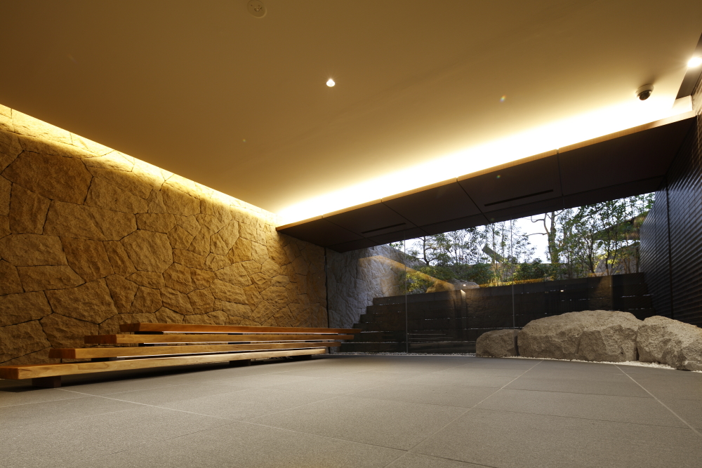 エントランスラウンジには、この地で時を積み重ねた大樹を利用したベンチを設置。住まう方に自然のぬくもりを届けます。