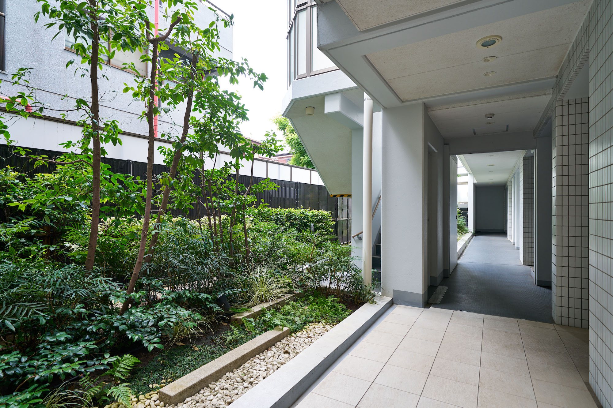 美しい桜並木に面するエントランスは、ガラス面を多用した、明るく開放感のある空間です。ガラスの向こうには桜並木や植栽がのぞき、建物内部にも緑の潤いを届けてくれます。共用廊下にも随所に豊かな植栽が配されており、自然が常に身近にあって暮らしにやすらぎを与えてくれます。