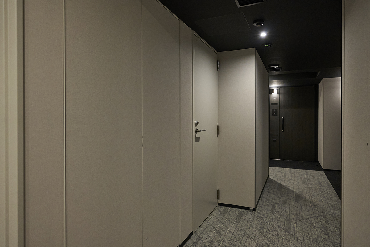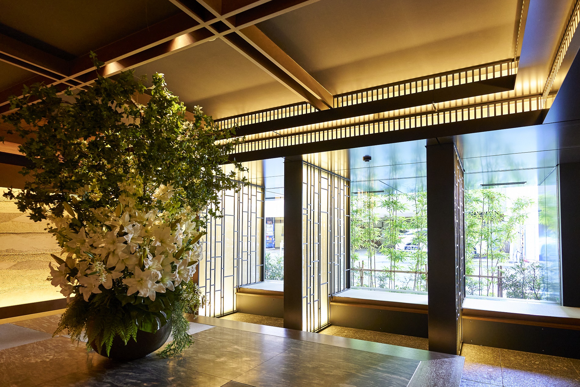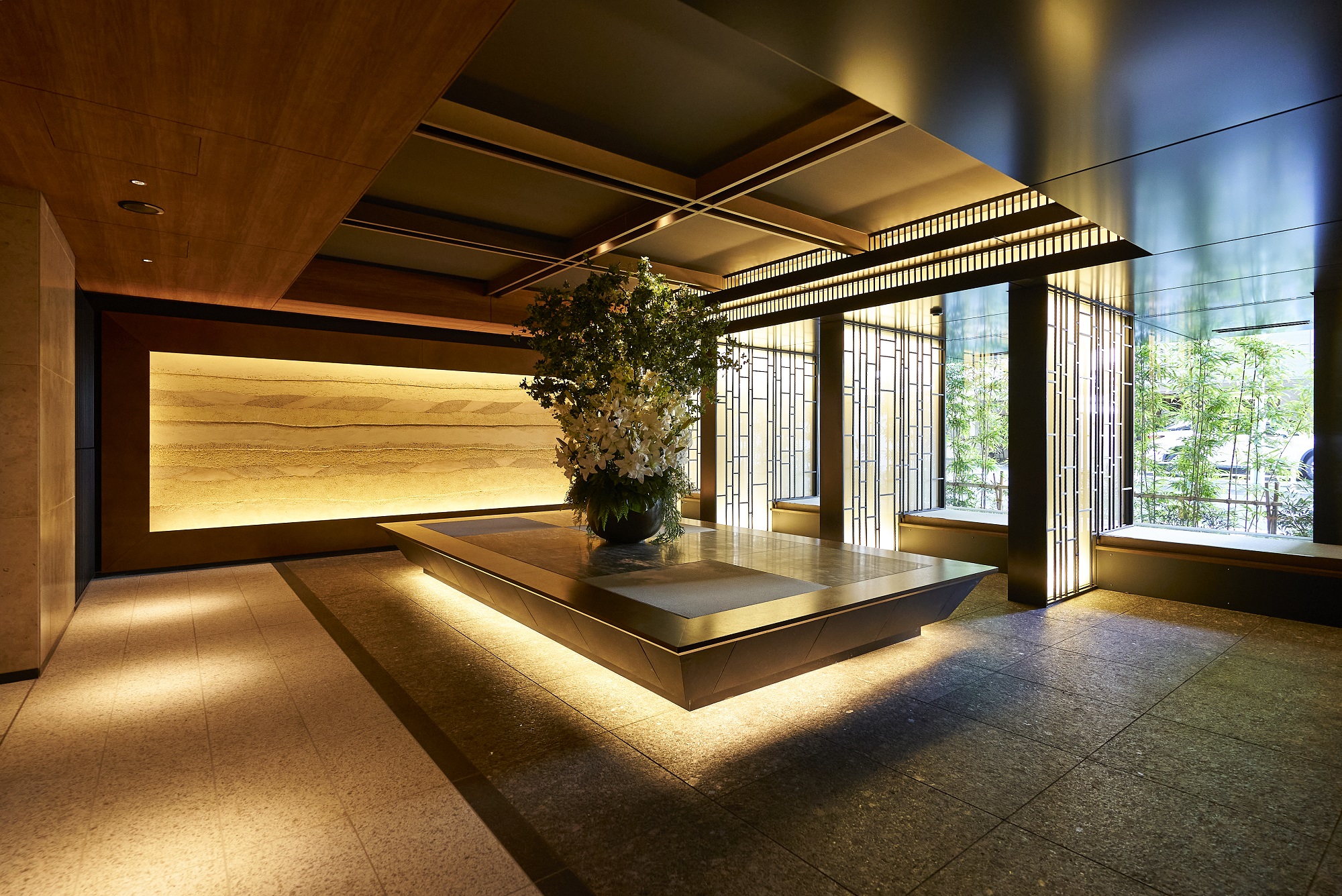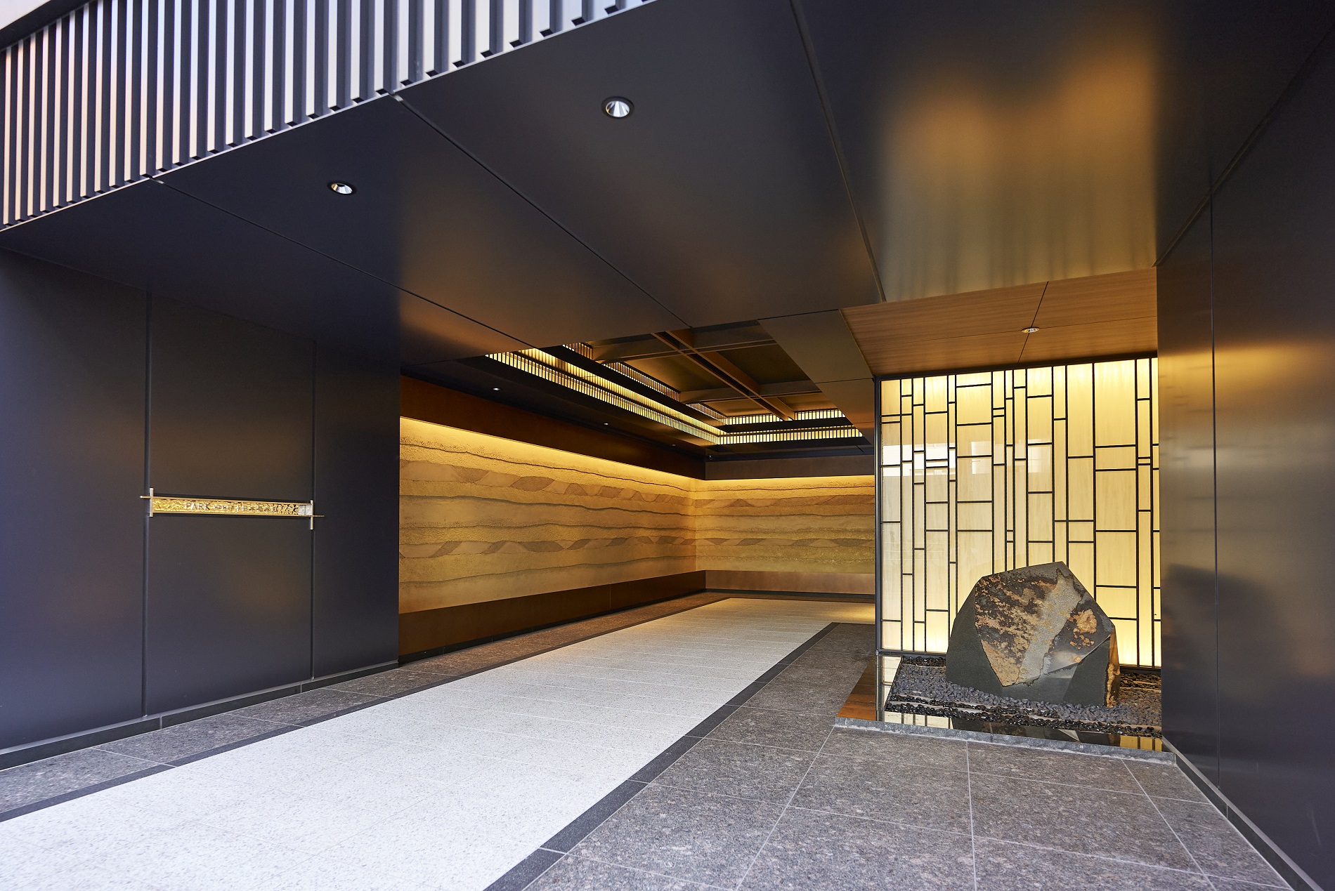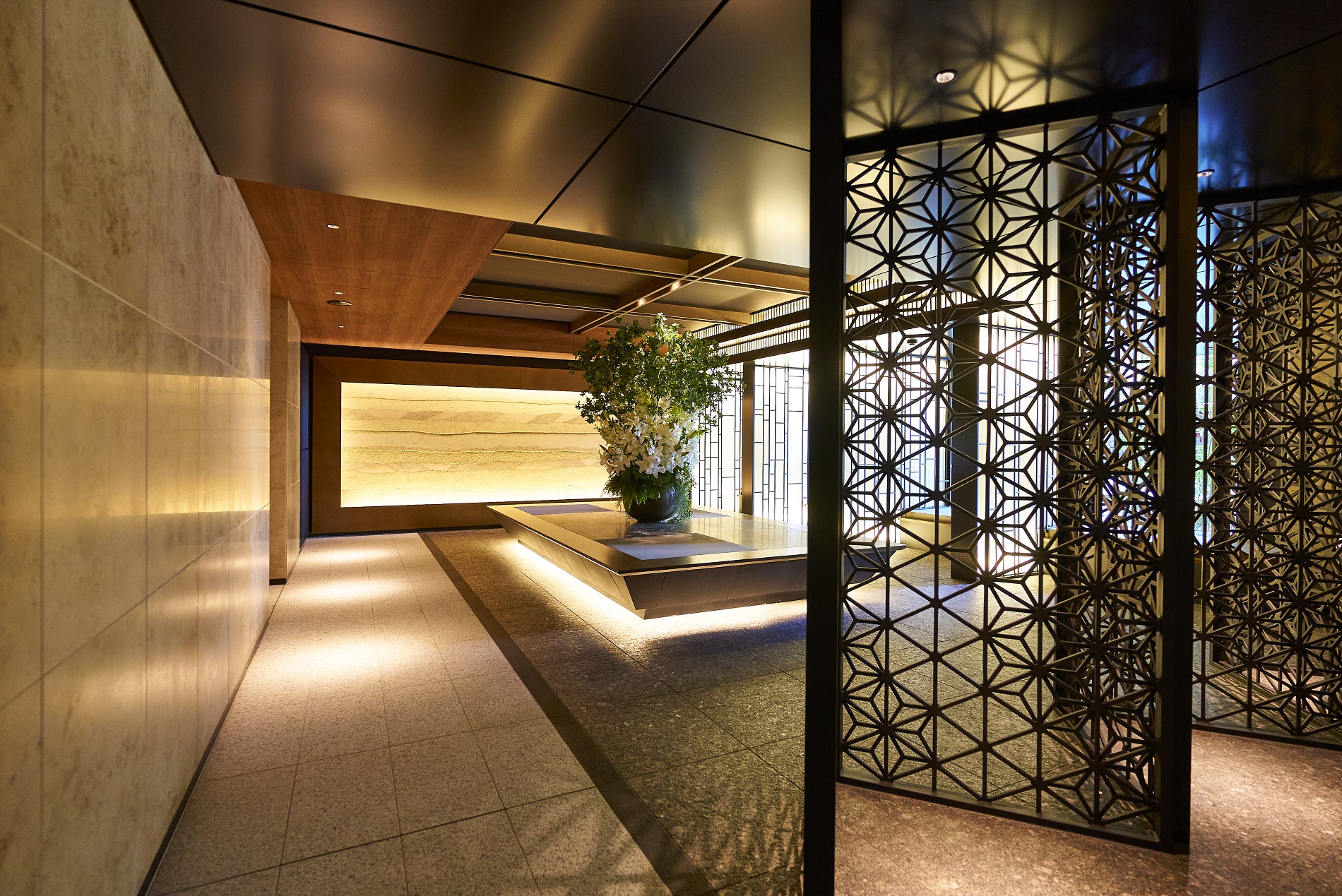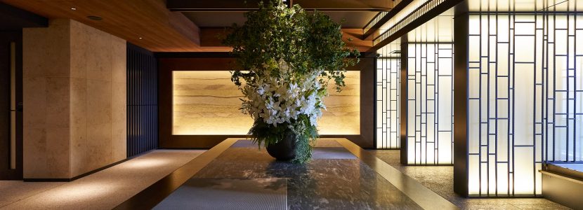 時代を超えて色あせないマテリアルを用い、エッジの効いたモダンデザインのラウンジ。静謐さの中に品格と重厚さを宿し、周辺と切り離された別世界の寛ぎで住まう方をつつみこむような空間です。他にも、格子細工や石庭を配したエントランス、美しい江戸切子が飾られたエレベーターホールなど、細部まで趣向を凝らした上質な共用空間が備わっています。