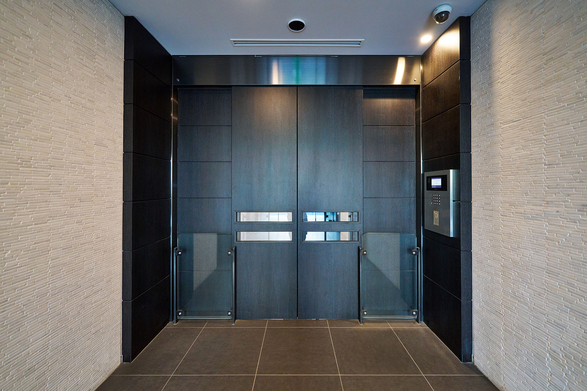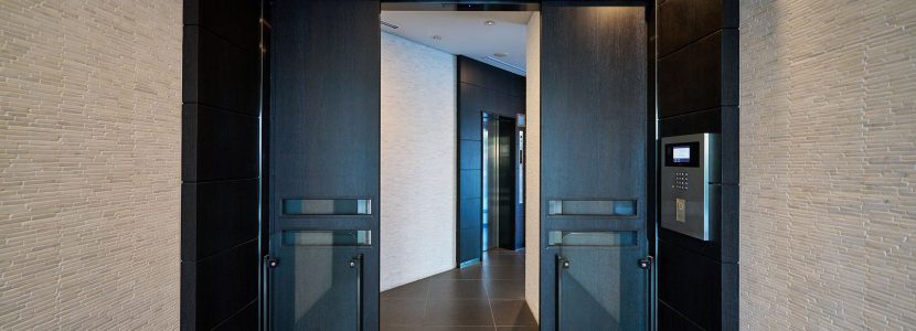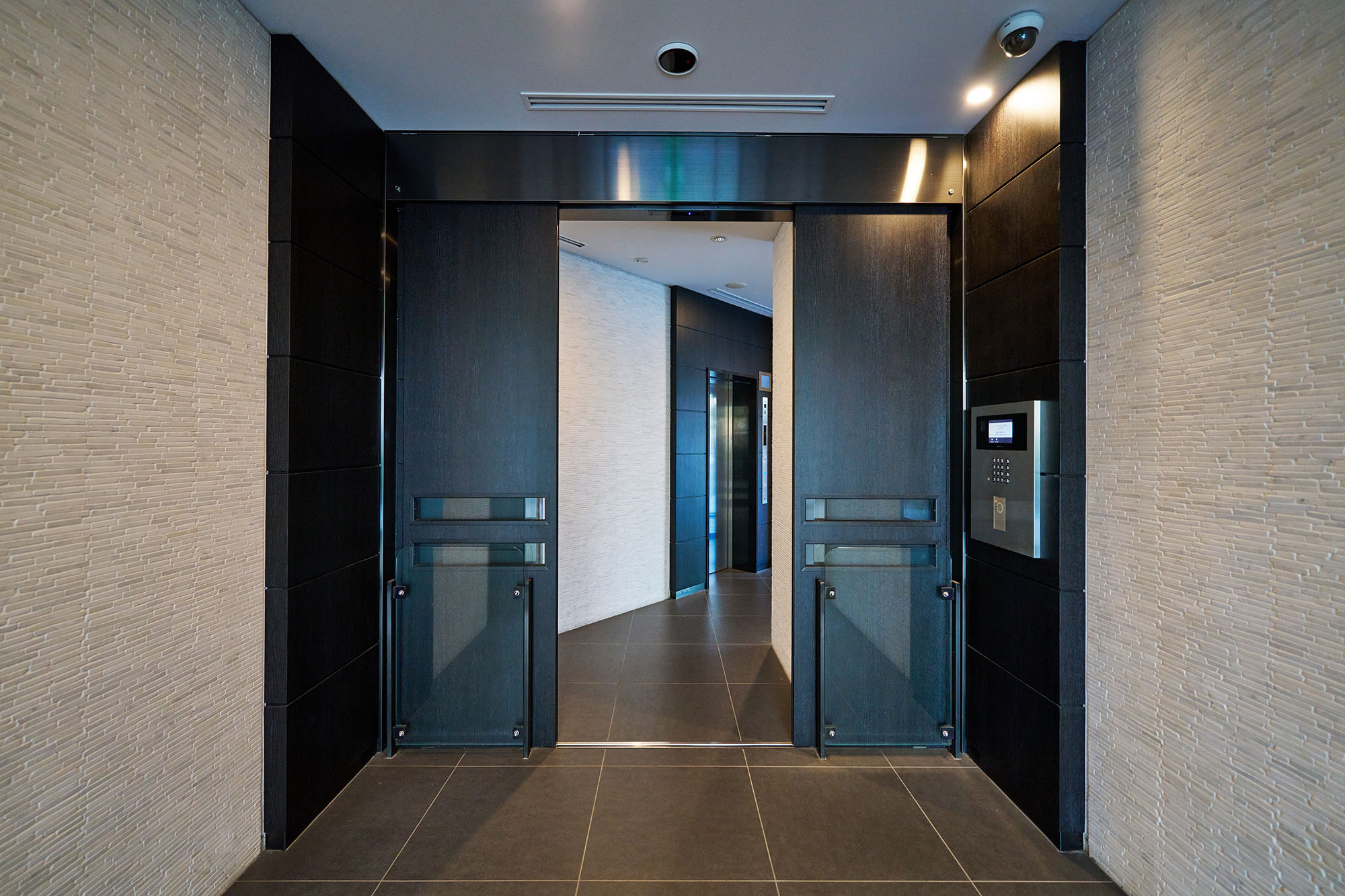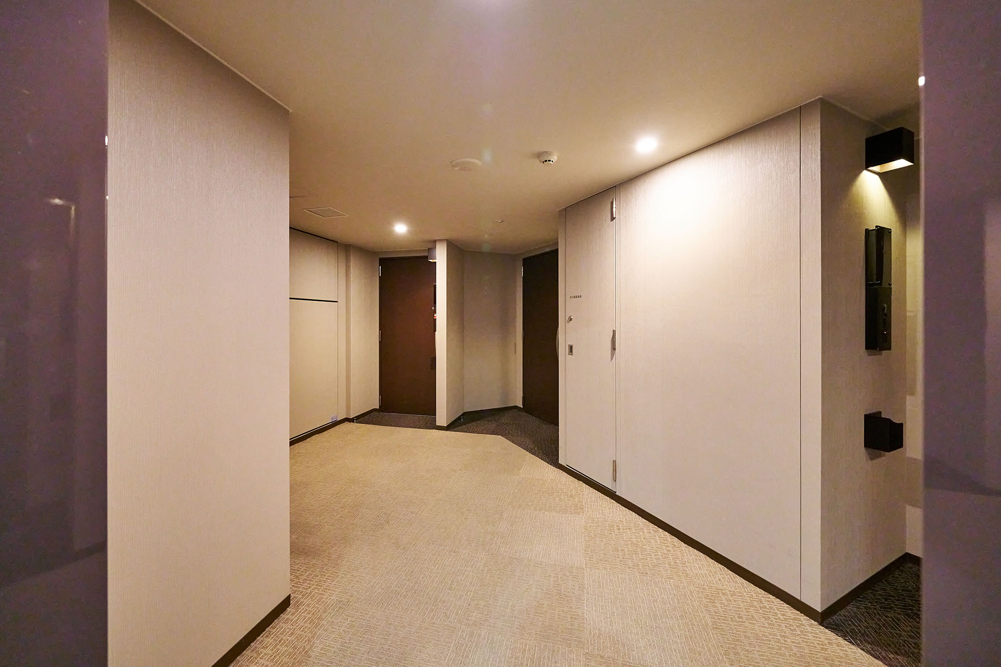 艶やかな黒い御影石と、素材感のあるグレーのボーダータイルを組み合わせたシックなエントランス。風除室にも、江戸時代の墨絵を連想させるような黒の扉が施されており、厳かな雰囲気が住まいへの誇りを醸成します。住戸までのアプローチは、上質感を演出するカーペットと、温かみのある照明によってホテルのような雰囲気を漂わせる内廊下設計。雨風の心配もなく、外部からの視線にもさらされない高いプライバシー性が確保されています。
