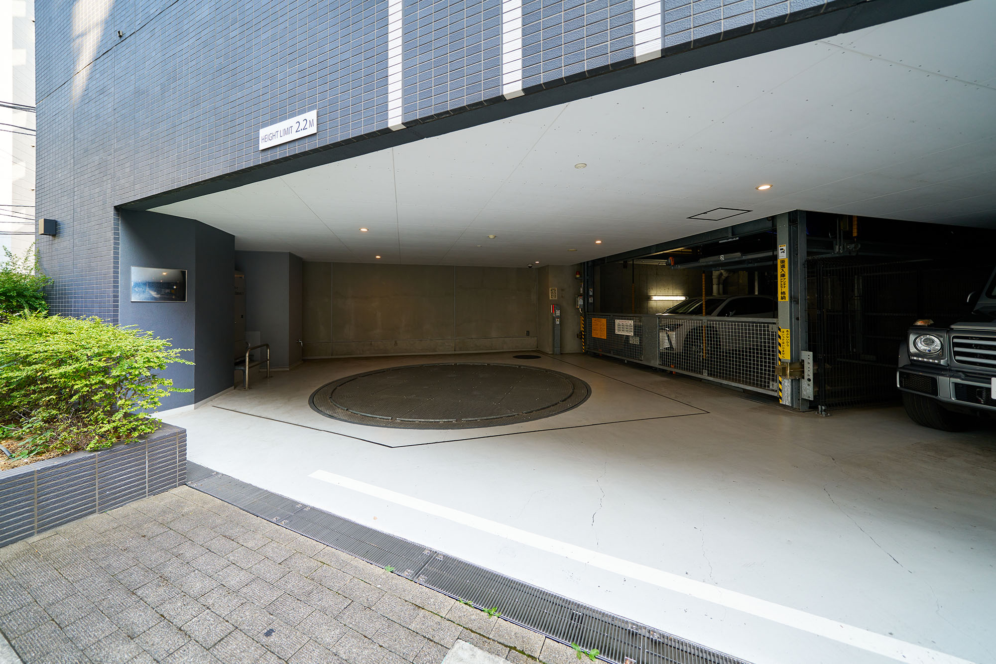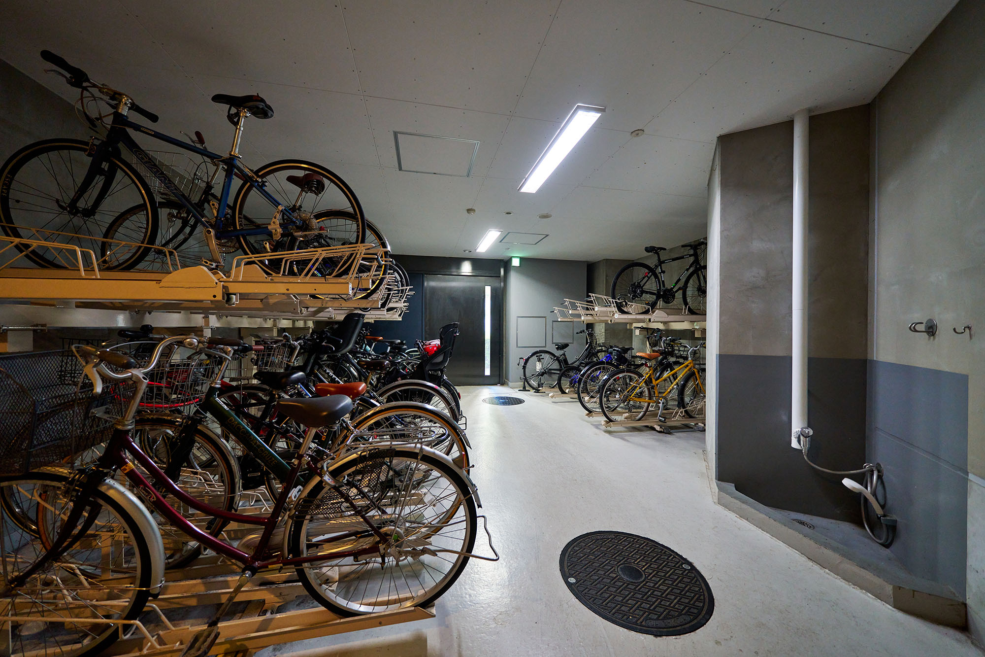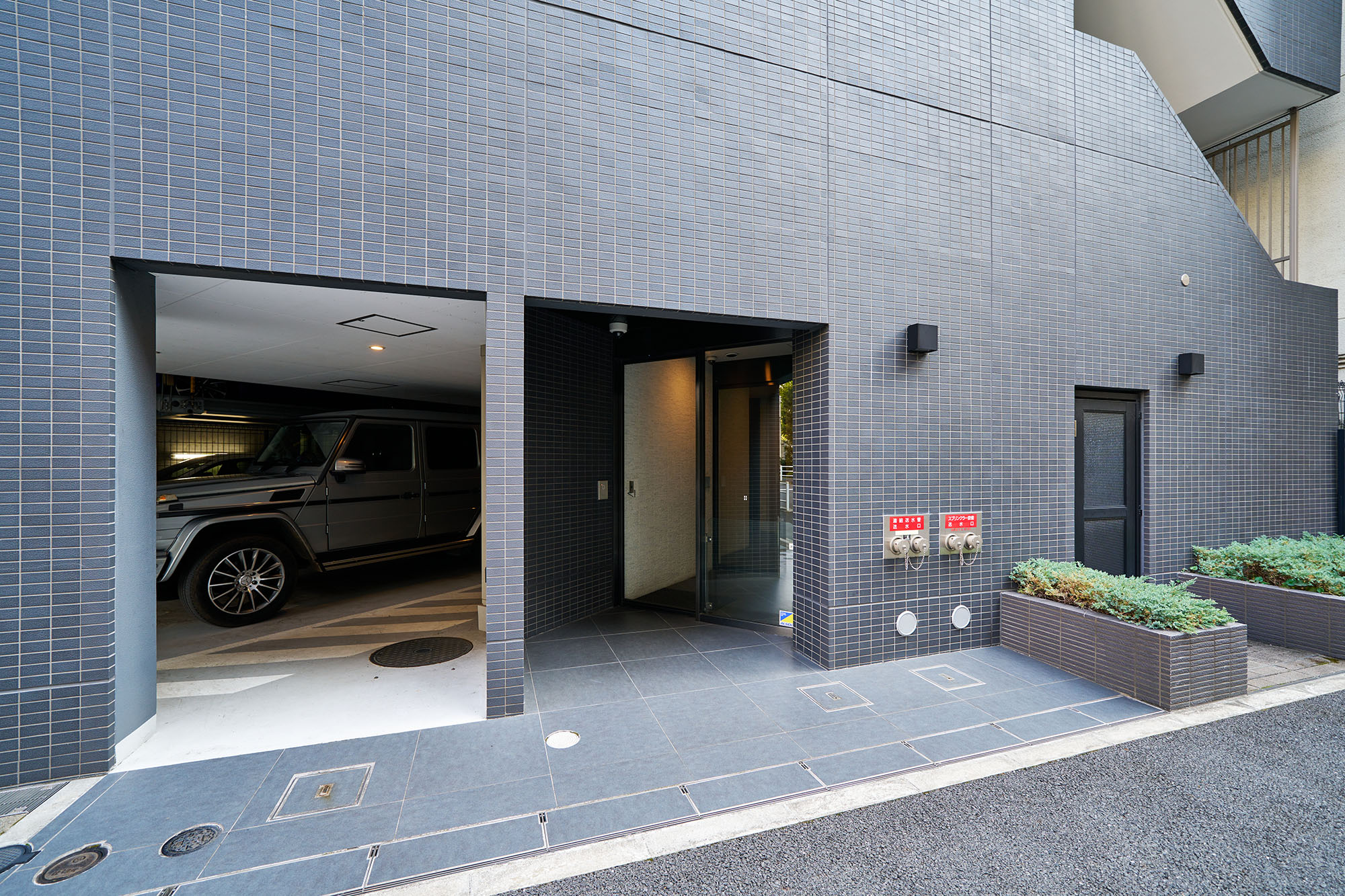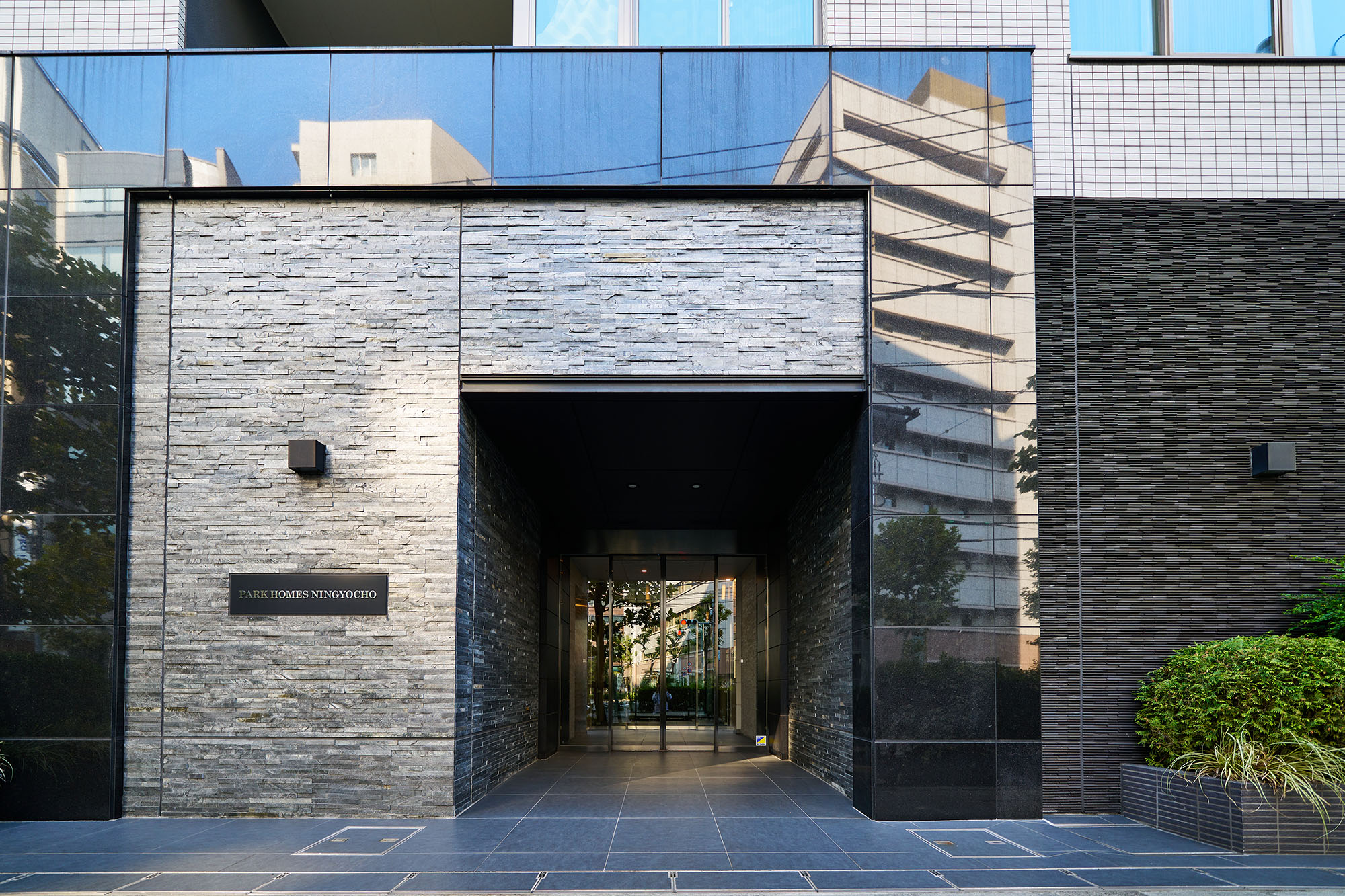 艶やかな黒い御影石と、素材感のあるグレーのボーダータイルを組み合わせたシックなエントランス。風除室にも、江戸時代の墨絵を連想させるような黒の扉が施されており、厳かな雰囲気が住まいへの誇りを醸成します。住戸までのアプローチは、上質感を演出するカーペットと、温かみのある照明によってホテルのような雰囲気を漂わせる内廊下設計。雨風の心配もなく、外部からの視線にもさらされない高いプライバシー性が確保されています。