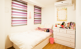 こちらはお嬢様の部屋。家具やブラインドなど優しい配色のインテリアは奥様がコーディネートしたもの。