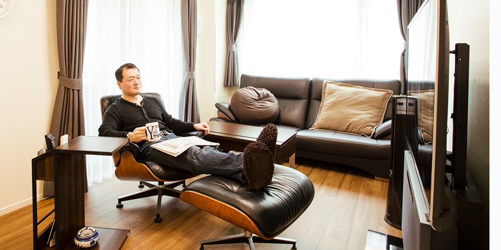 シンプルなインテリアのほとんどはMさんが自ら選んだもの。特にお気に入りなのは、有名デザイナーのアメリカ製ラウンジチェア&オットマン。アメリカ在住時に購入し愛用していたものを、日本に持ち帰ってきた。このラウンジチェアをテレビの正面に据えて特等席を作り、大好きな映画を観ると、気持ちがリフレッシュされるそう。チェアのデザインに合うようにコーディネートされたお部屋は、全体に統一感がある。