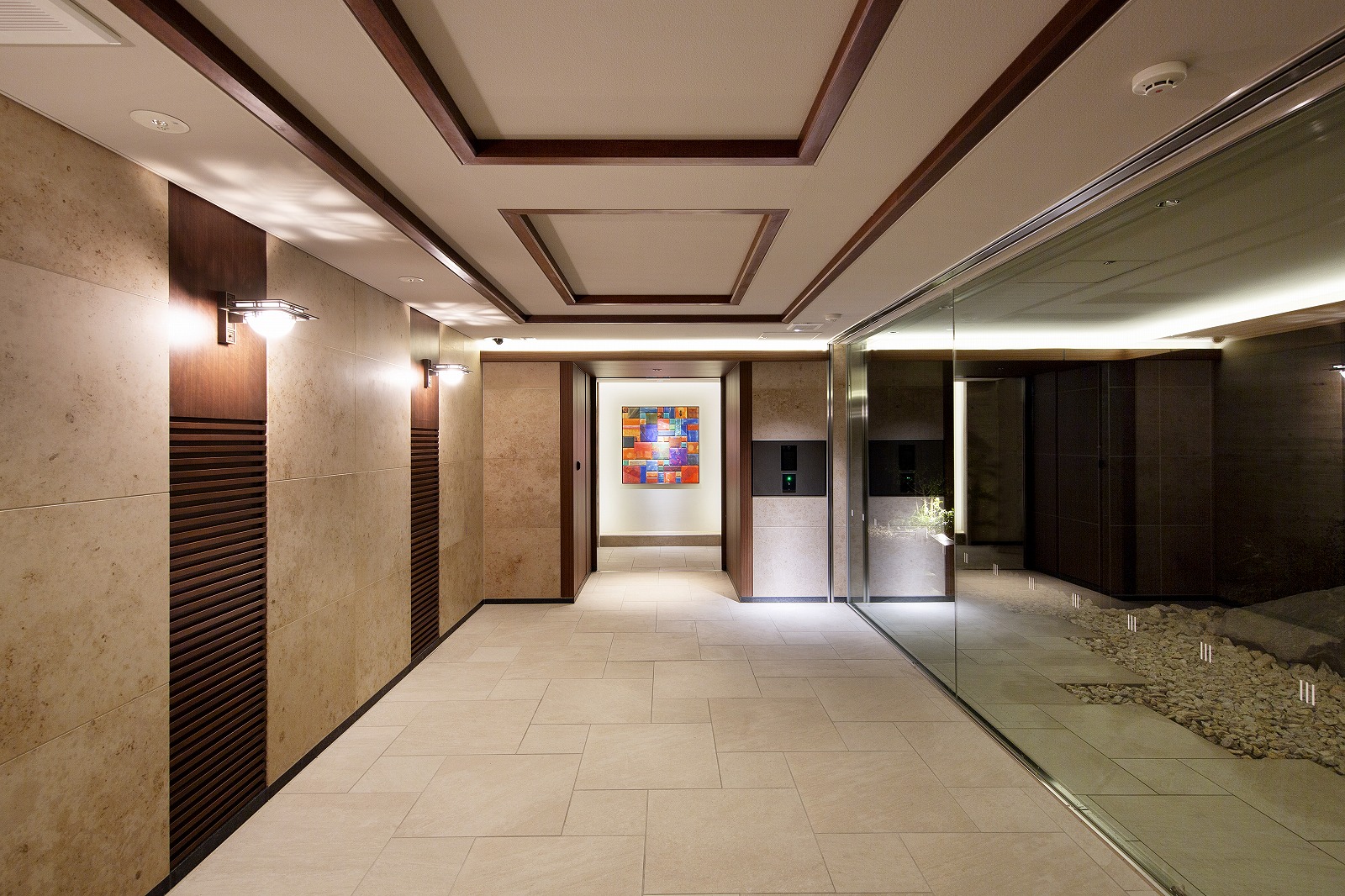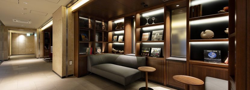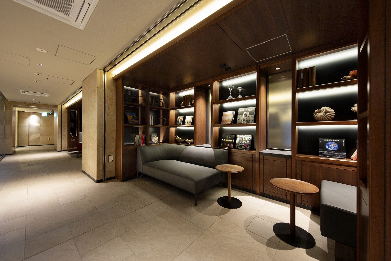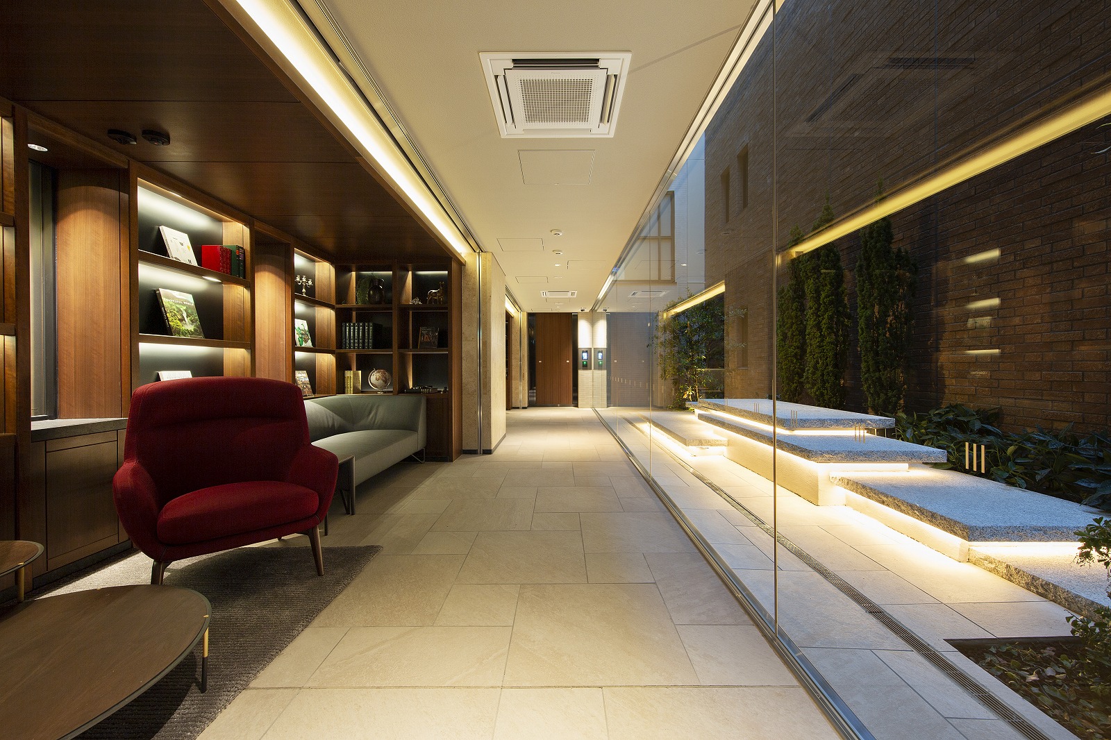コリドーガーデンは、自由学園のコリドーに着想を得て設計されたよりプライベートな空間。木調に囲まれたシッティングスペースは、書籍やガラス器などが置かれたアカデミックな雰囲気の書庫となっています。石による建築的な造形の中庭はコリドーガーデンと一体感を生み出し、日常の動線の中にアートな景観を演出しています。