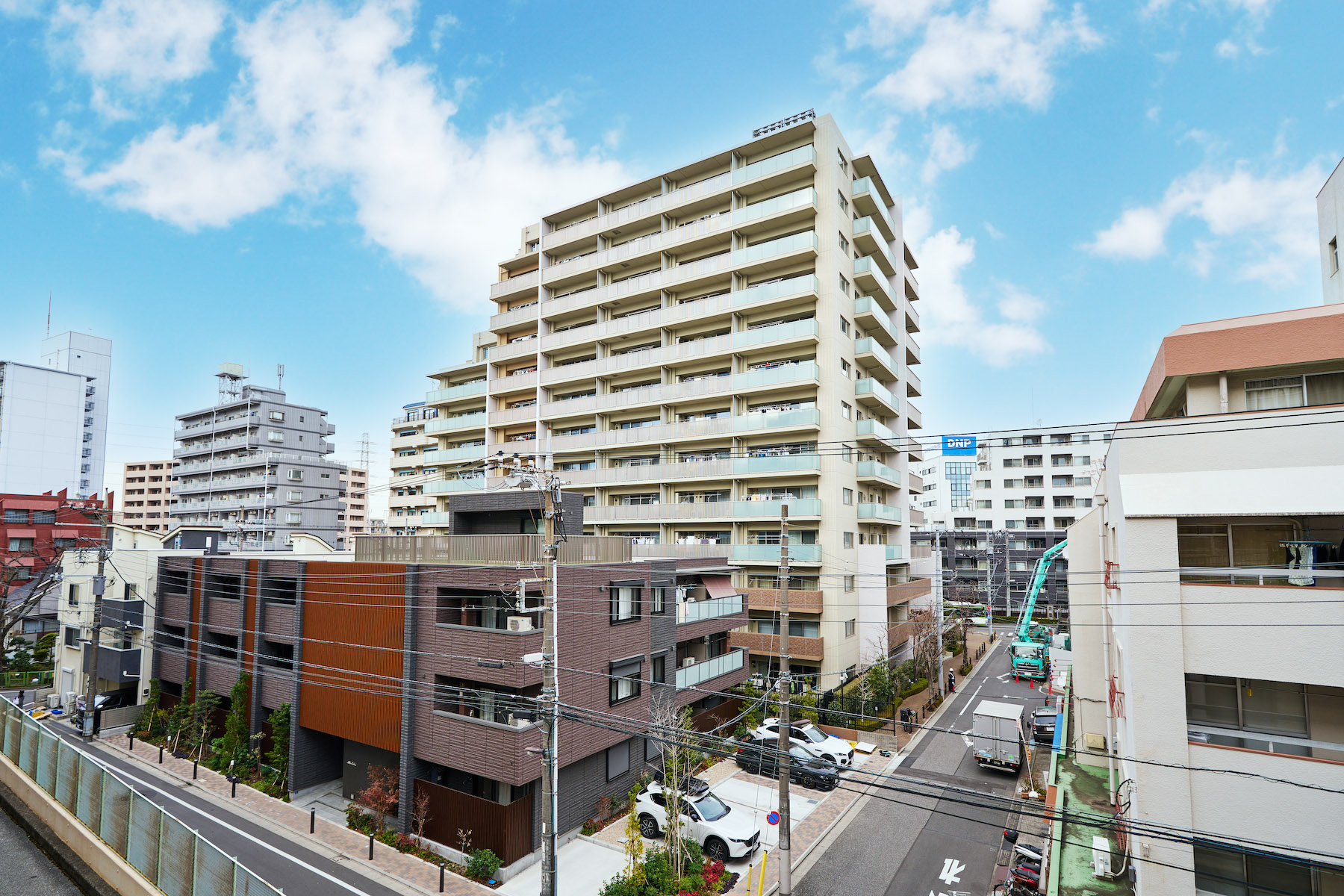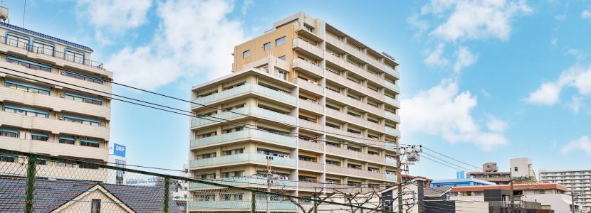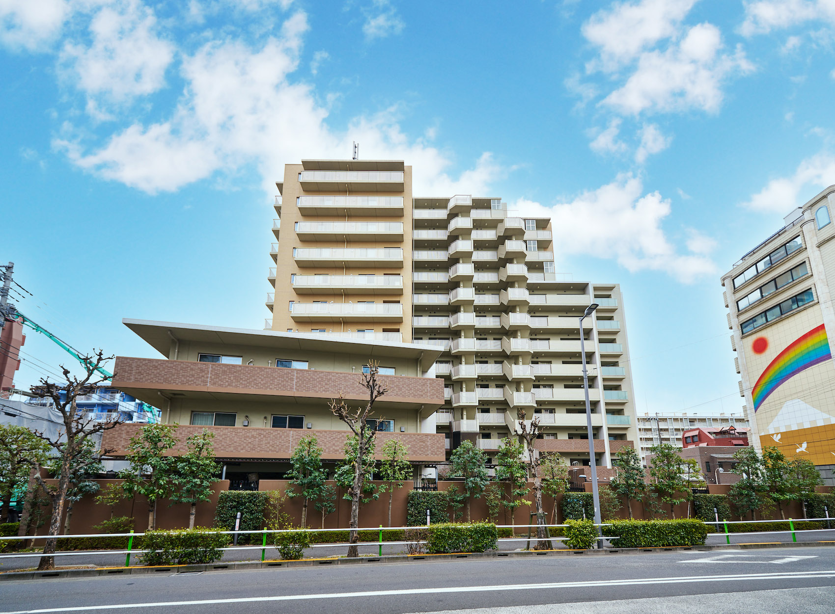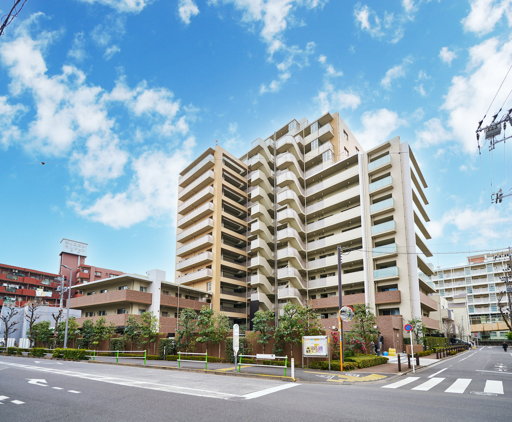 外観ファサードは、濃淡のベージュを基調としたタイル貼の仕上げ。3階までの基壇部にはダークブラウンのタイルを用いて、全体の印象を引き締めています。伸びやかに広がる地上13階建のエッジを効かせた印象的なフォルムに、シックなアースカラーが美しい調和を奏でています。