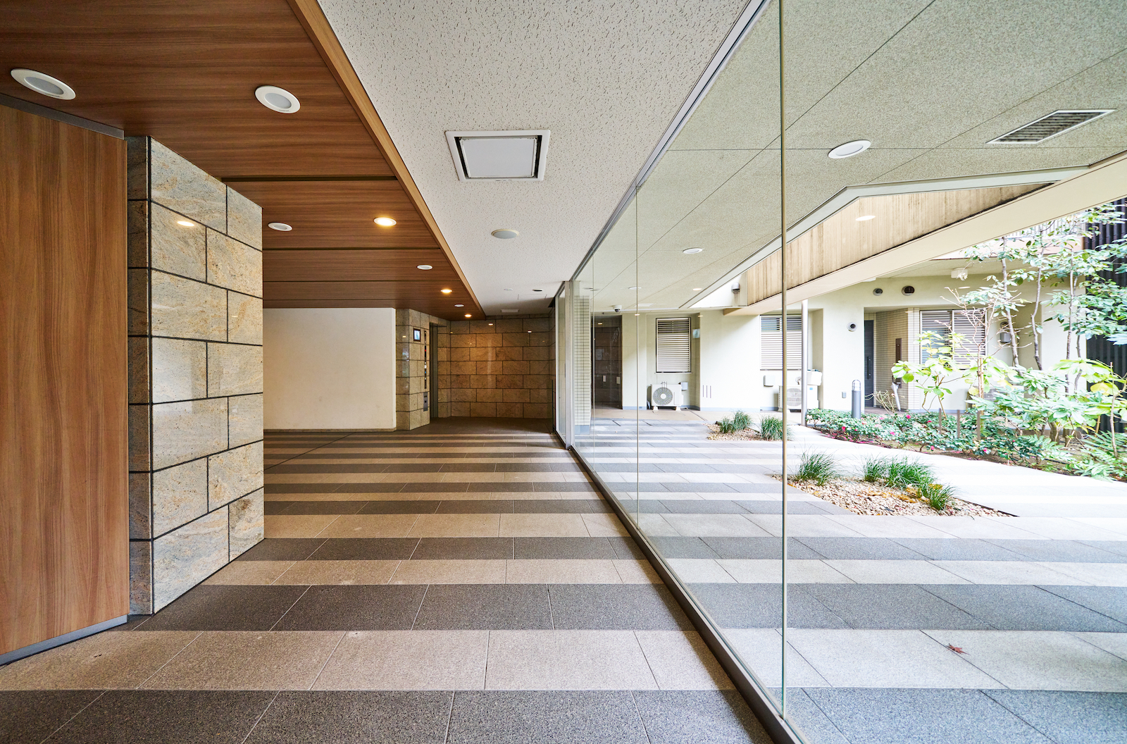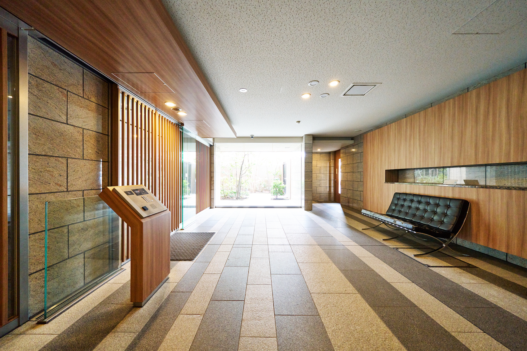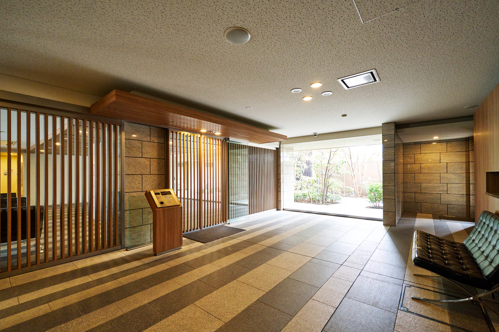 住まう方、訪れる方を優しく迎える静謐なエントランス。壁一面のピクチャーウィンドウの奥にシーズンガーデンを配したラウンジとエントランスホール。上質でスタイリッシュな佇まいとともに、寛ぎの邸宅にふさわしい深い安らぎを兼ね備えています。