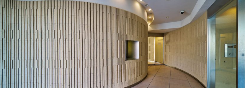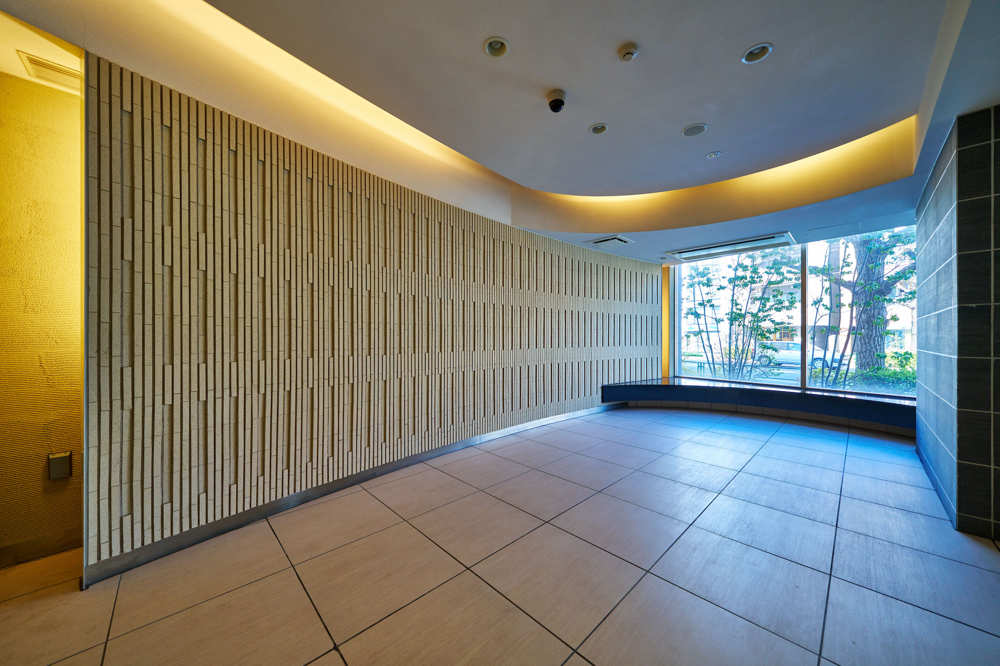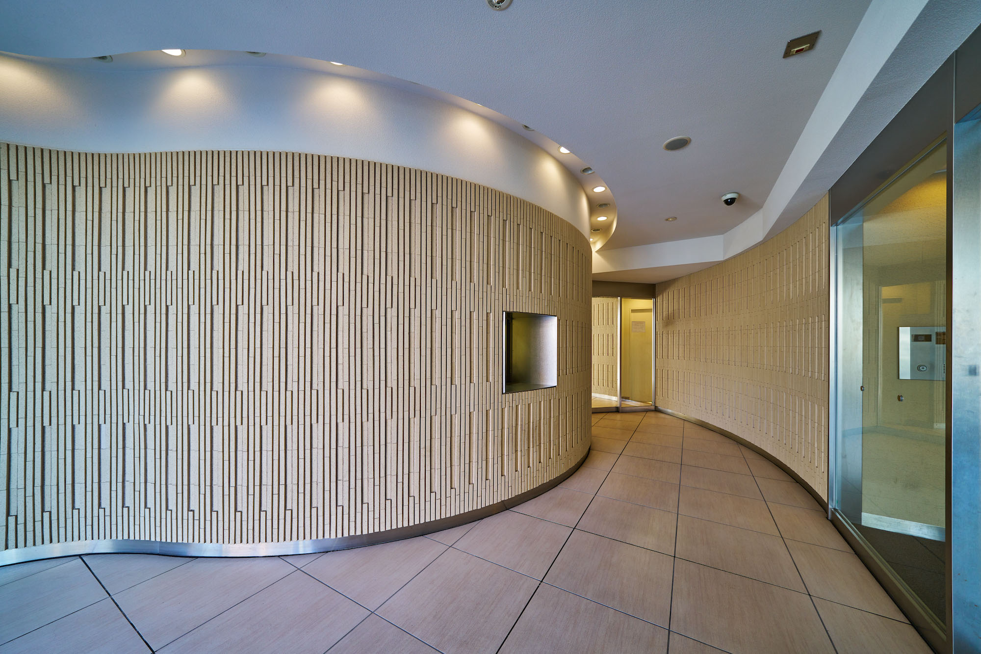 ダーク系タイルがステイタス性を漂わす重厚なエントランスは、いちょう並木の通りからも垣間見える大きなアールを描くボーダータイルの壁面を創出。あたたか味のあるベージュ系トーンで統一され、スリット照明により空間の視覚的な変化とともに切り変わるONとOFFのゆるやかな時間を演出しています。凛とした佇まいの中にもぬくもりを感じさせる格調高い迎賓空間です。エレベーターホールからわが家へと続くアプローチは、四季を通じてコンディショニングされた空調システムや照明計画、靴音を軽減するカーペットの選定など、ホテルのような快適性を求めた内廊下設計となっています。