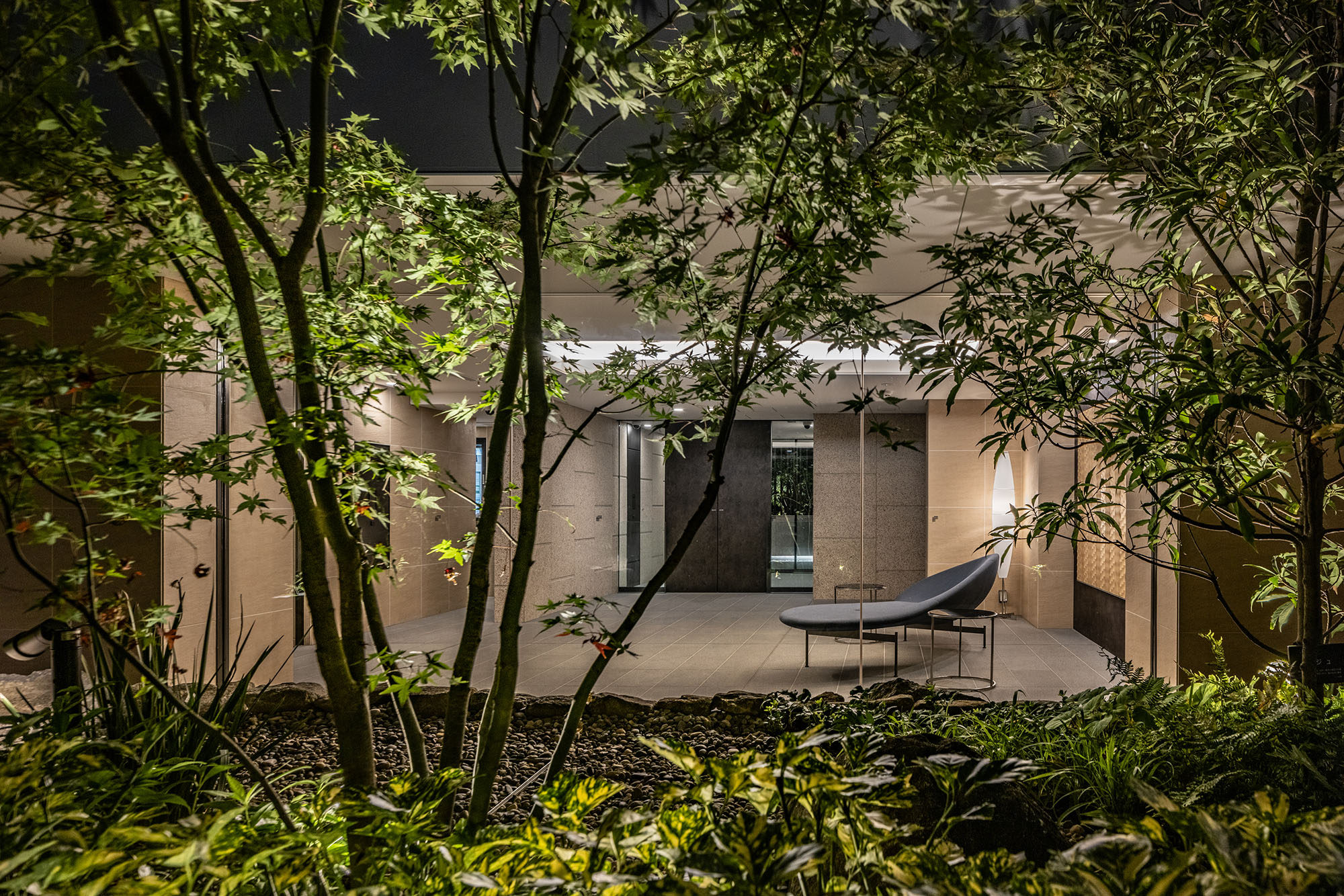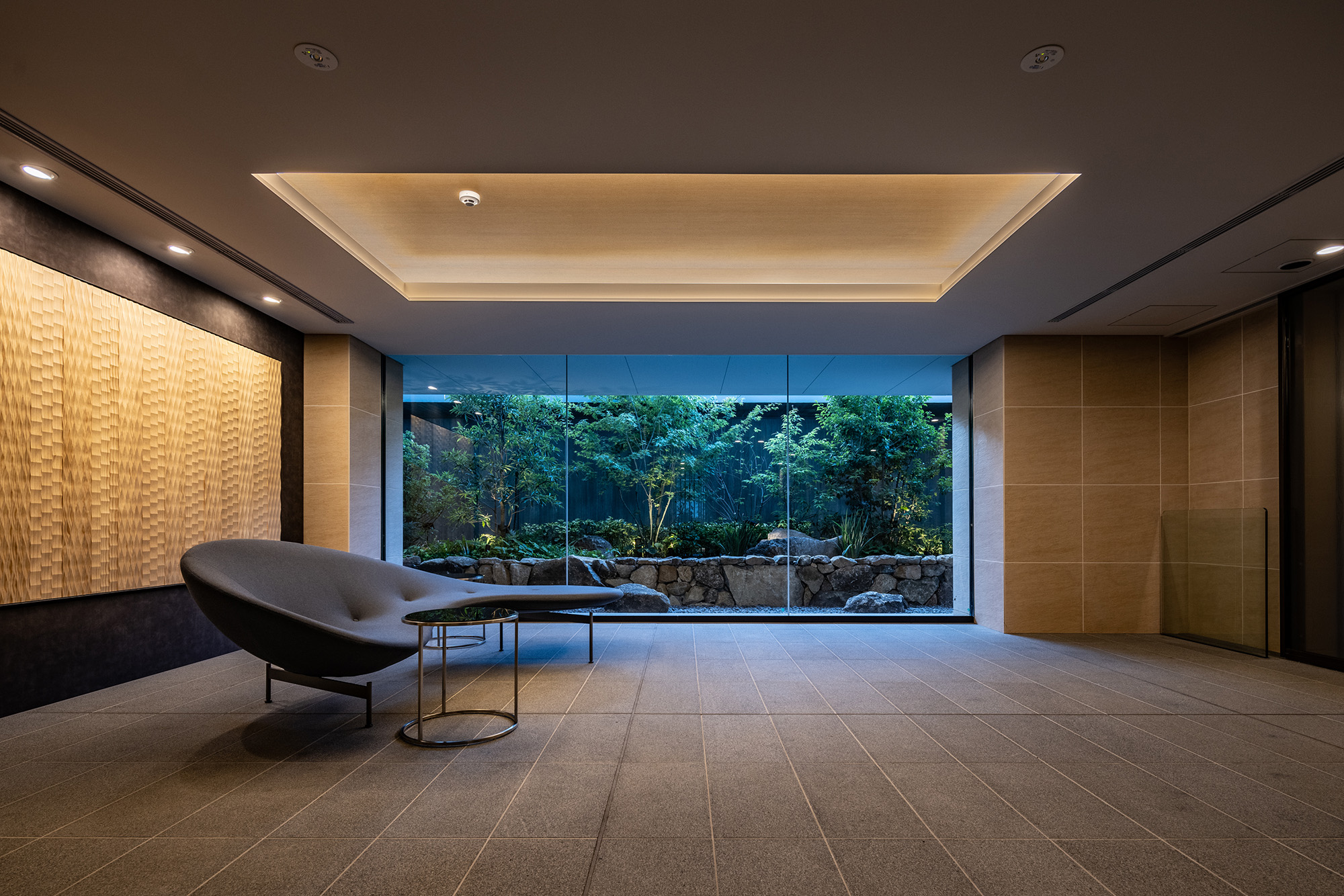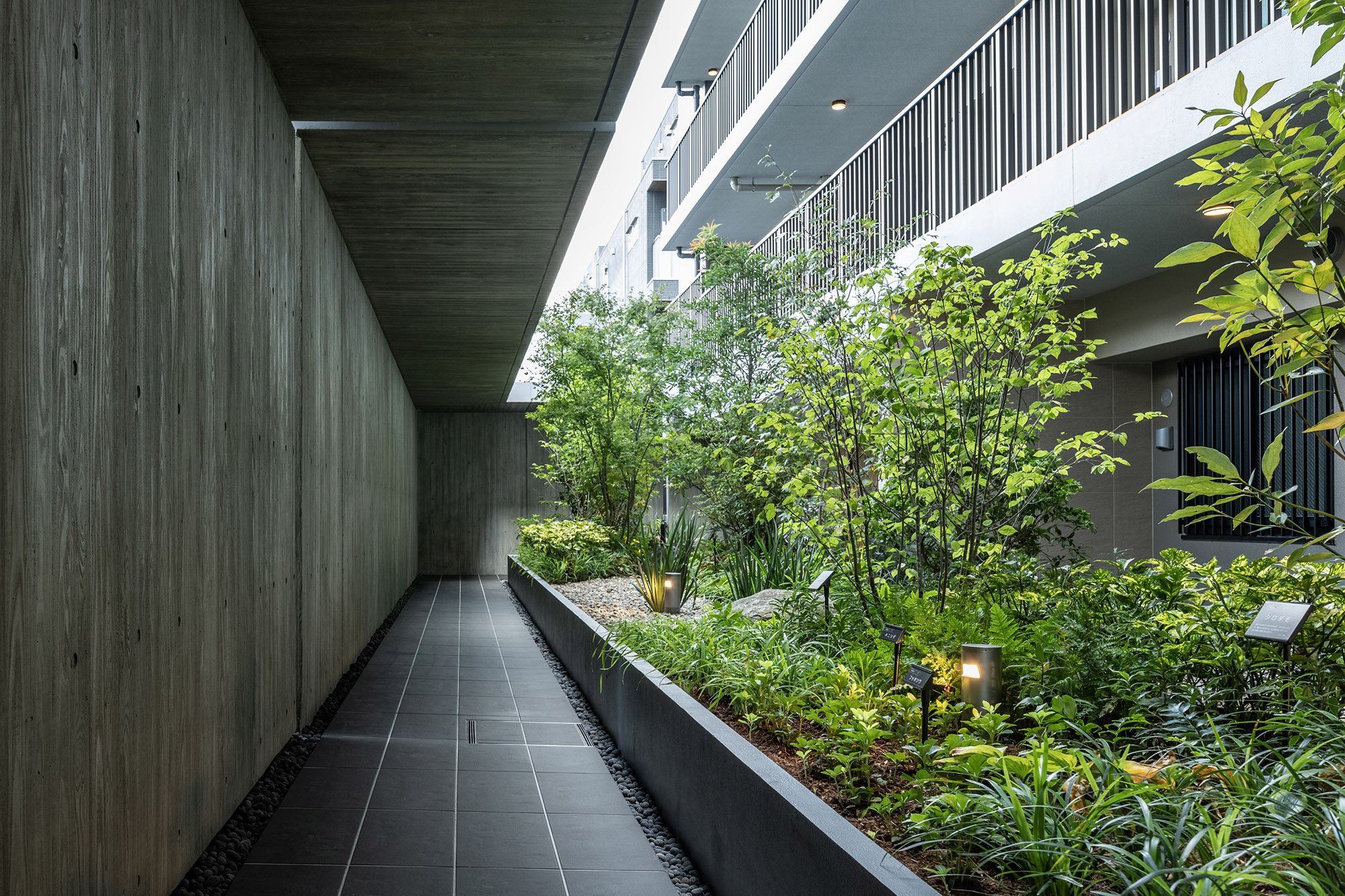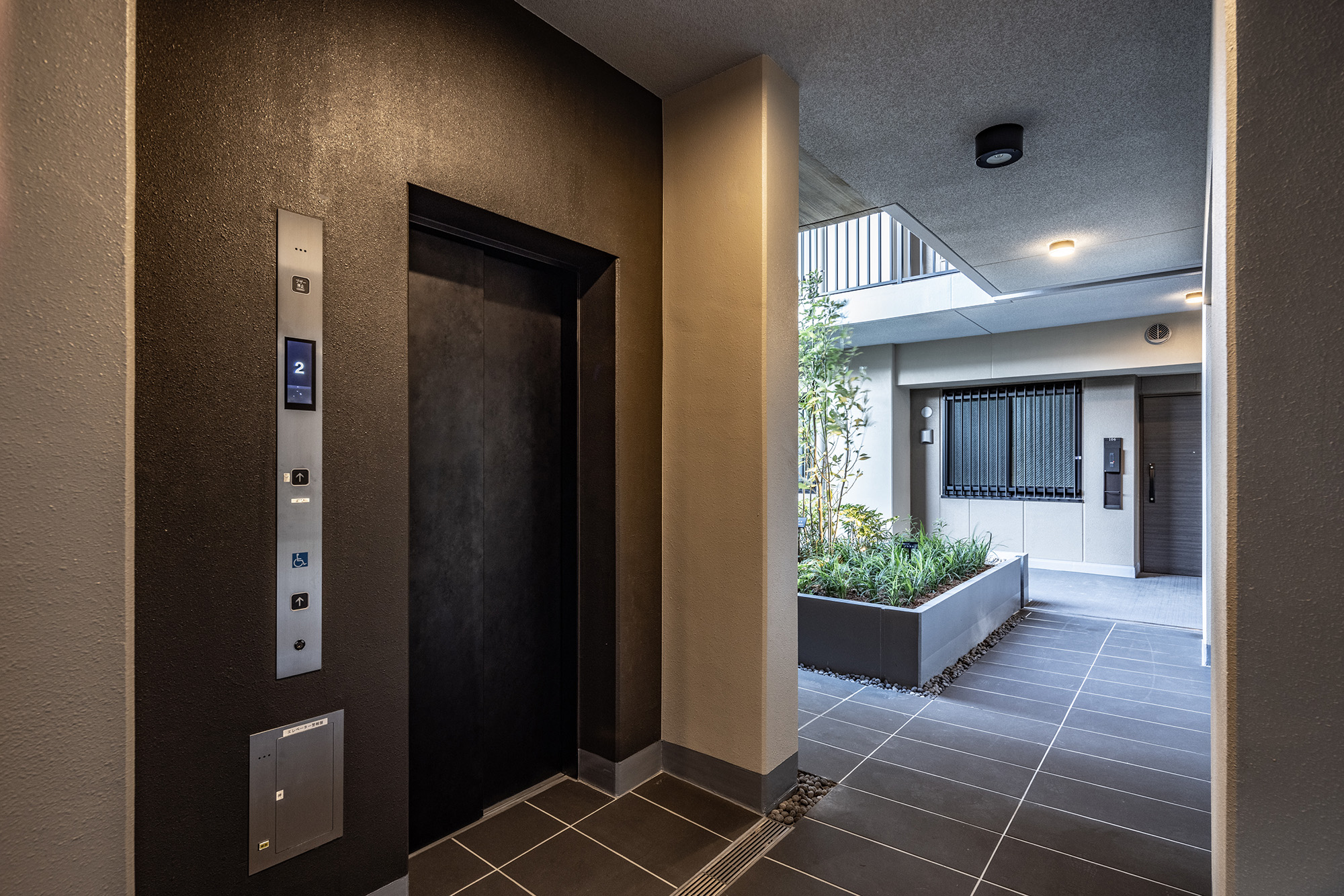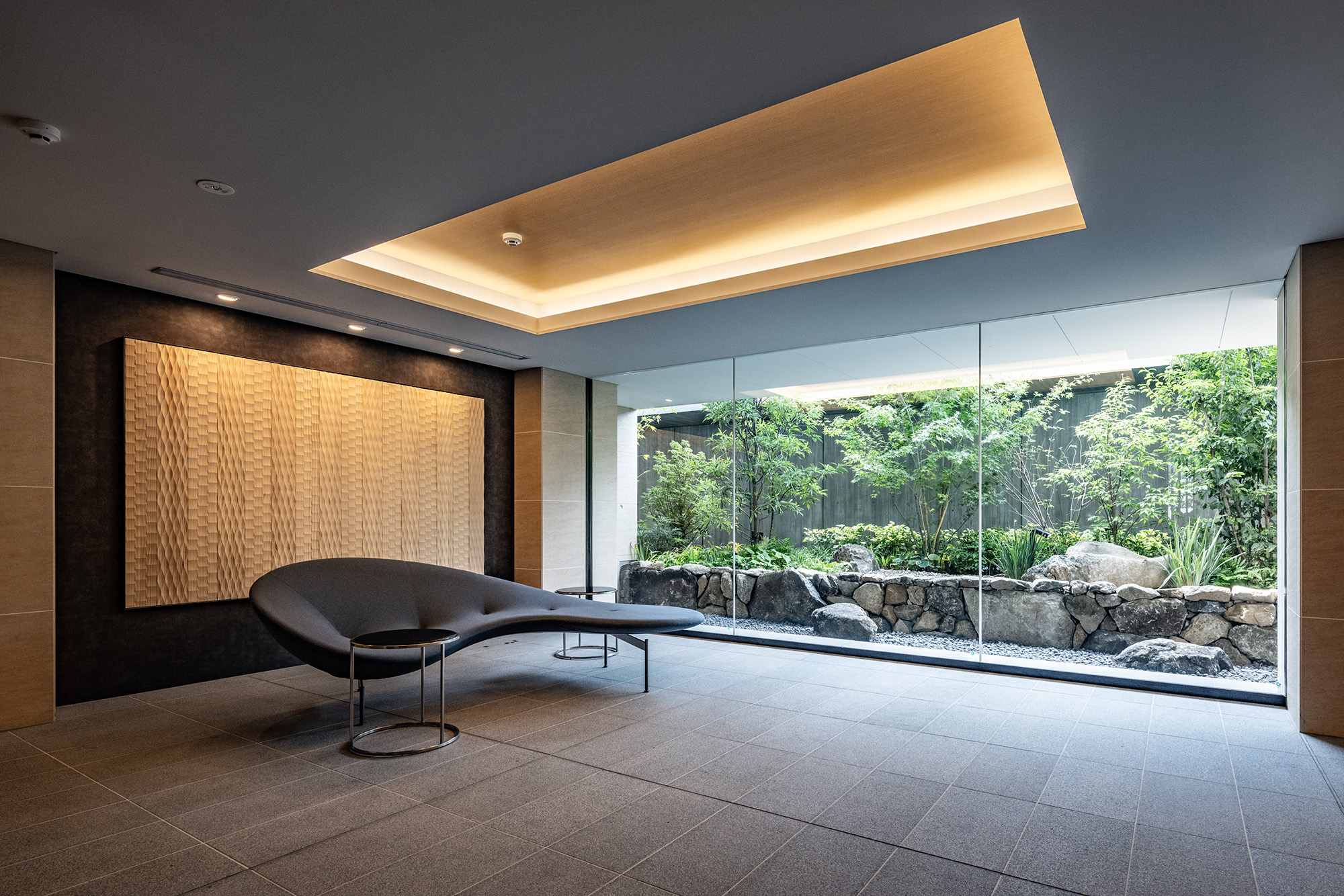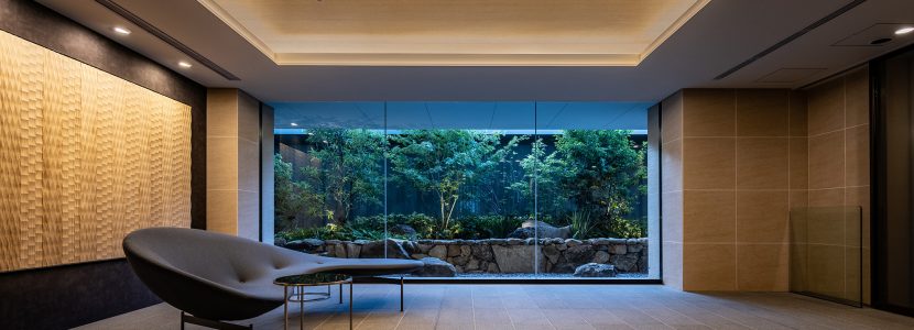 ルーバーで視線を軽やかに遮ったエントランスを抜けると、照明で効果的に演出されたアクセントウォールと、デザイン性の高いソファをしつらえた、シックなエントランスホールが広がります。石垣と豊かな緑で構成された中庭は、住まう人を優しく迎え入れ、住戸まで続く回廊を穏やかな雰囲気で包み込んでくれています。