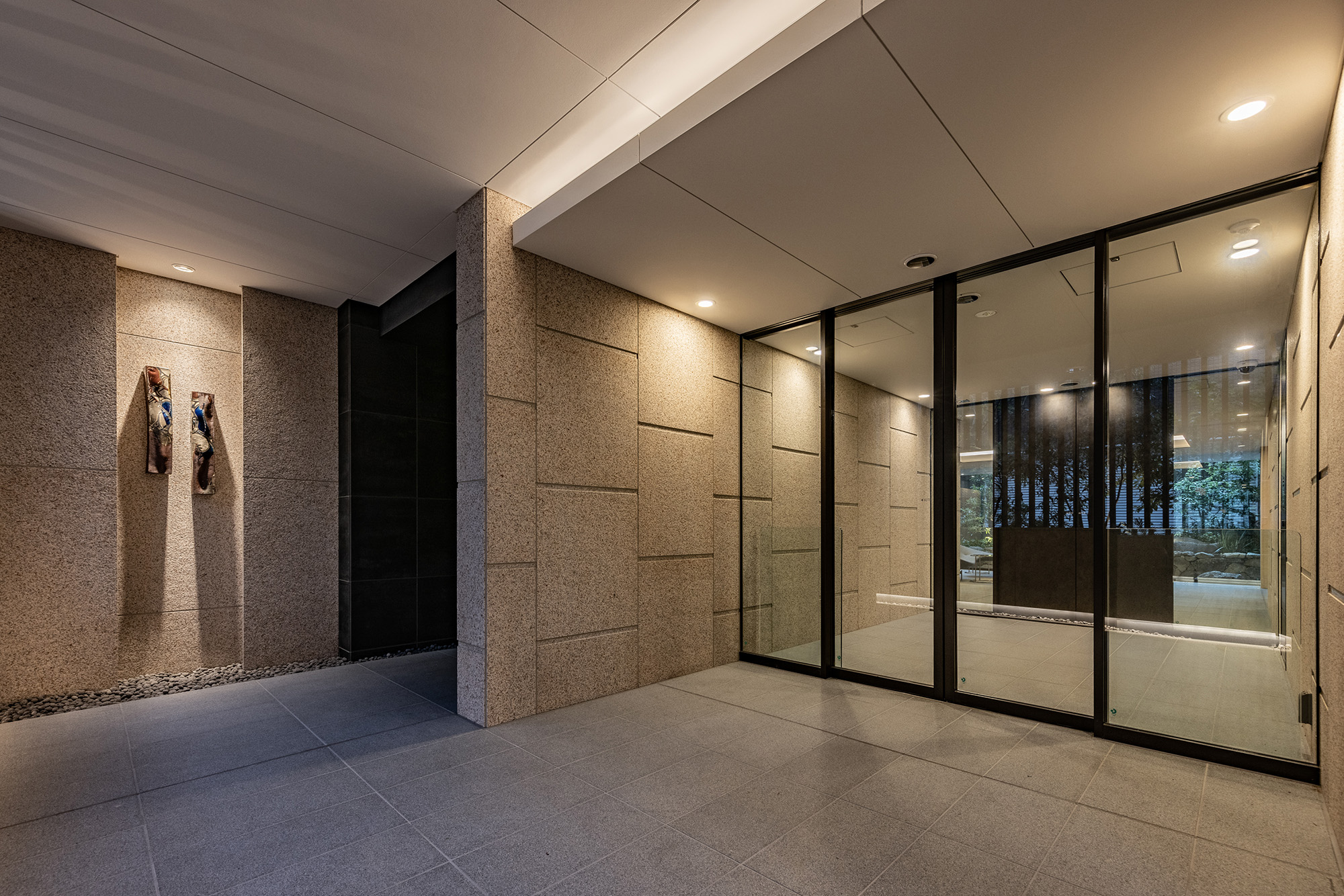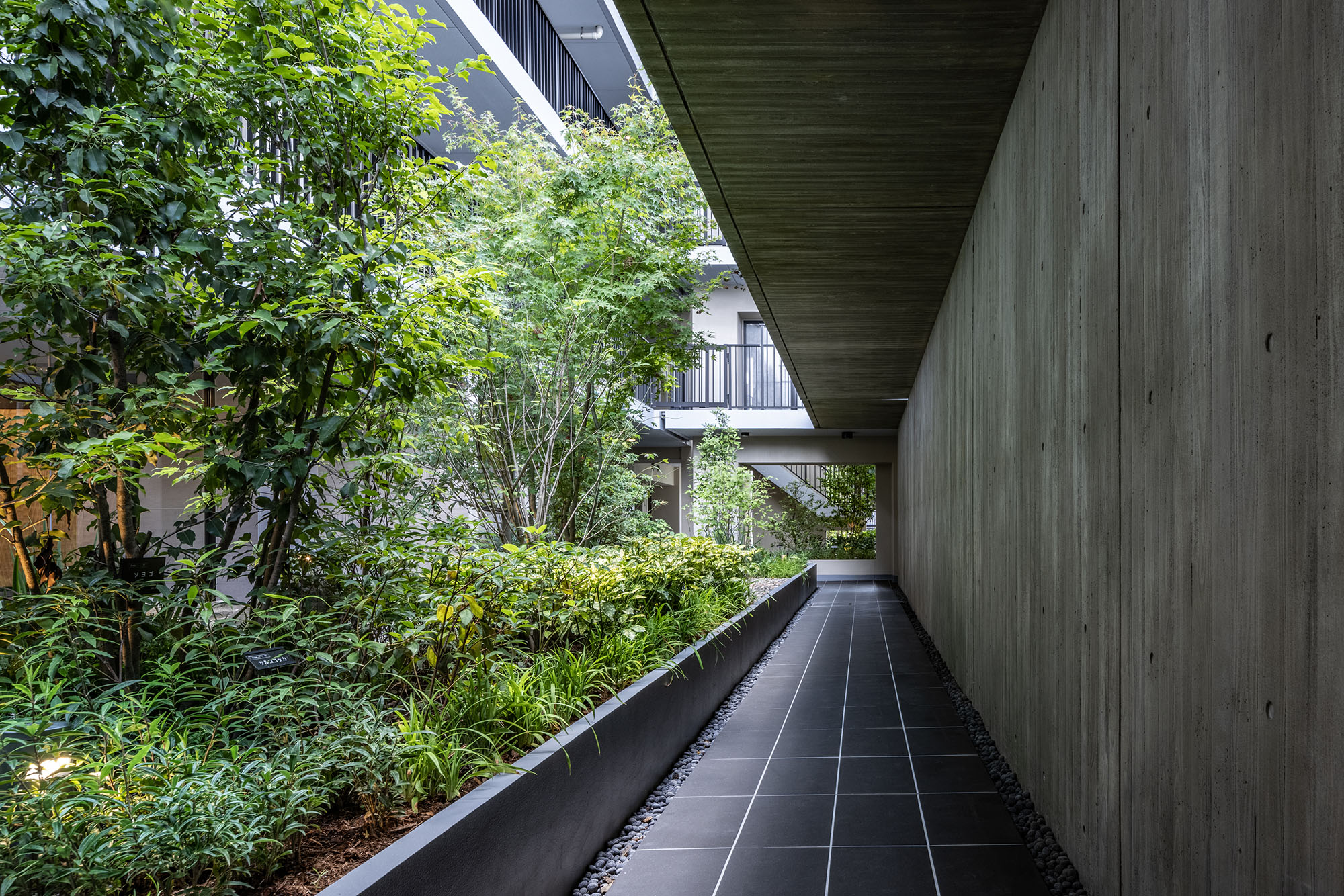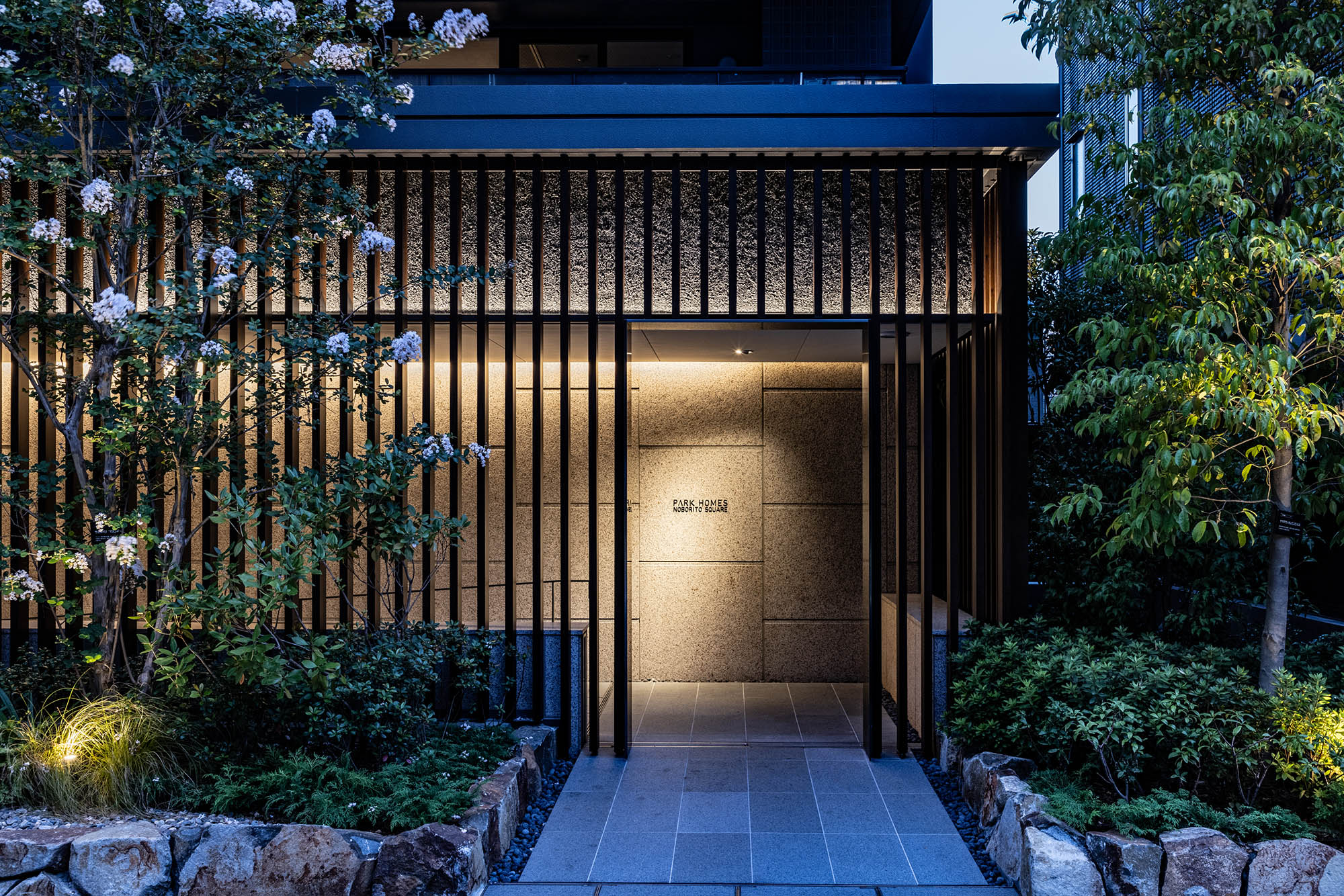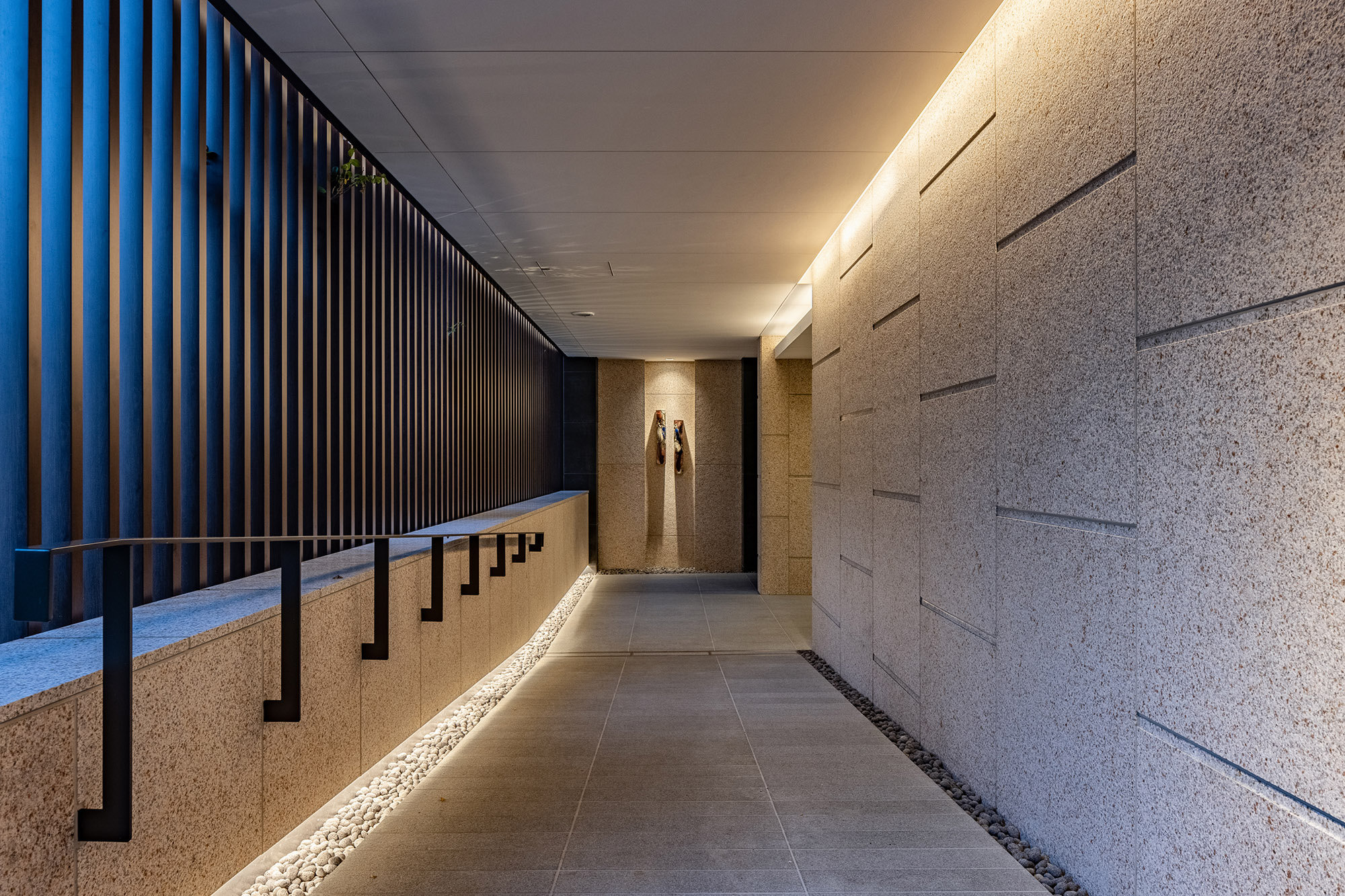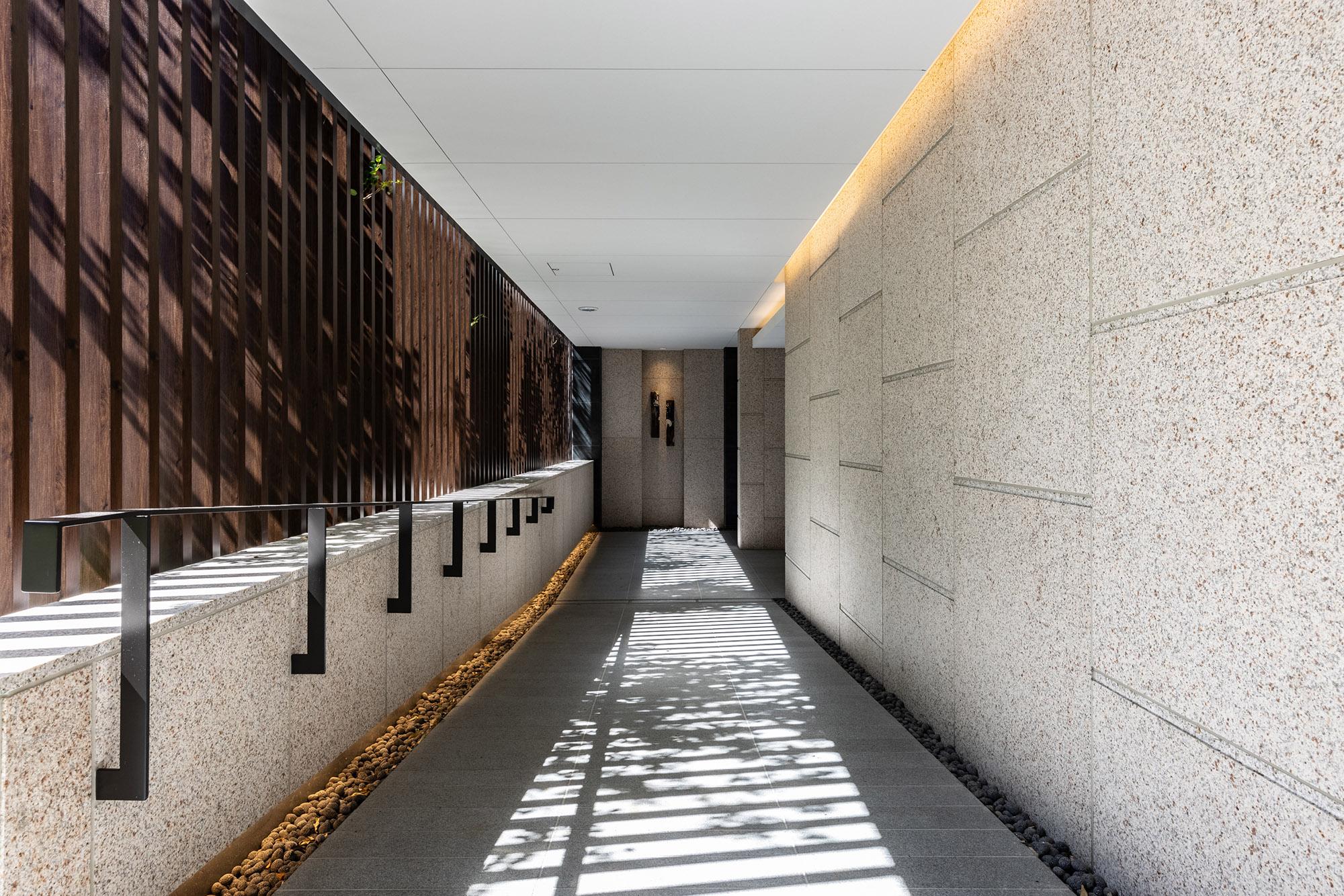 ルーバーで視線を軽やかに遮ったエントランスを抜けると、照明で効果的に演出されたアクセントウォールと、デザイン性の高いソファをしつらえた、シックなエントランスホールが広がります。石垣と豊かな緑で構成された中庭は、住まう人を優しく迎え入れ、住戸まで続く回廊を穏やかな雰囲気で包み込んでくれています。
