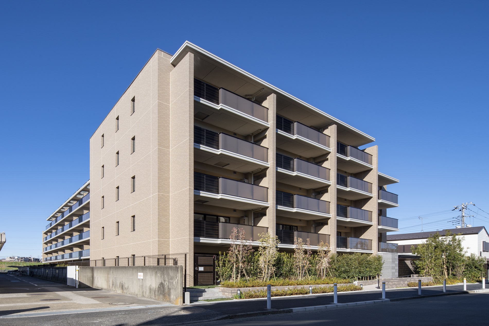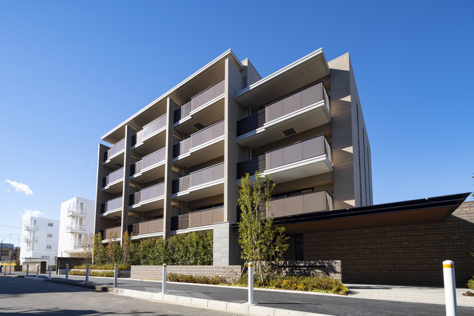 豊かな自然が身近に広がる街の環境と調和するように、建物外観は緑に映えるアースカラーを基調としたデザインとなっています。街路に面した南東面の外観は、住戸スパンごとに袖壁を採用。屹立したマリオンの意匠と凹凸感あるバルコニーが、外観ファサードに豊かな表情を創出しています。