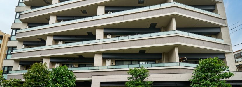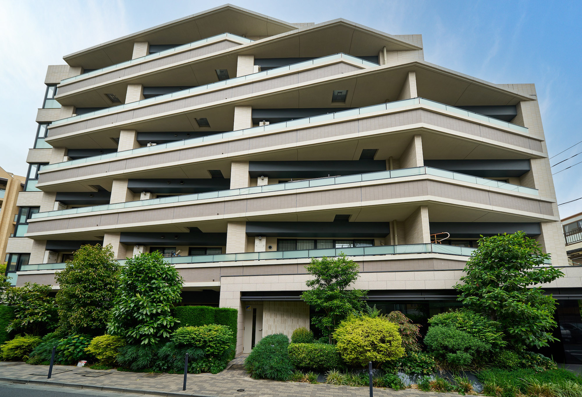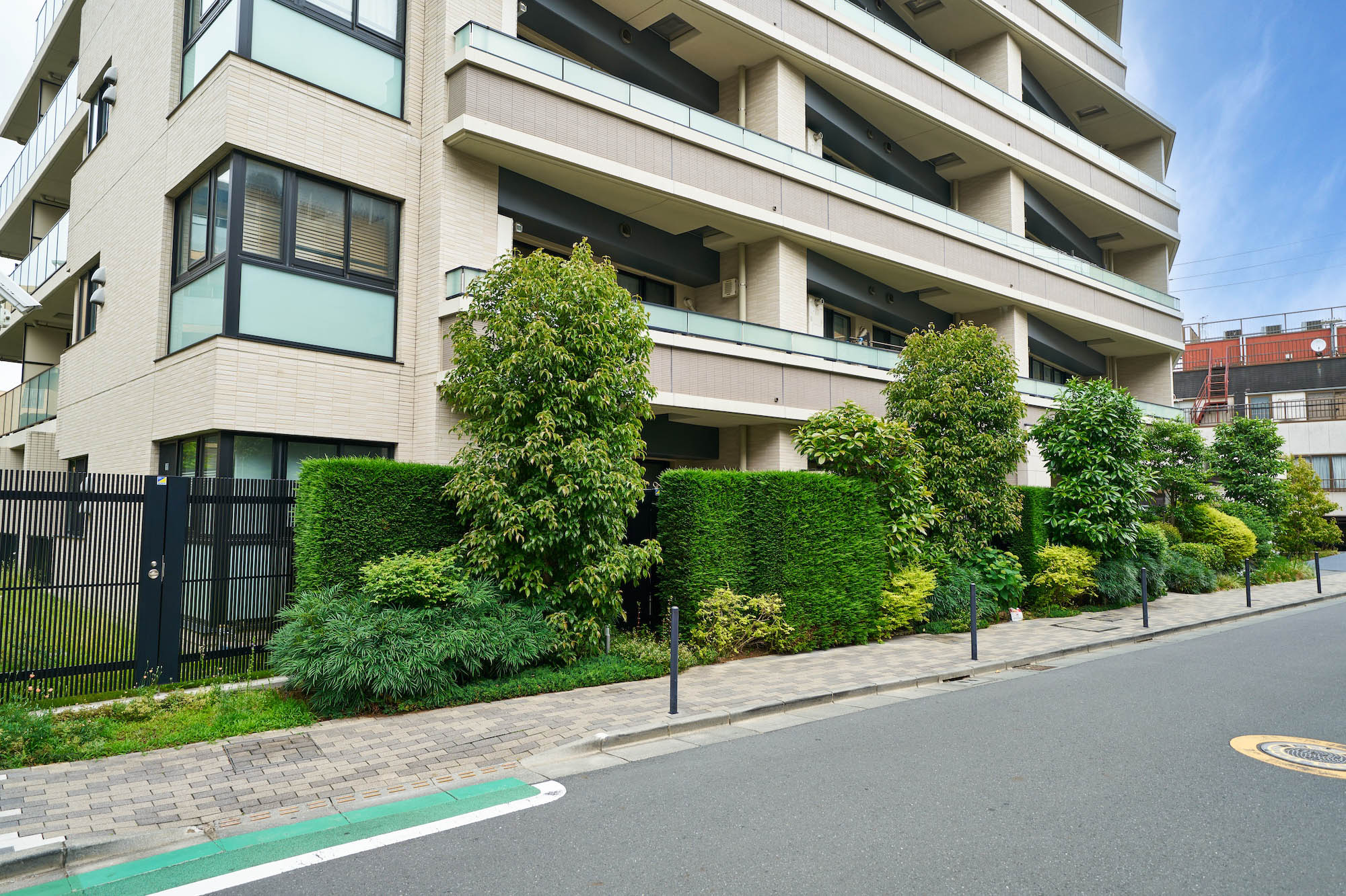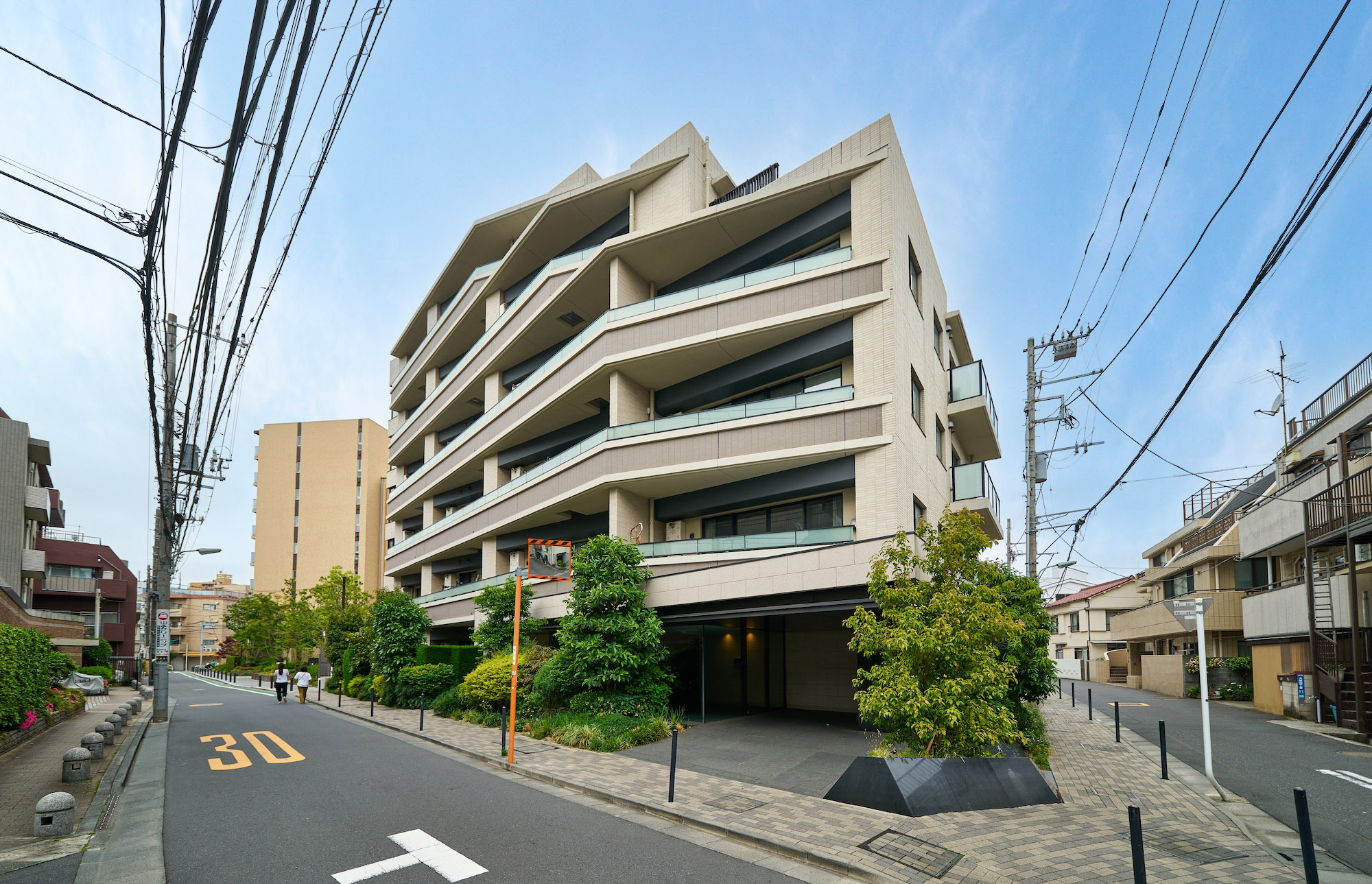敷地に合わせて整えられた建物形状を生かし、バルコニーや庇のシルエットを美しく見せるデザインを追求。建物はベージュやグレーの色調により住宅らしい落ち着いた印象を与えています。バルコニー上下の白い小庇により水平ラインを強調し、陰影による重厚感も演出。そのラインは、雁行した建物形状や斜めのバルコニーラインと呼応し、造形の美しさを強調するとともにファサード全体を引き締めています。南東角に位置するエントランスは居住者を迎える大きな「構え」として、ワイドで伸びやかな石貼りの大庇により風格を創造。シンボルツリーや周囲の植栽が潤いを演出し、その緑と庇や壁の錆石の対比が、エントランスのアプローチに邸宅としての品格を生み出しています。