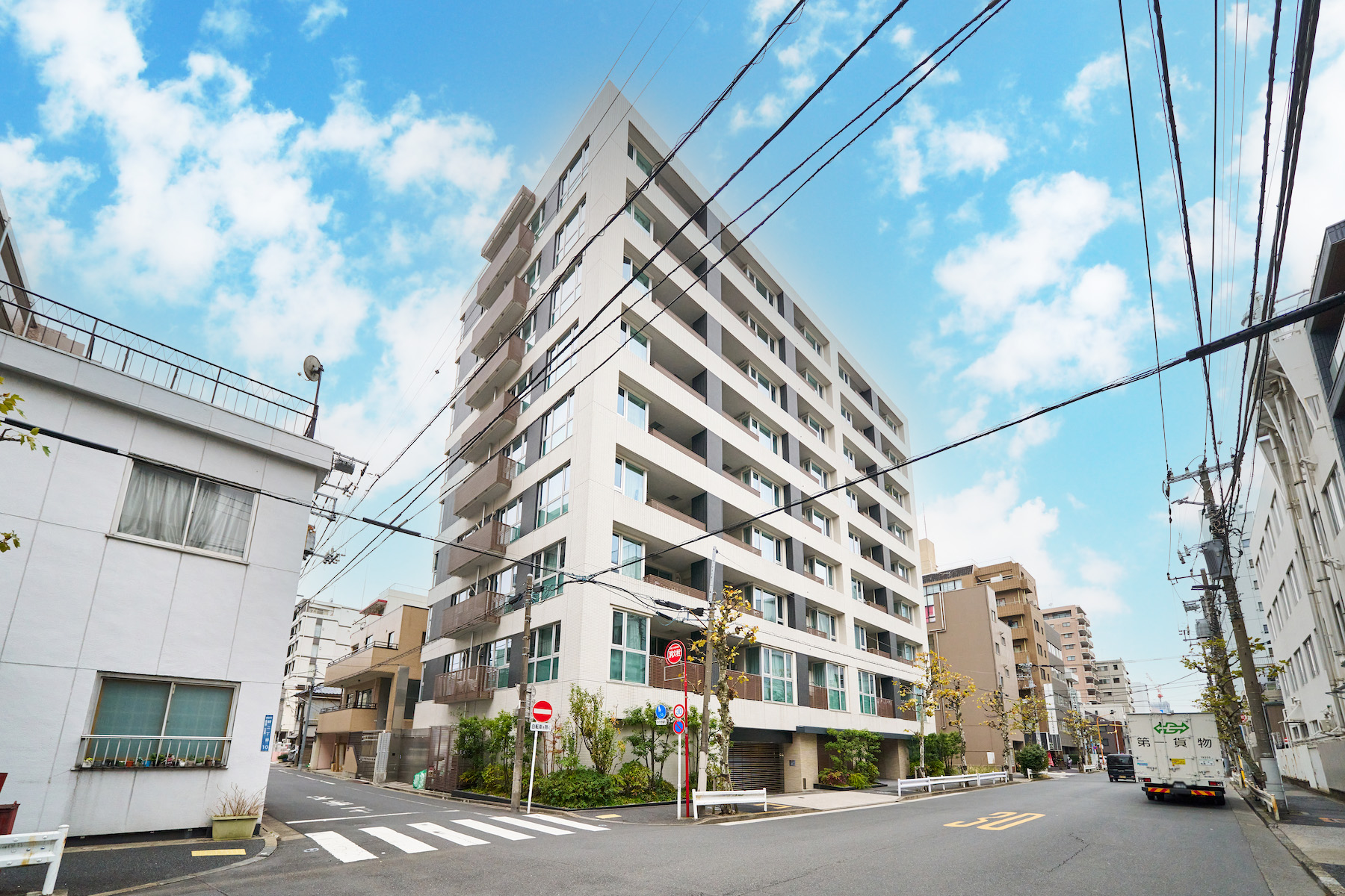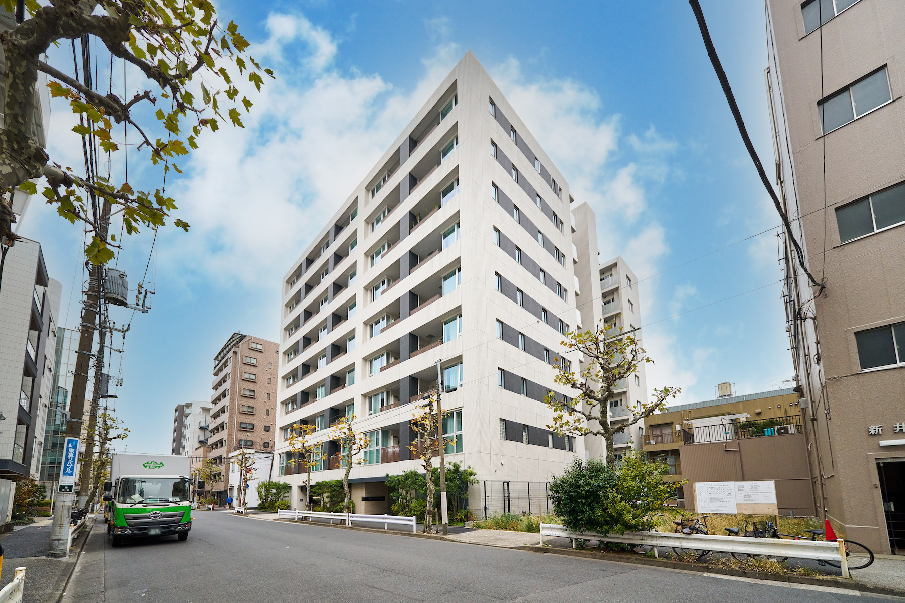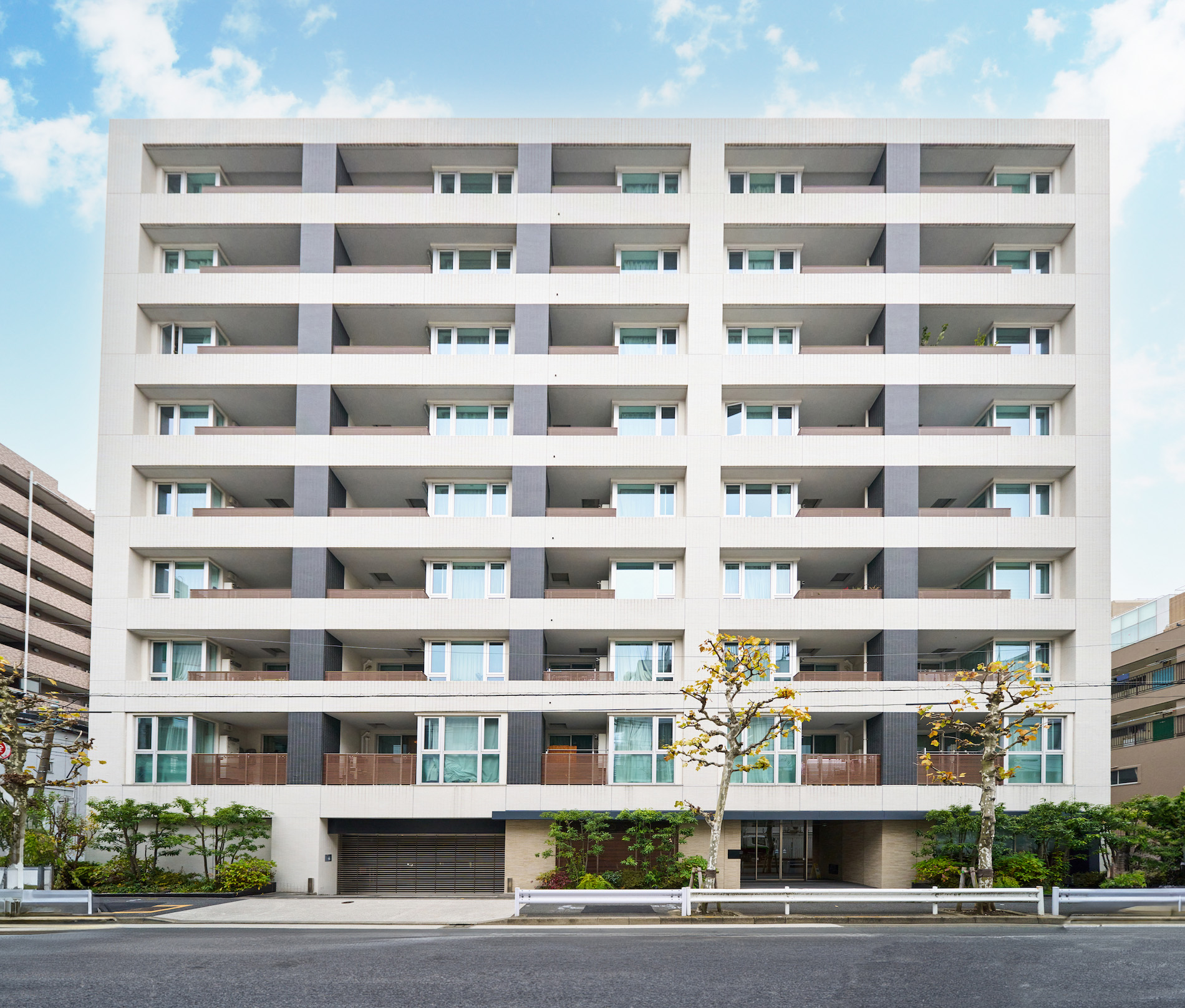「パークホームズ両国コンフォートプレミア」の設計テーマは 「すみだデザイン」。伝統的なものづくりへのこだわりを、 モダンな意匠や先進的な心地よさの中に融合させ 「すみだ」らしさを形にしたものです。たとえば、白を基調とした外観には、武家屋敷の燻し瓦をイメージしたアクセントタイルや、 伝統的な格子をモチーフとした木調のルーバー手摺などを組み合わせて、モダンかつクラシカルな趣を演出しています。