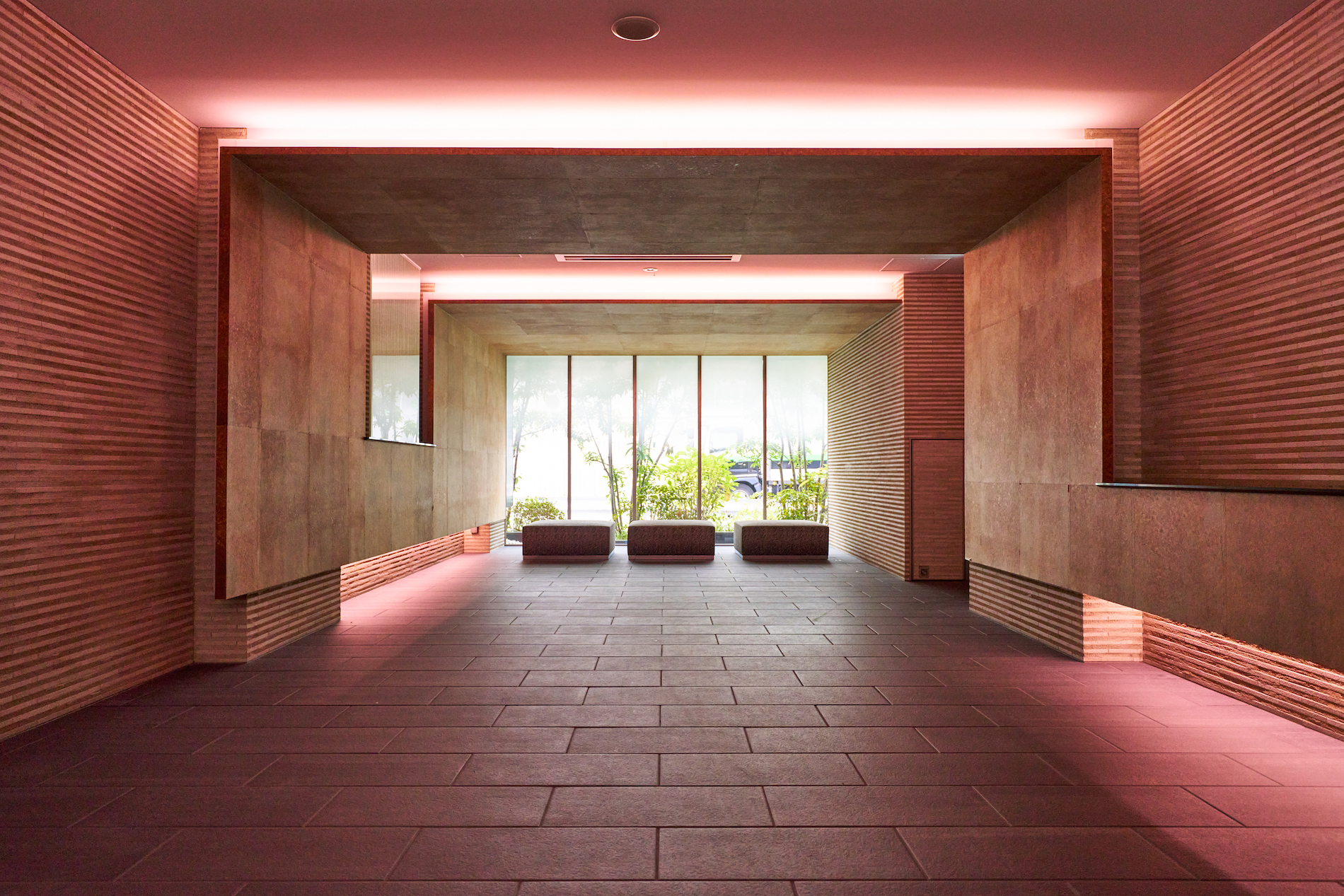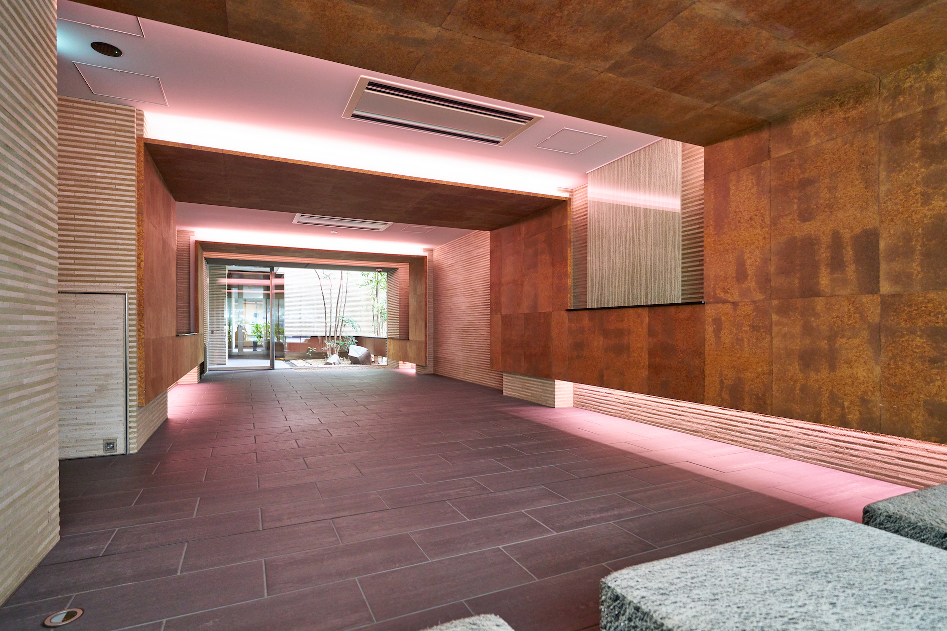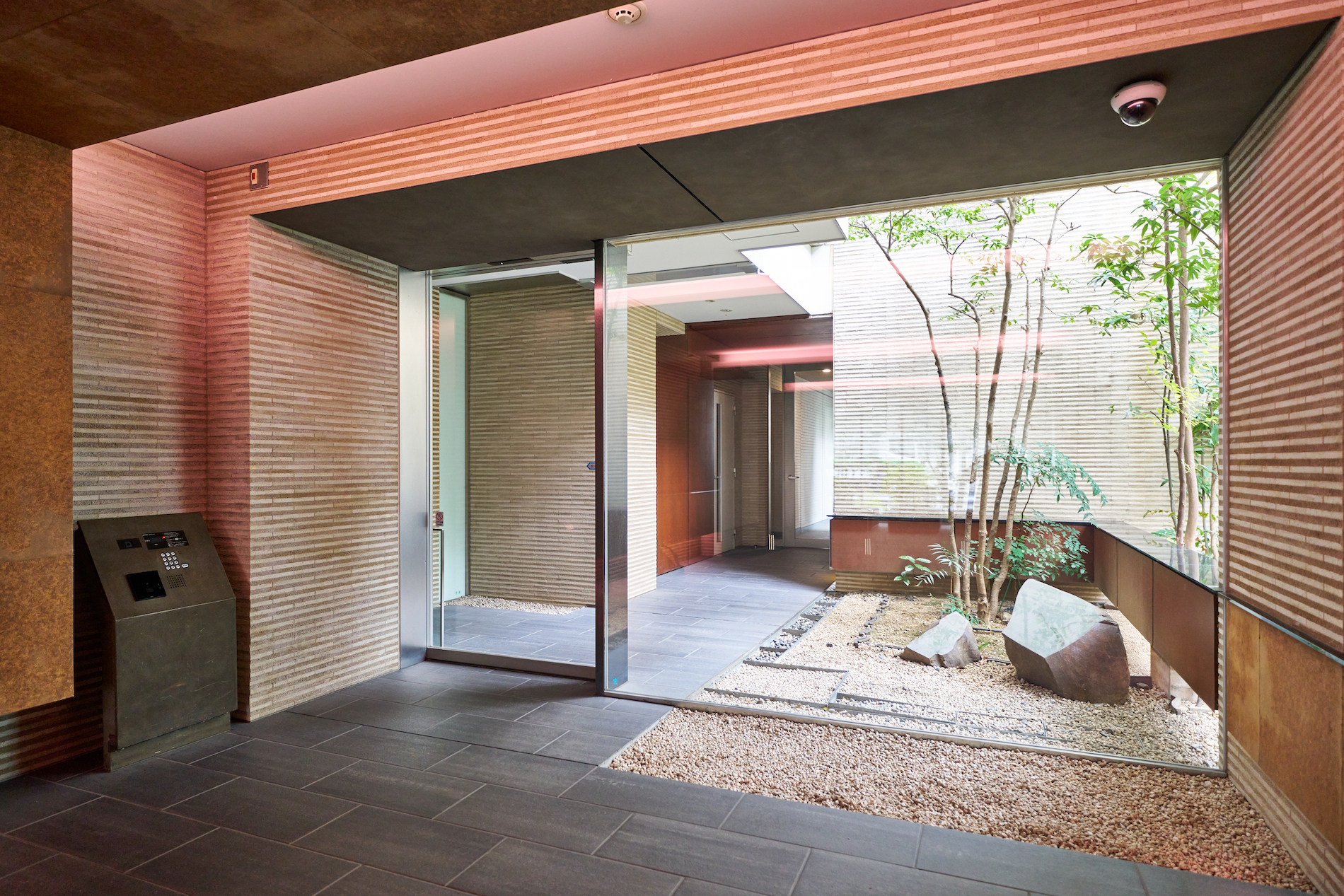 エントランスホールは、モダンかつ伝統的な世界を着物の「帯」をモチーフにしてゆったりと表現。深い色合いの和紙と間接照明の柔らかな光が天井と壁面をめぐり、さらなる奥行きを感じさせる迎賓空間です。 その空間の帯が導く先では、ピクチャーウィンドウから見える枯山水の坪庭が、絵画のように訪れた人をもてなしてくれます。
