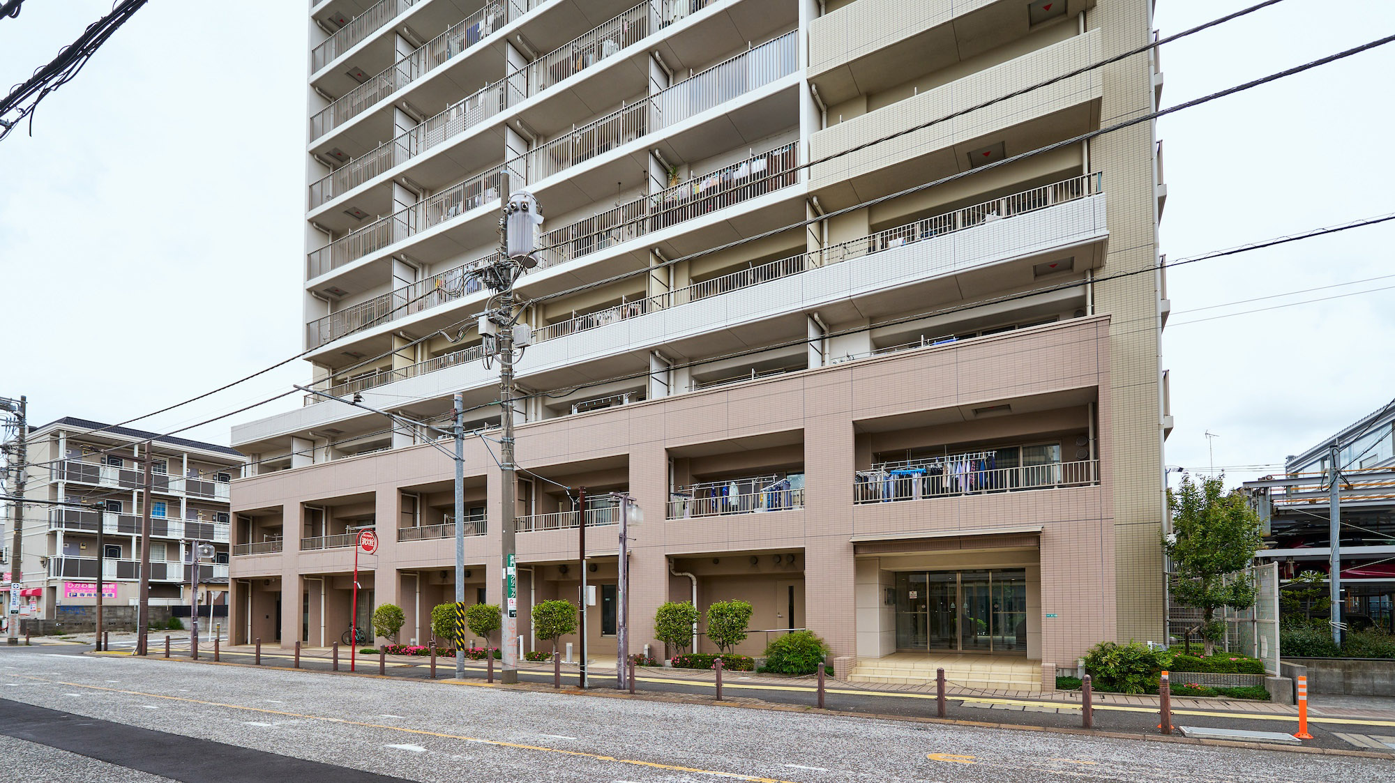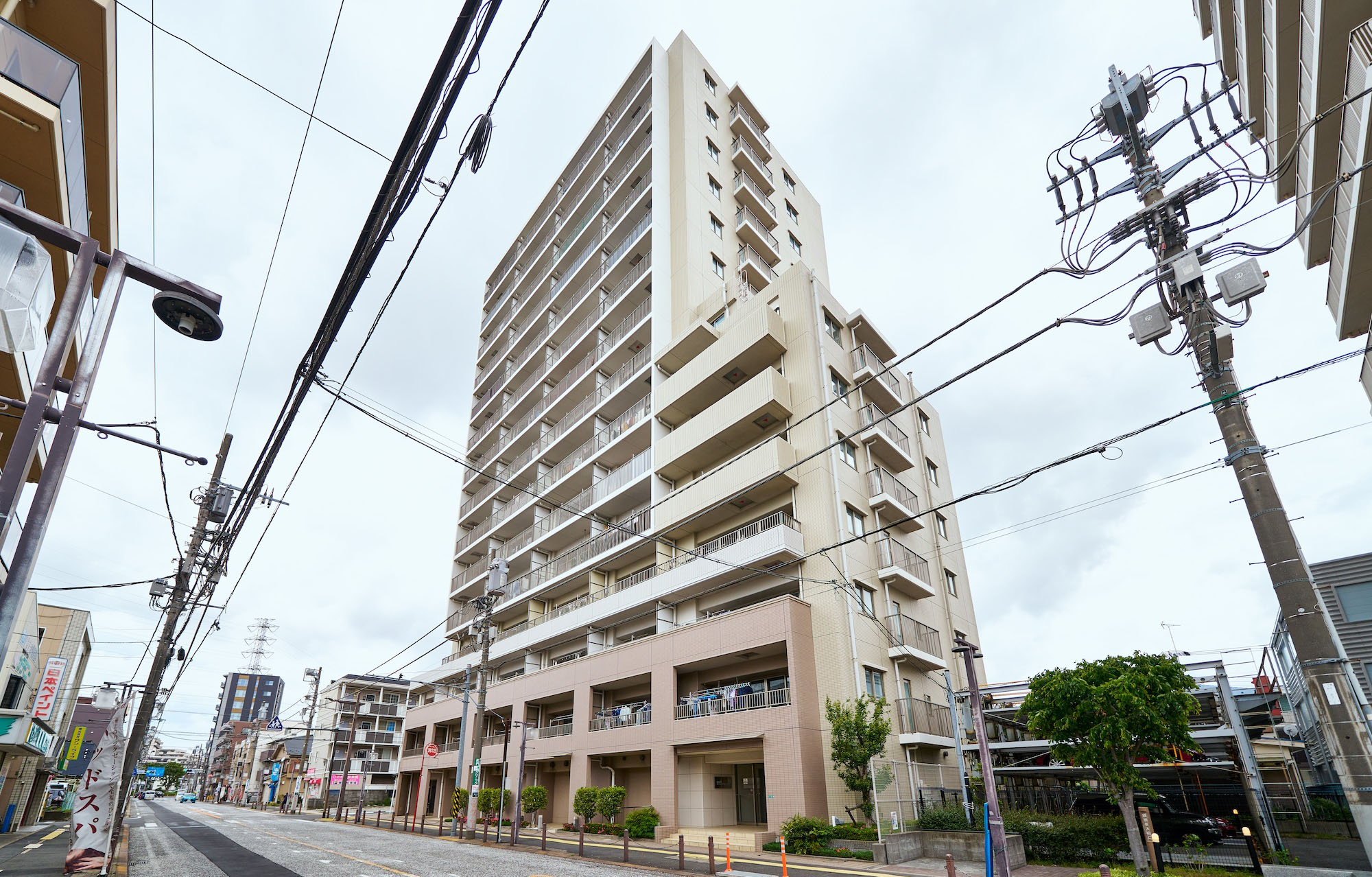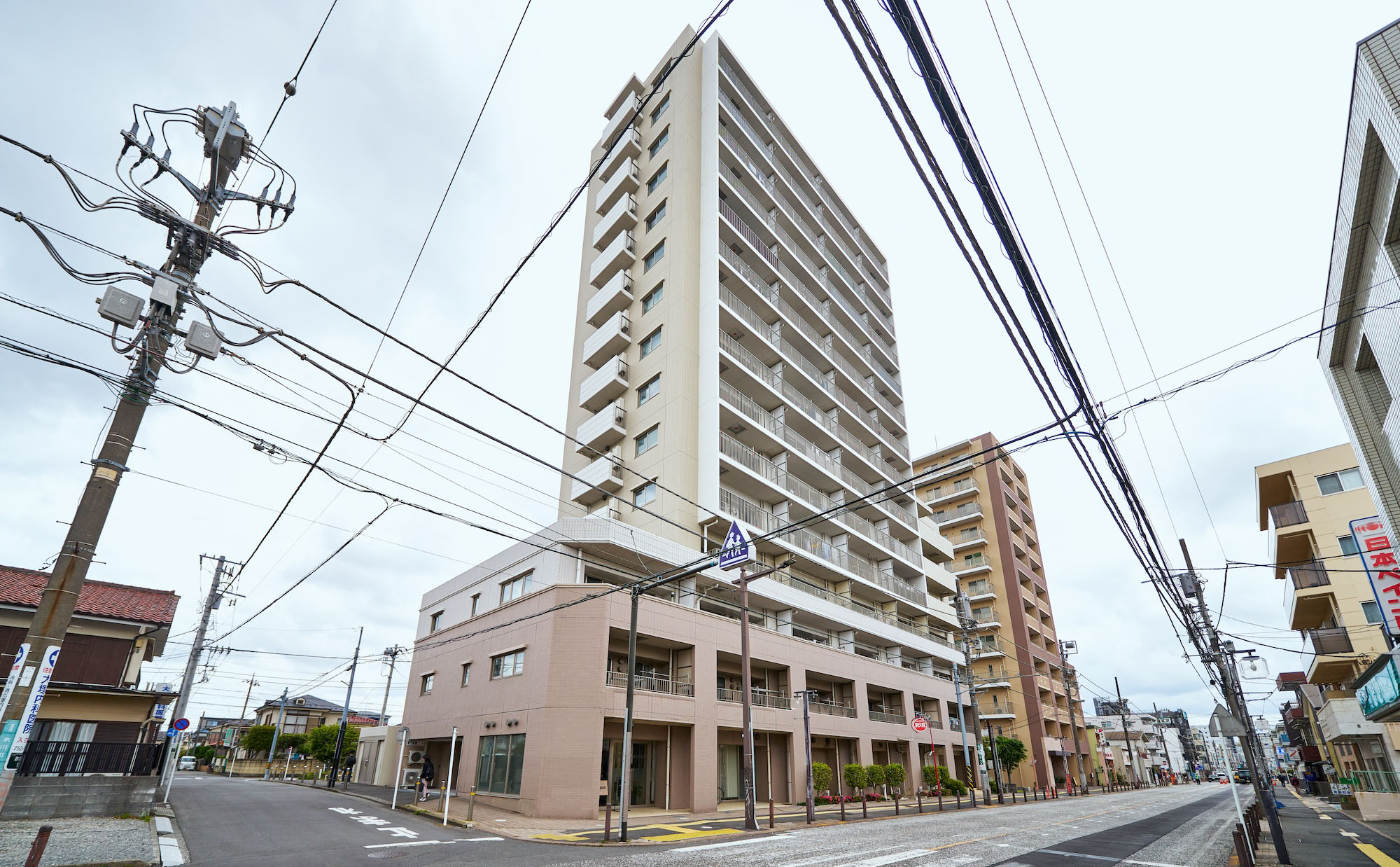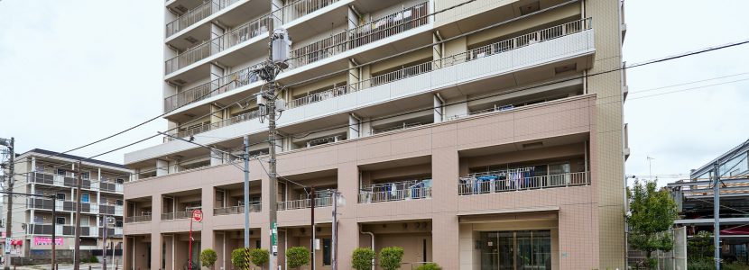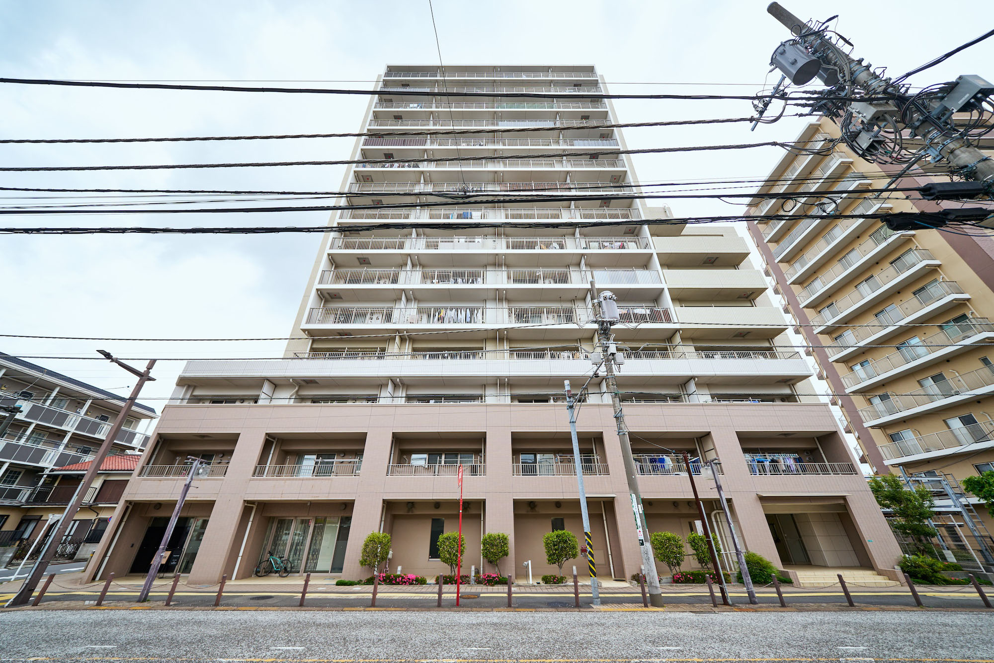 第二種住居地域を背景に佇む地上15階建。外観の色合いは優しい印象のアースカラーとし、周囲を威圧しない優美な印象のフォルムで、落ち着きに満ちた周辺環境と調和しています。グリッドやバルコニーのアルミ縦格子で垂直ラインを強調し、バルコニーのステンカラーなどに都会的なテイストをちりばめ、「ランドマーク」として街並みに映えるレジデンスです。足元の基壇部は、落ち着きあるブラウンタイルを採用。堂々とした安定感と品格を演出し、タイルを3色に貼り分けることで、表情の豊かさとデザインの美しさを実現しています。