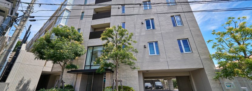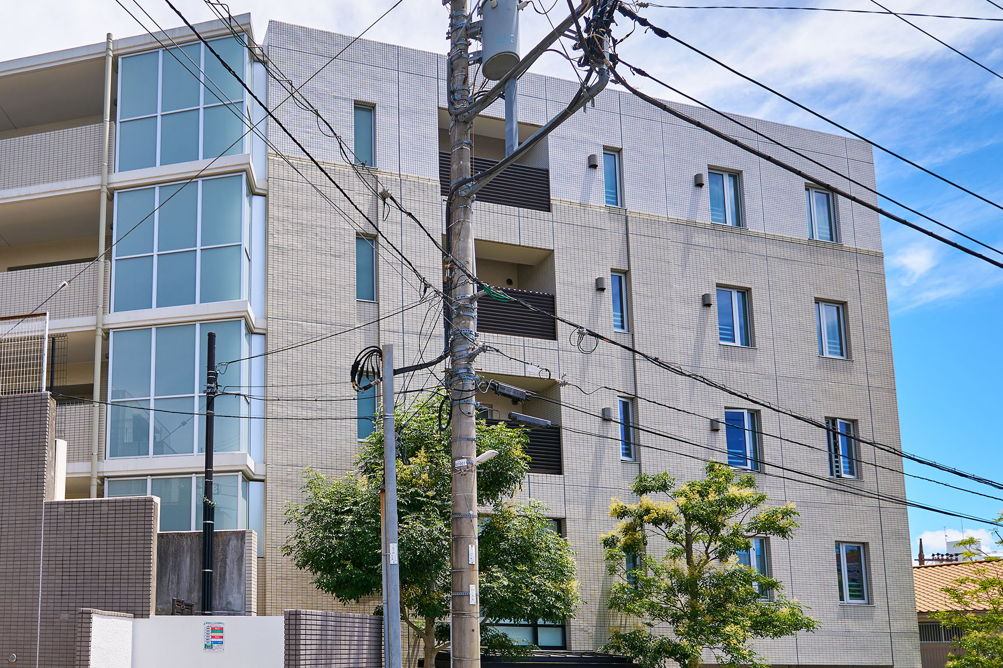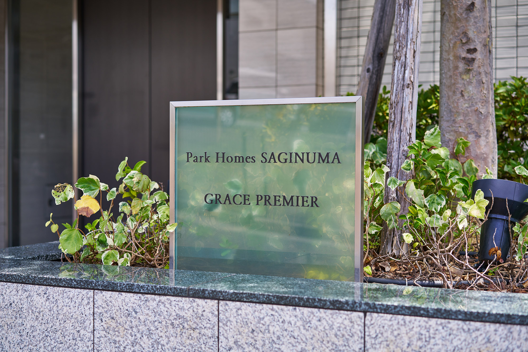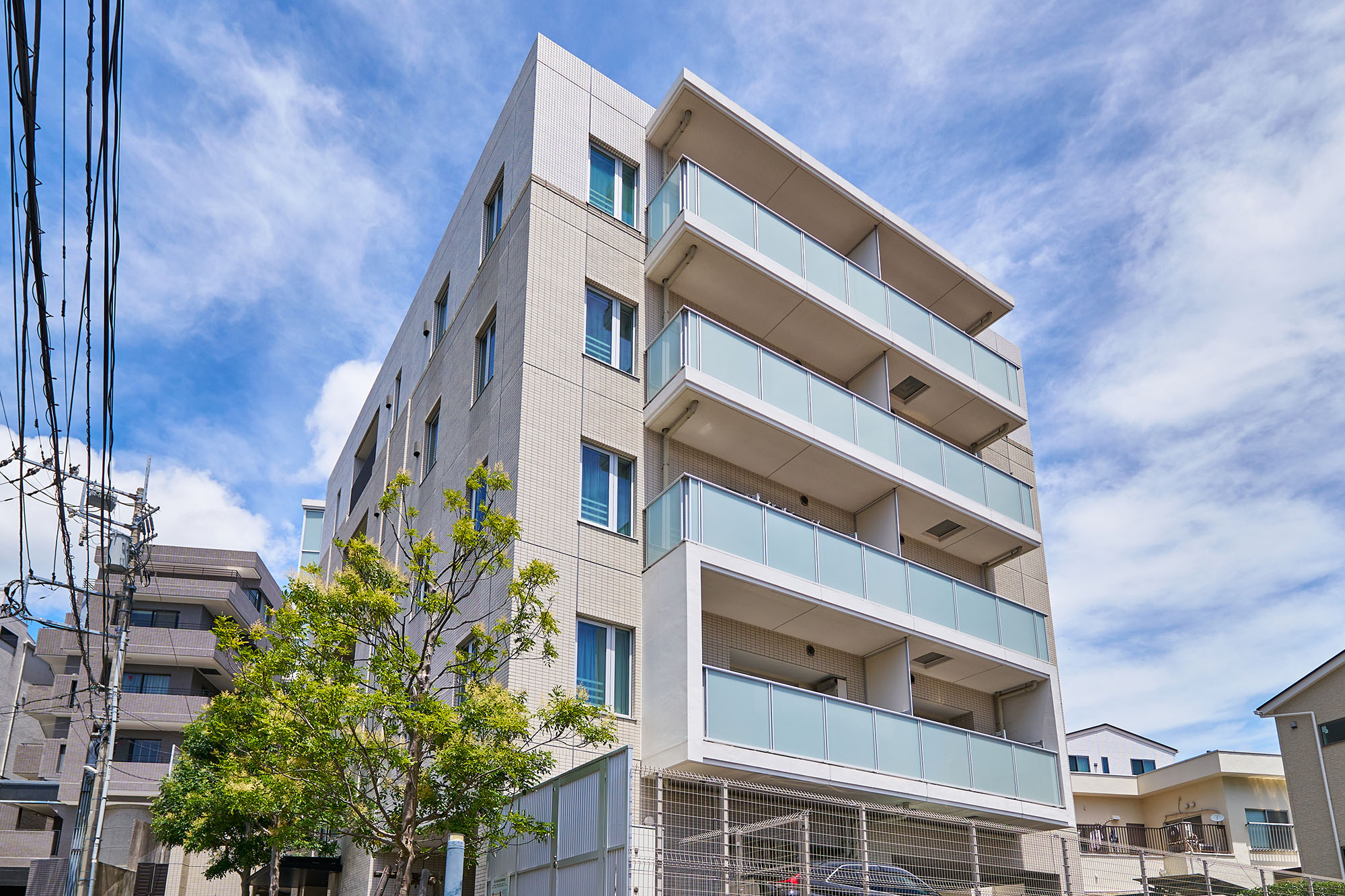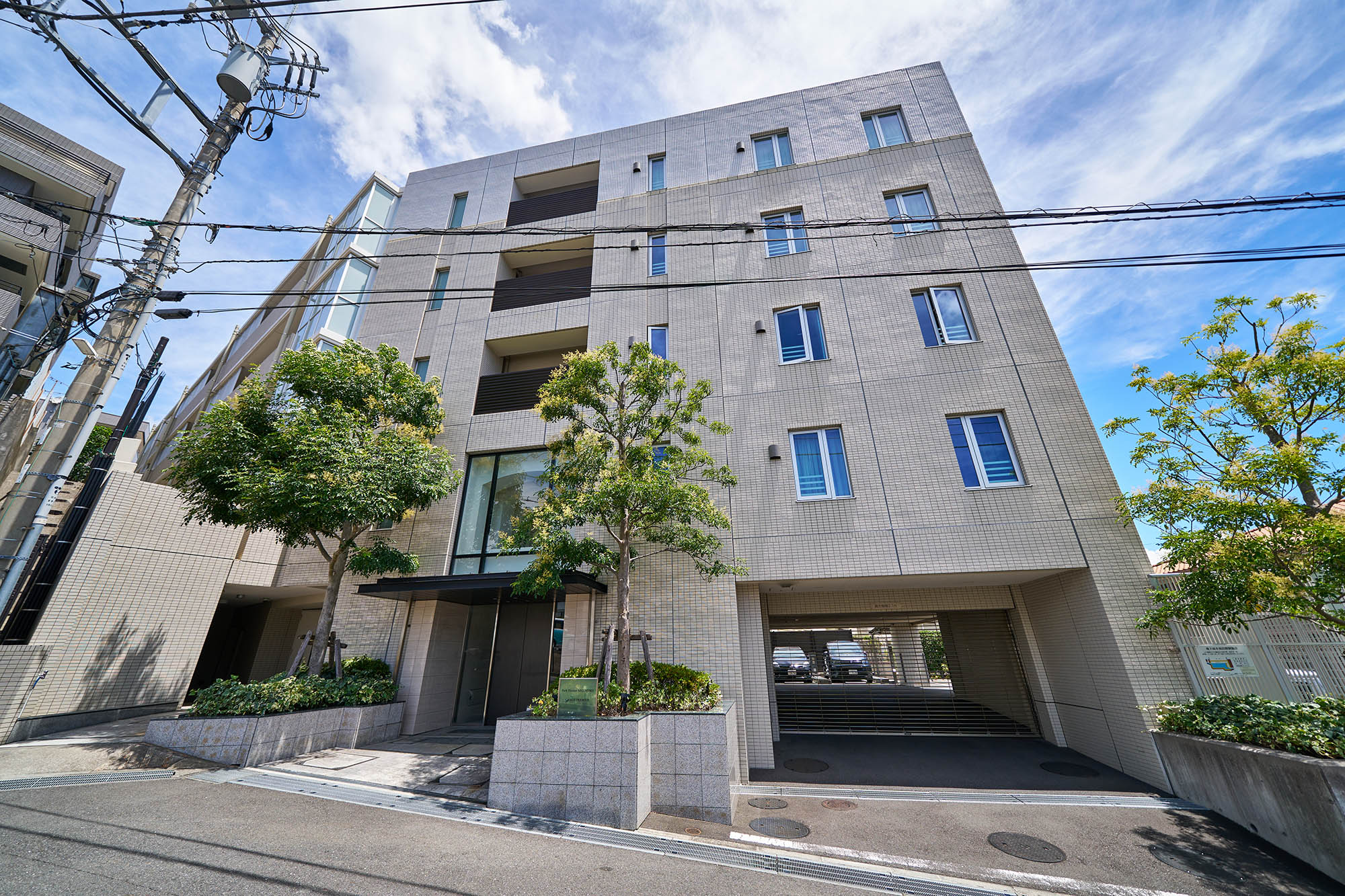 外壁には、重厚な質感ながら、あたたかみのあるベージュ系のタイルを採用。直線を強調したフォルムとガラス素材で、シャープな印象を描き出しています。エントランス上部のガラスは、日中は空を映し、夜には外へ灯りを届けるシンボリックなアクセント。住まう人を温もりで迎え、同時に誇りをもたらしています。周囲と調和しながらも、どこか一線を画すフォーマルな表情は、街並みに品格を醸成しながら、住まう人の洗練された暮らしを物語っています。
